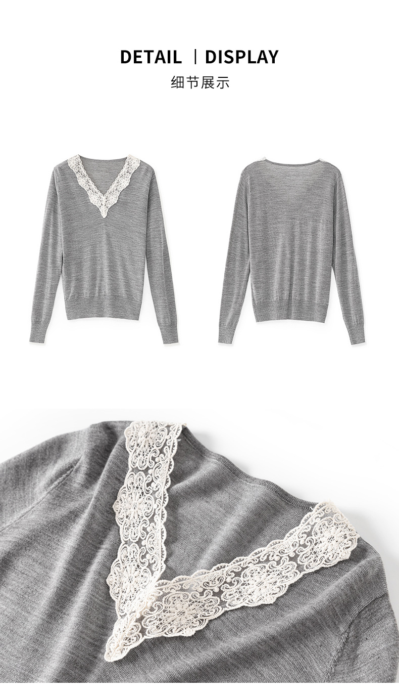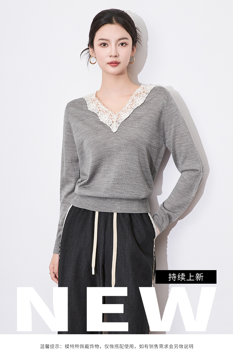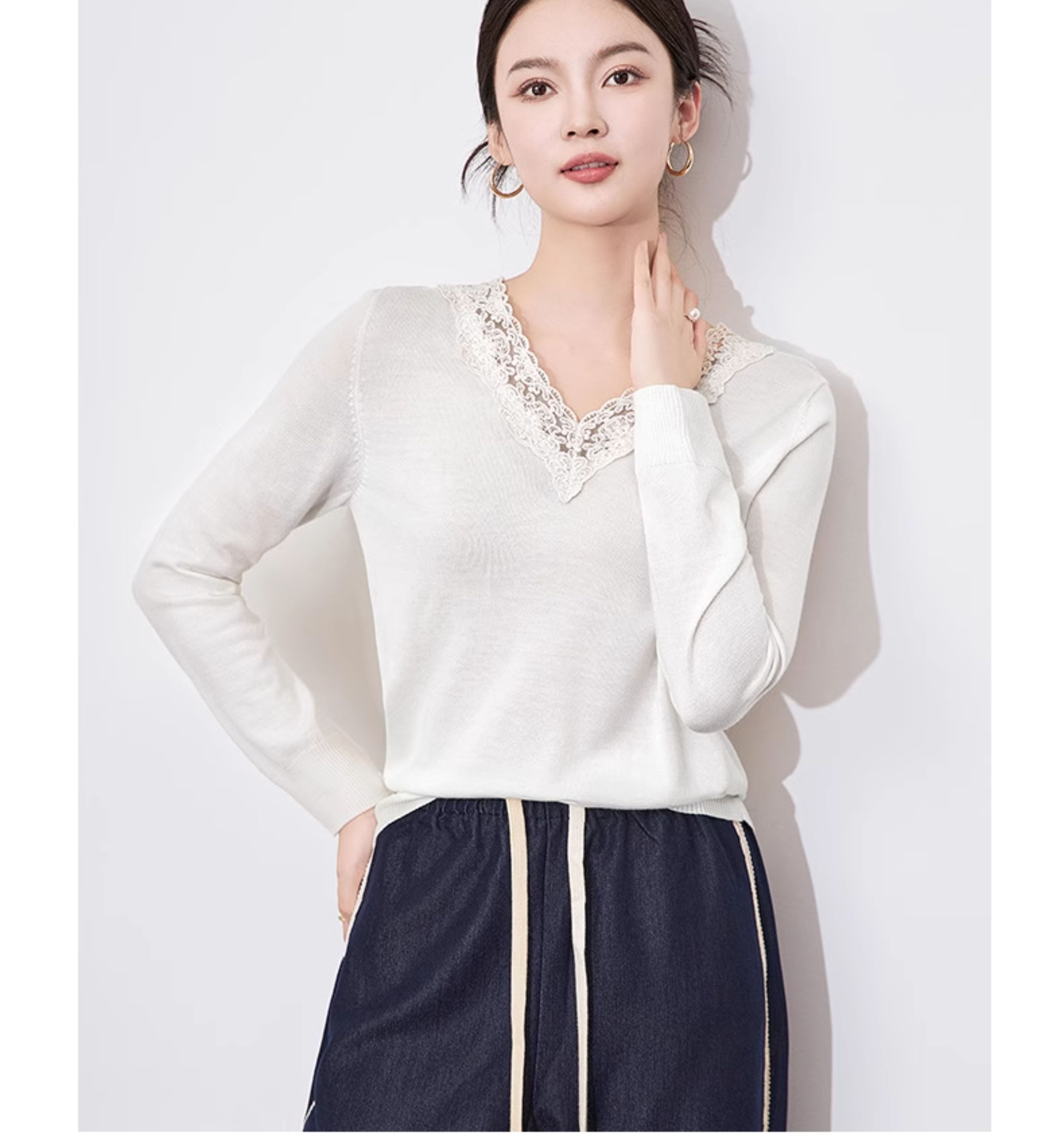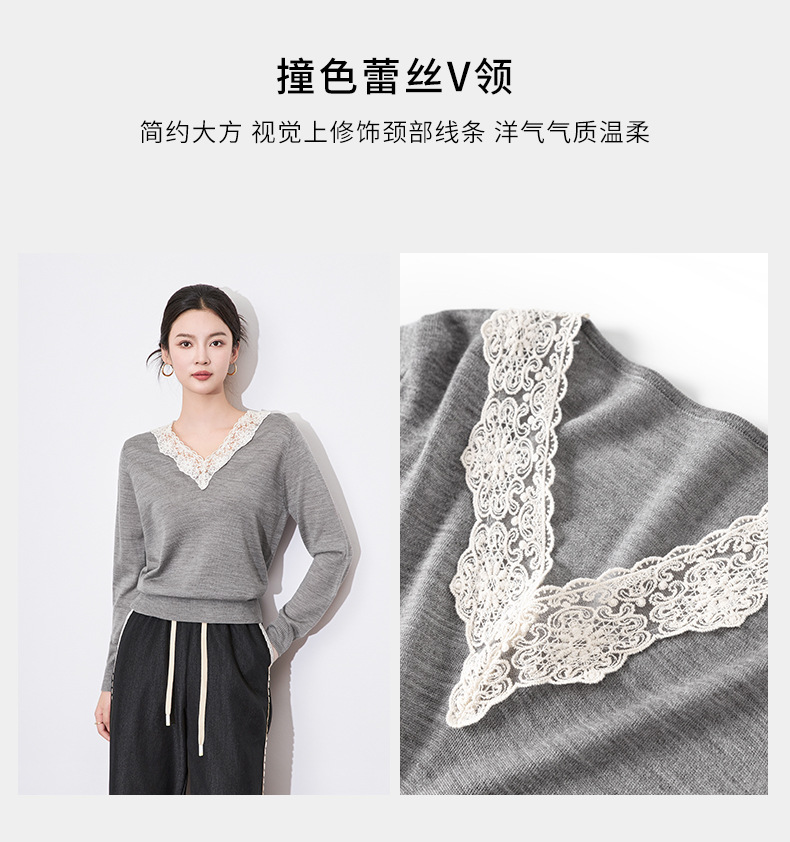 【高货wl】全新升级【铂金会员165/天猫219/差价54】(11430) 洛诗琳春秋法式高级感蕾丝花边拼接V领软糯羊毛针织上衣