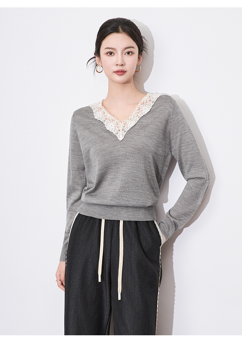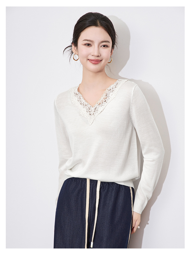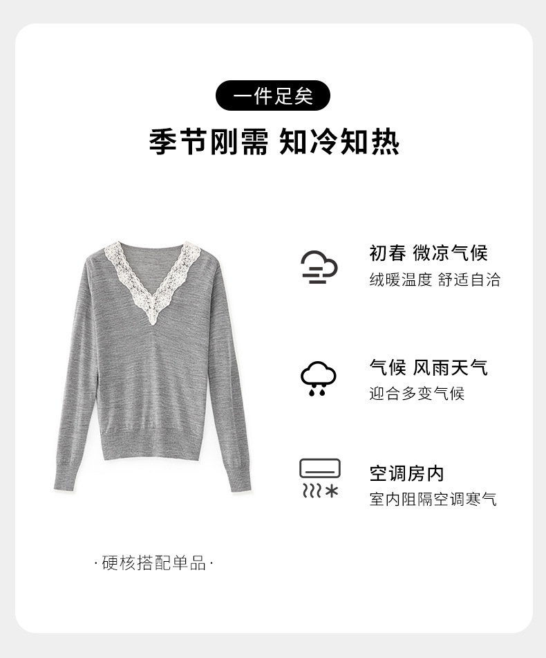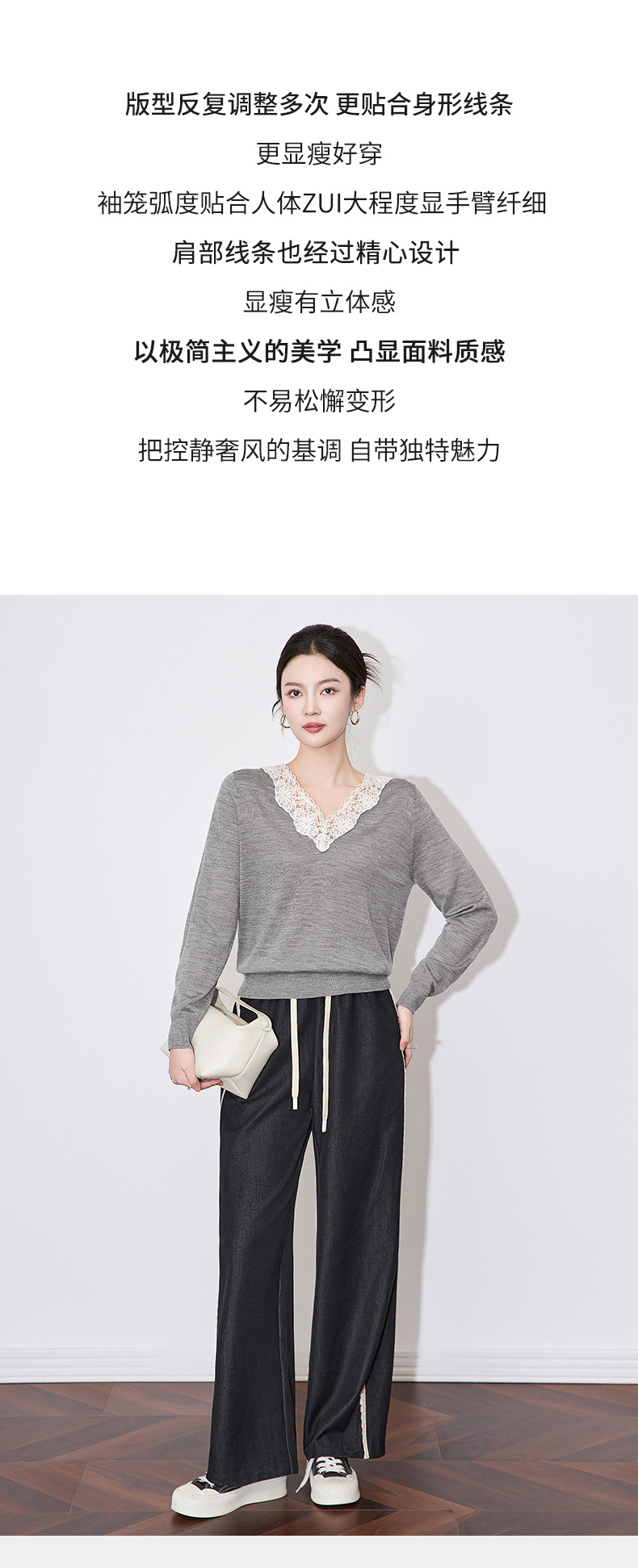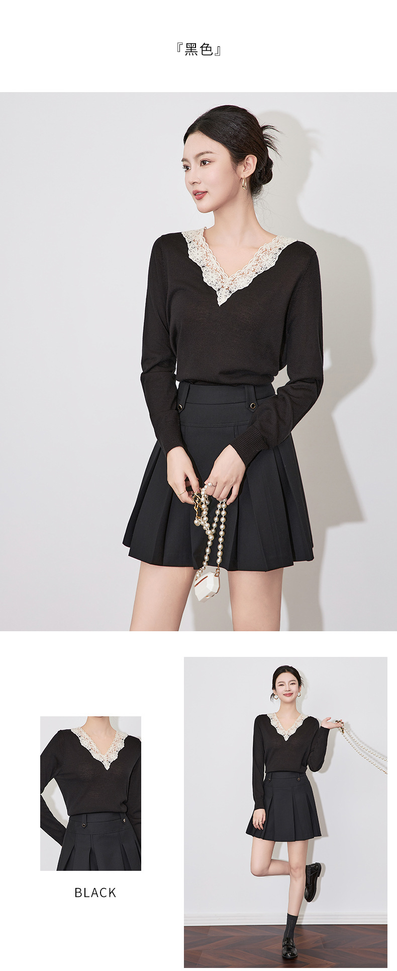 【高货wl】全新升级【铂金会员165/天猫219/差价54】(11430) 洛诗琳春秋法式高级感蕾丝花边拼接V领软糯羊毛针织上衣