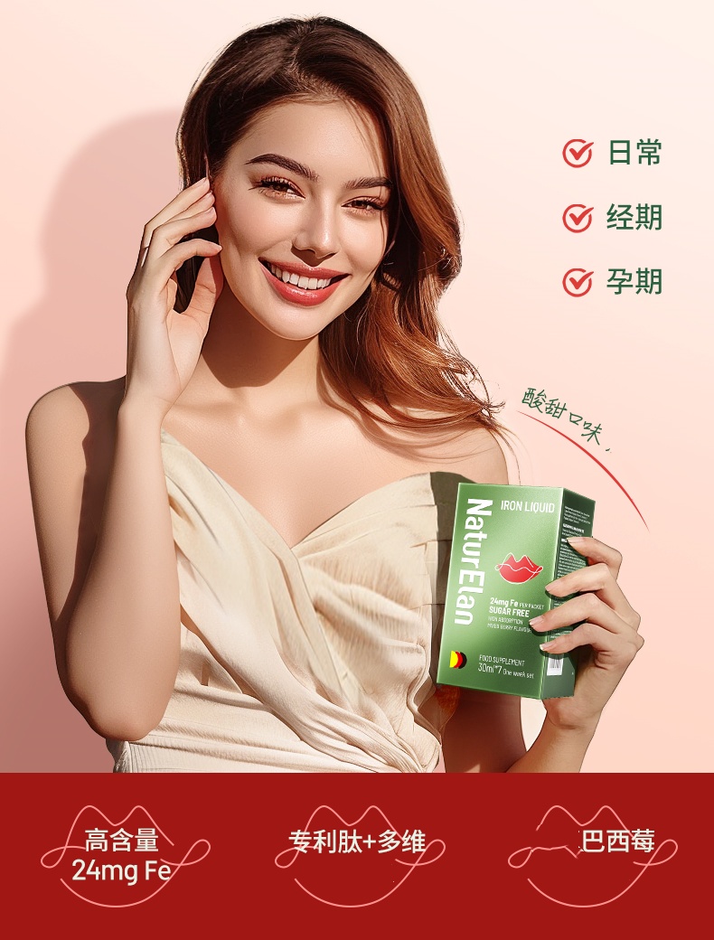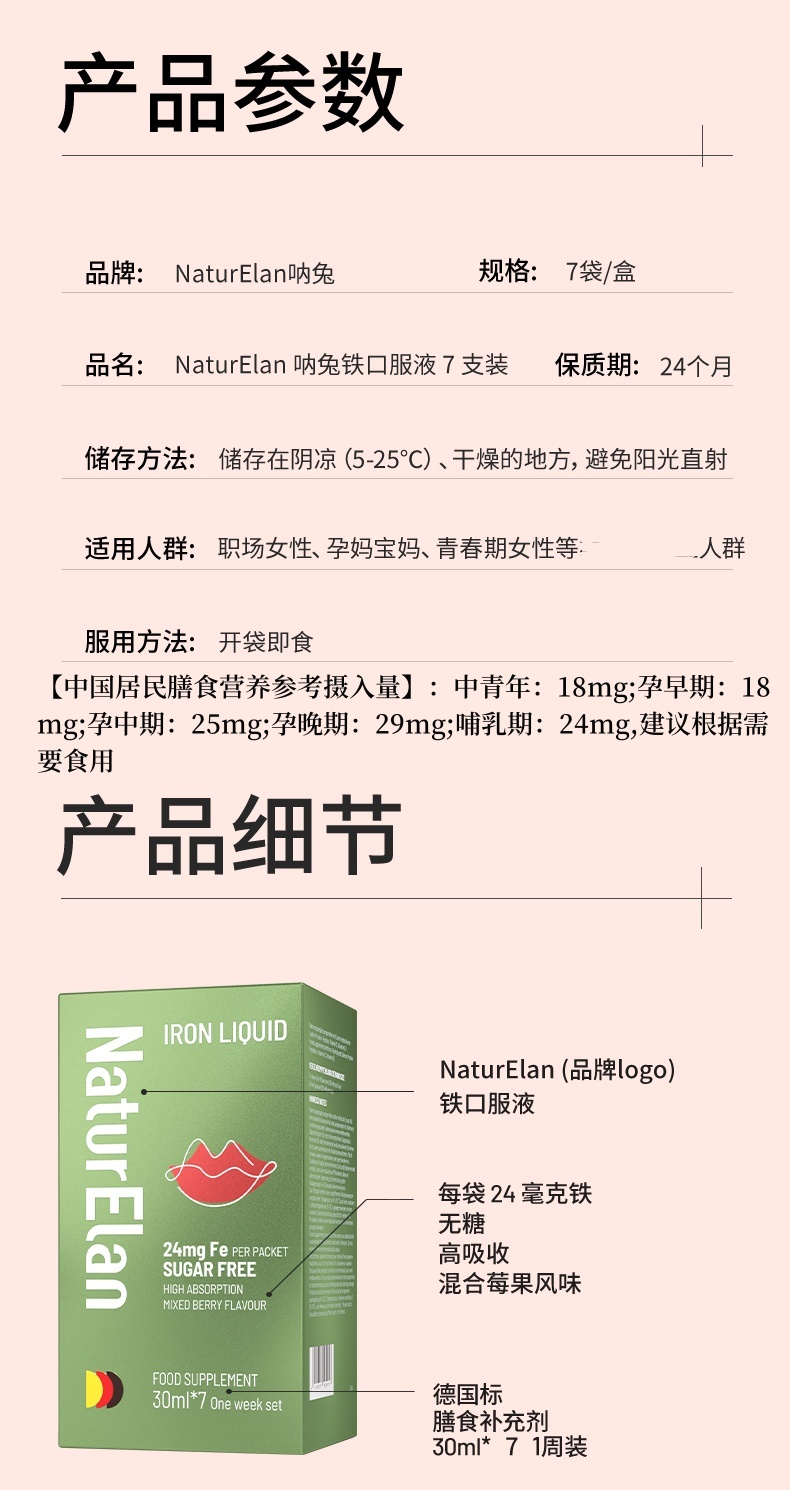 【跨境】德国NaturElan 呐兔 铁口服液 7支1盒 红唇女性(买多盒赠金标叶黄素软糖8粒或维C泡腾片)