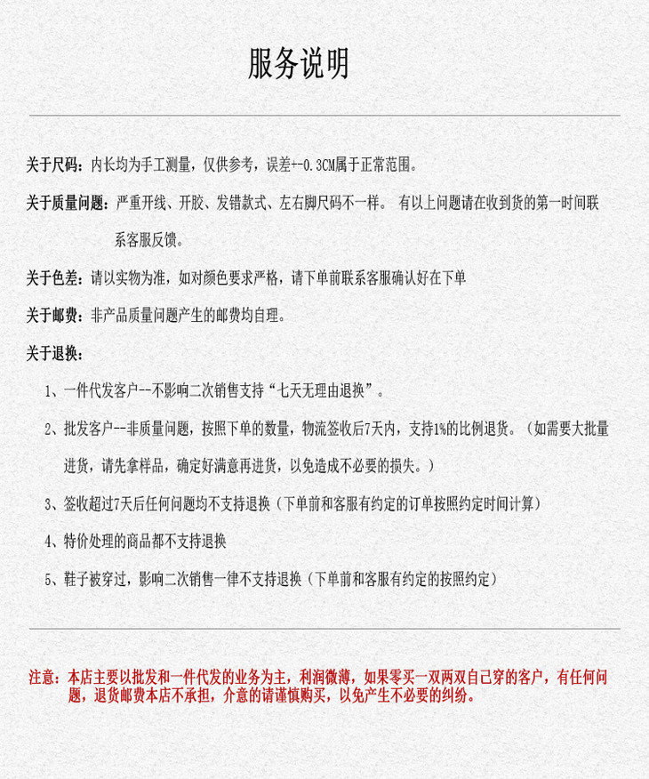 【关于售后】不影响二次销售的情况下,支持七尺码表(建议按照脚长+1cm左右选择内长)