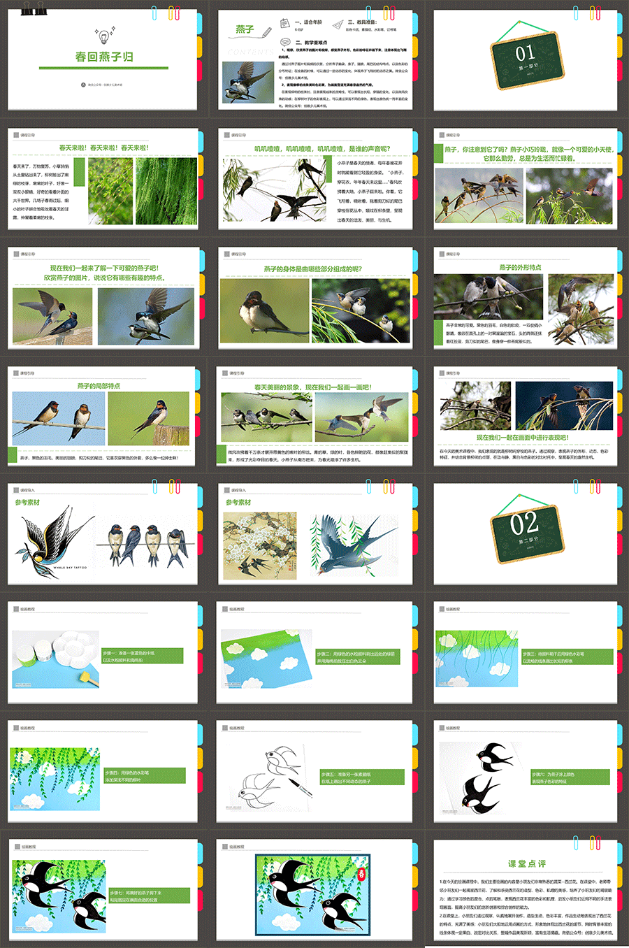 通过对燕子图片和视频的欣赏,分析燕子脑袋、身子、翅膀、尾巴的结构特点,以及色彩的分布特征;在绘画的时候,可以通过一定动态的变化,体现燕子飞翔时的动态之美。