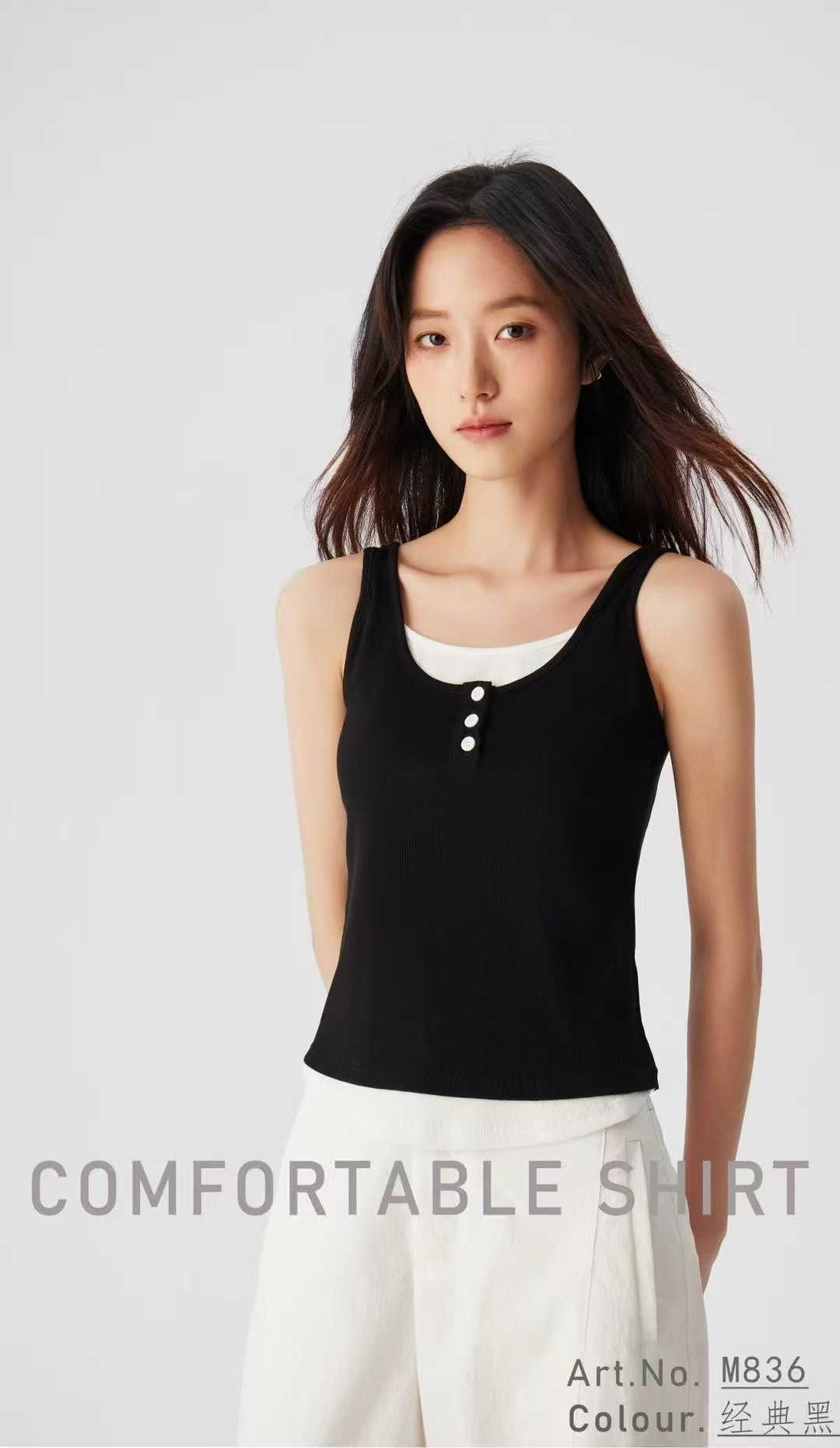 【品名】LS竹纤维女士时尚拼色背心836【成分】46.4%再生纤维素纤维(竹桨纤维)45.5%棉8.1%氨纶