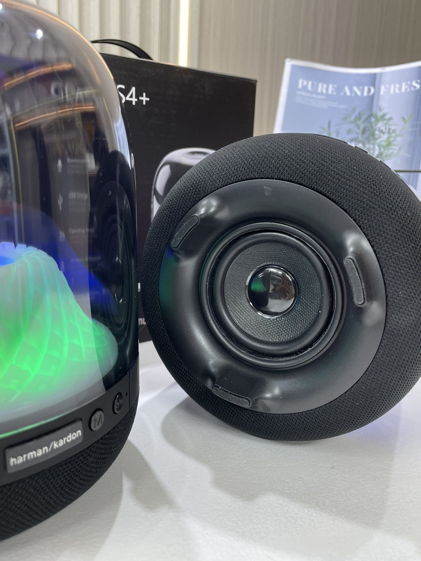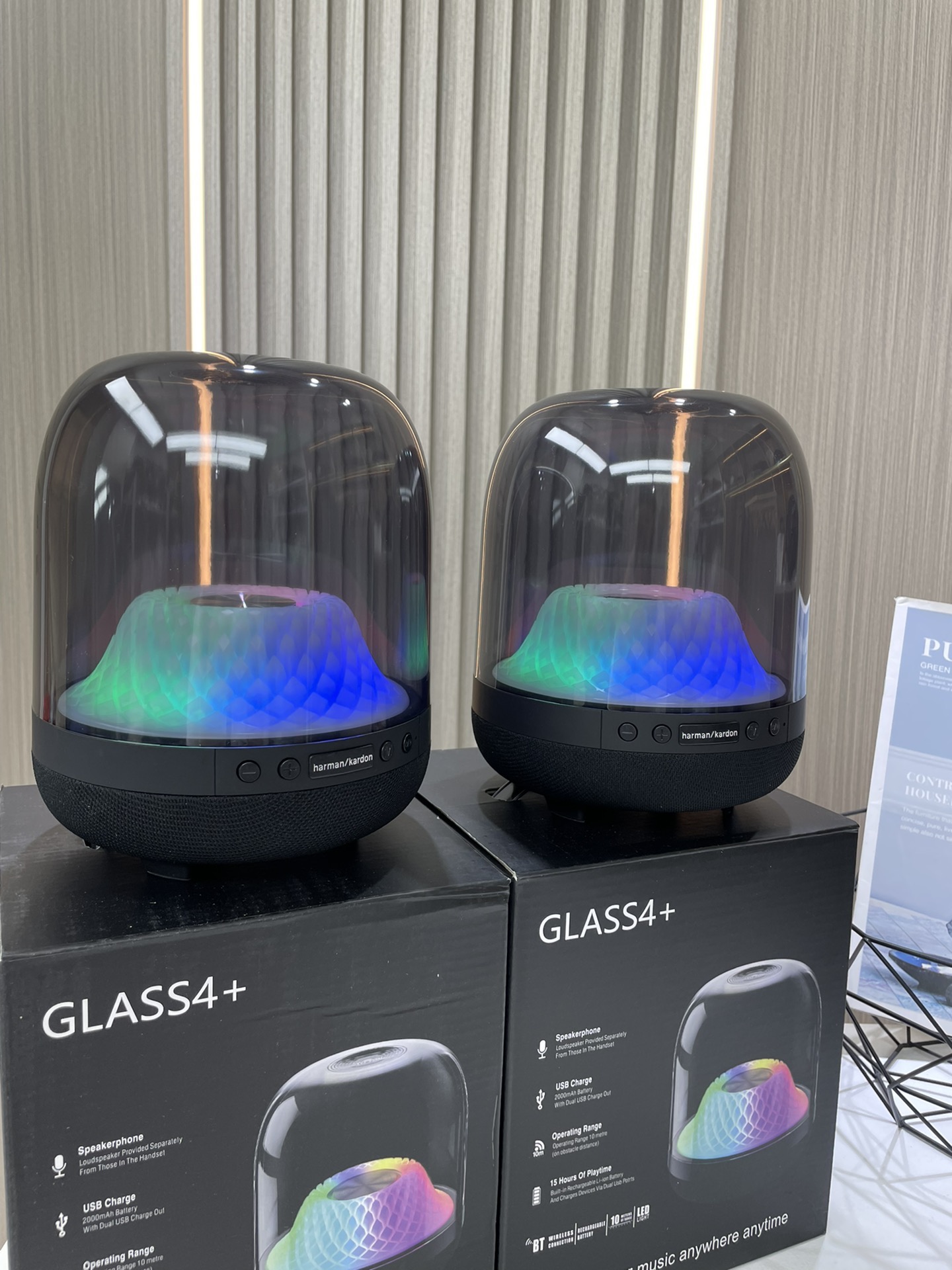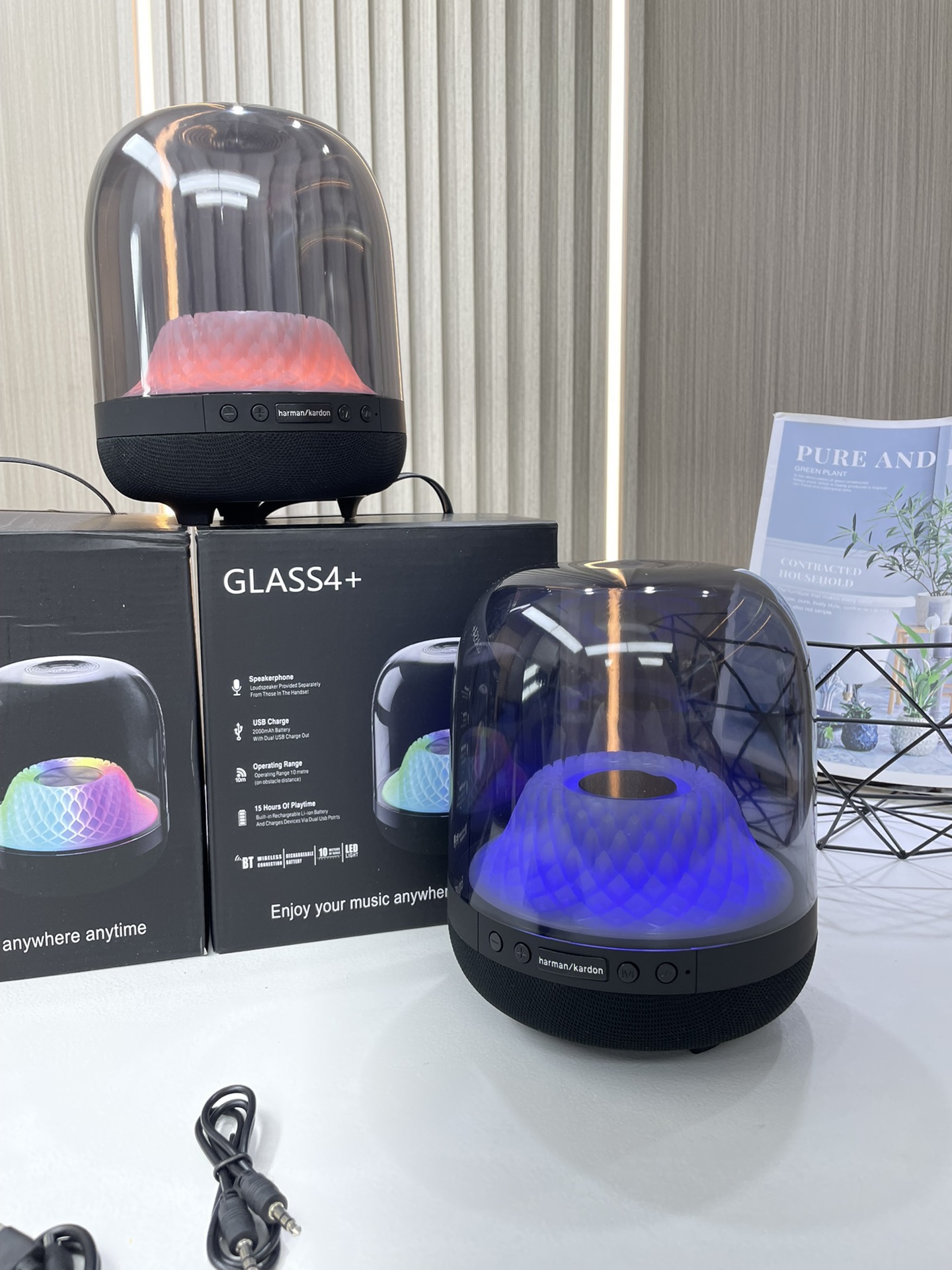 外贸跨境出口,震撼音质,让邻居崩溃的超强重低音。躺在家里感受Club的感觉,第四代延续经典琉璃系列标志性外观,可调节多效水波纹呼吸灯效,360度环绕哈曼声效,下沉式低音炮,高功率扬声器 100W低音单元,低音下潜45Hz,极限震撼!