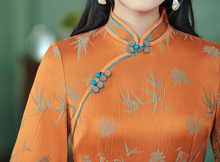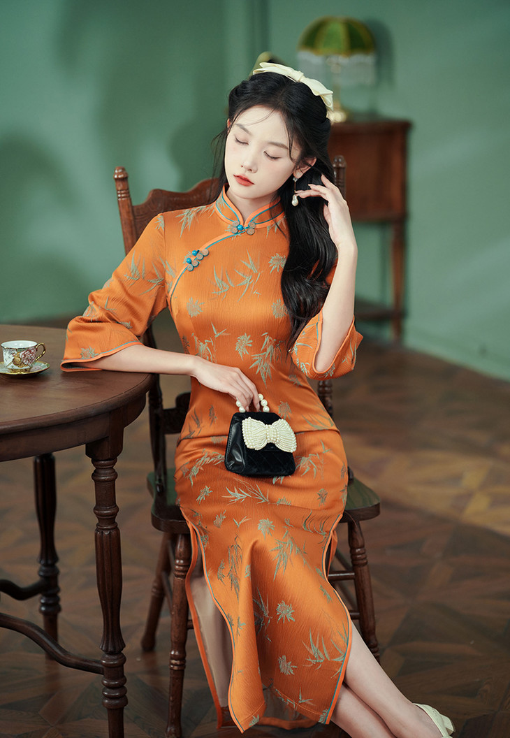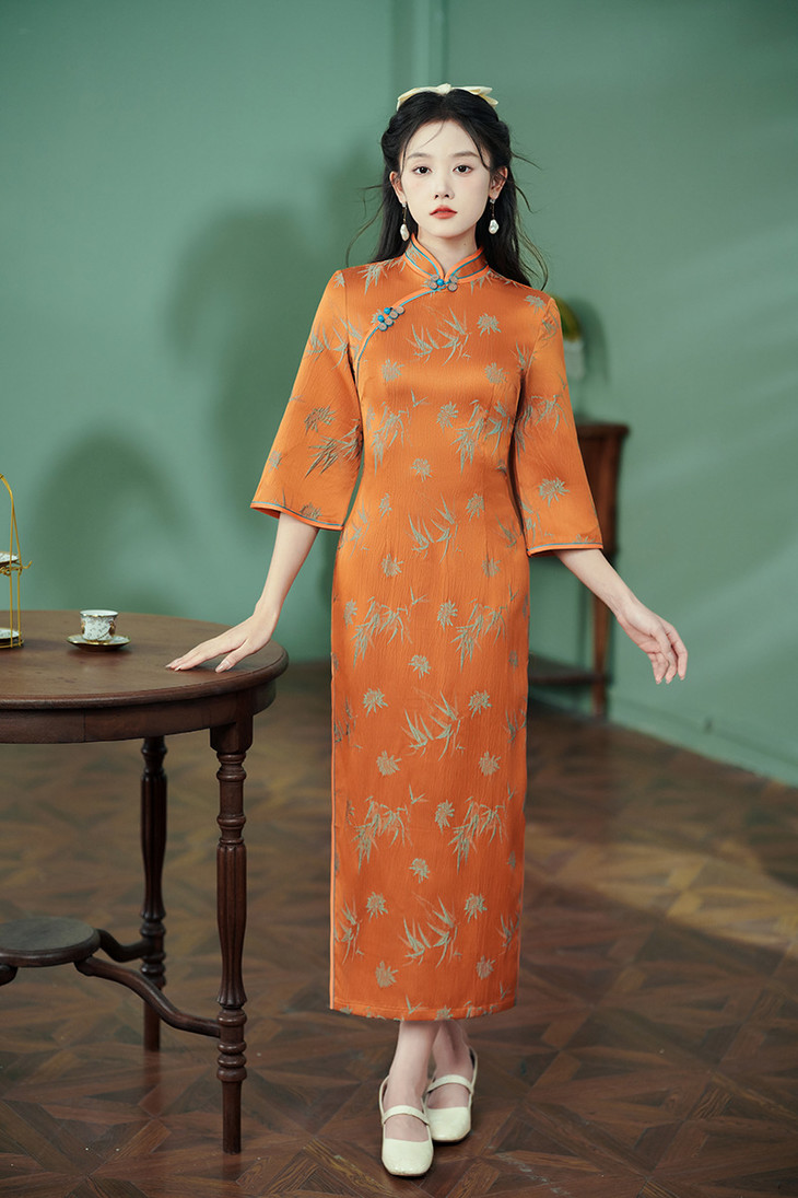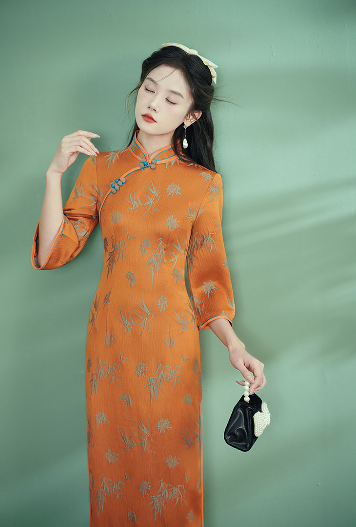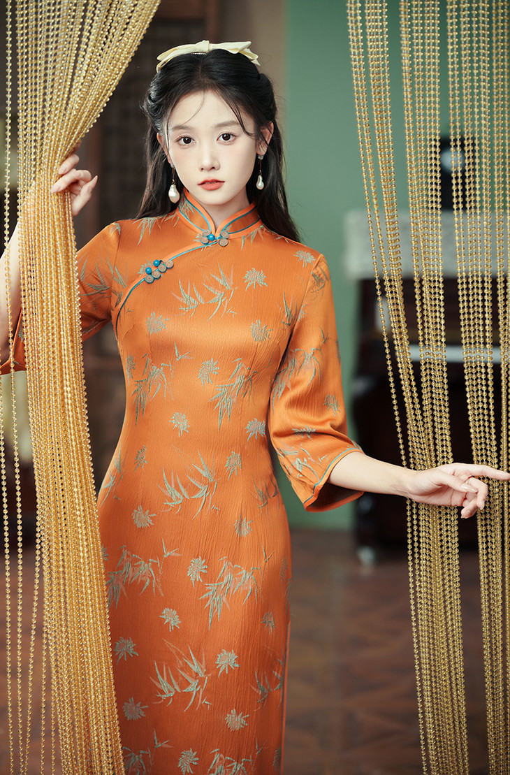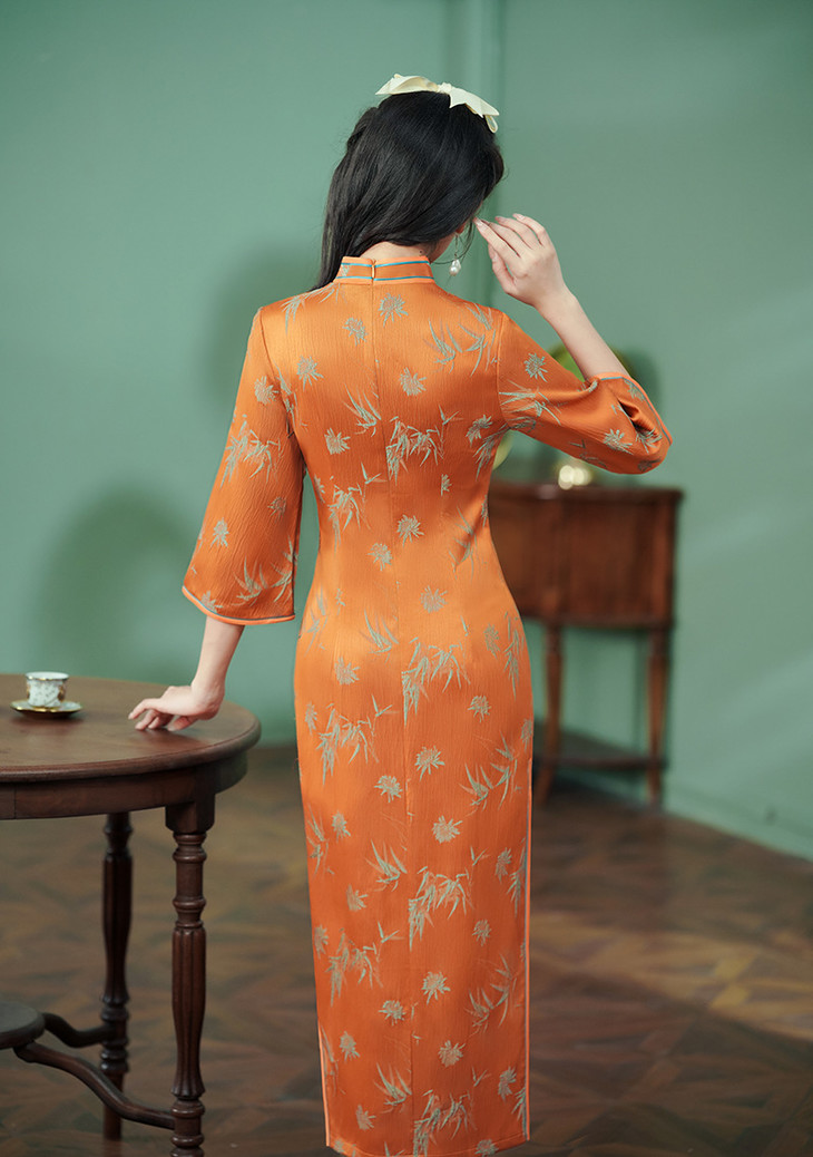 改良日风修身,提花丝绸橙色旗袍XL1138