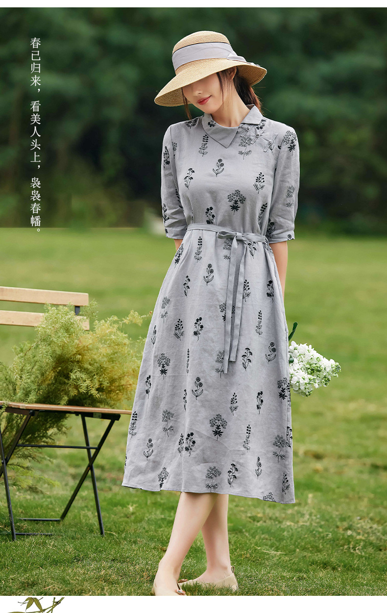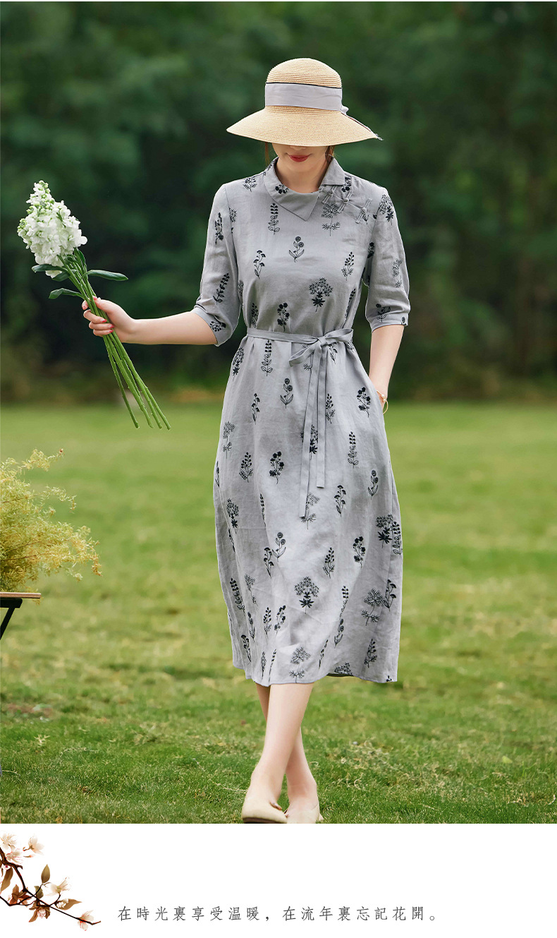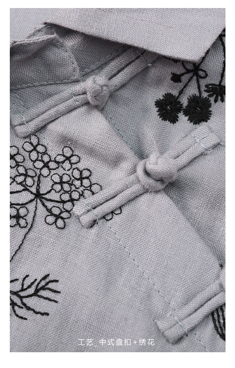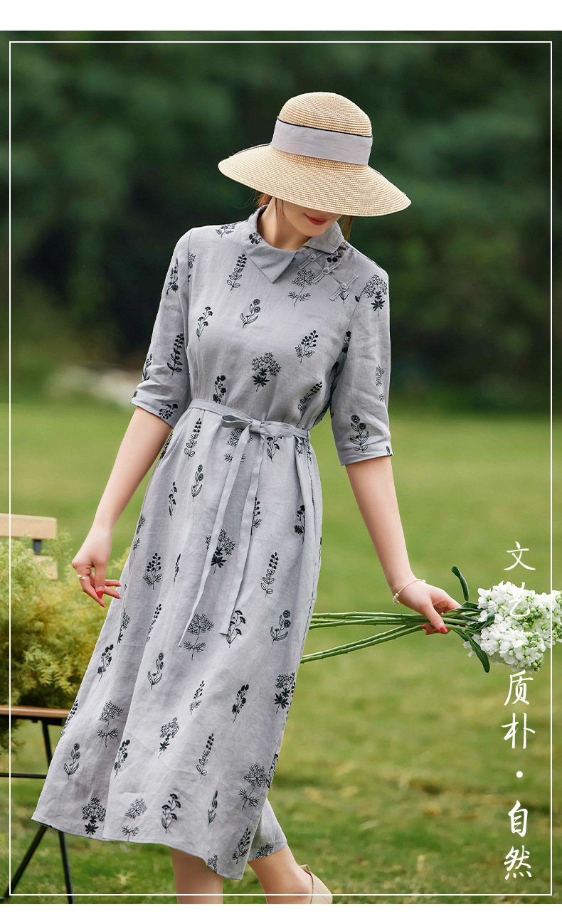 文艺绣花亚麻连衣裙,纯色翻领中国风盘扣长裙YM-S363