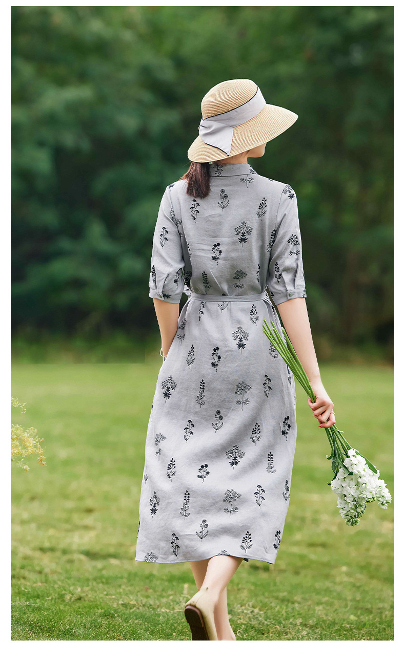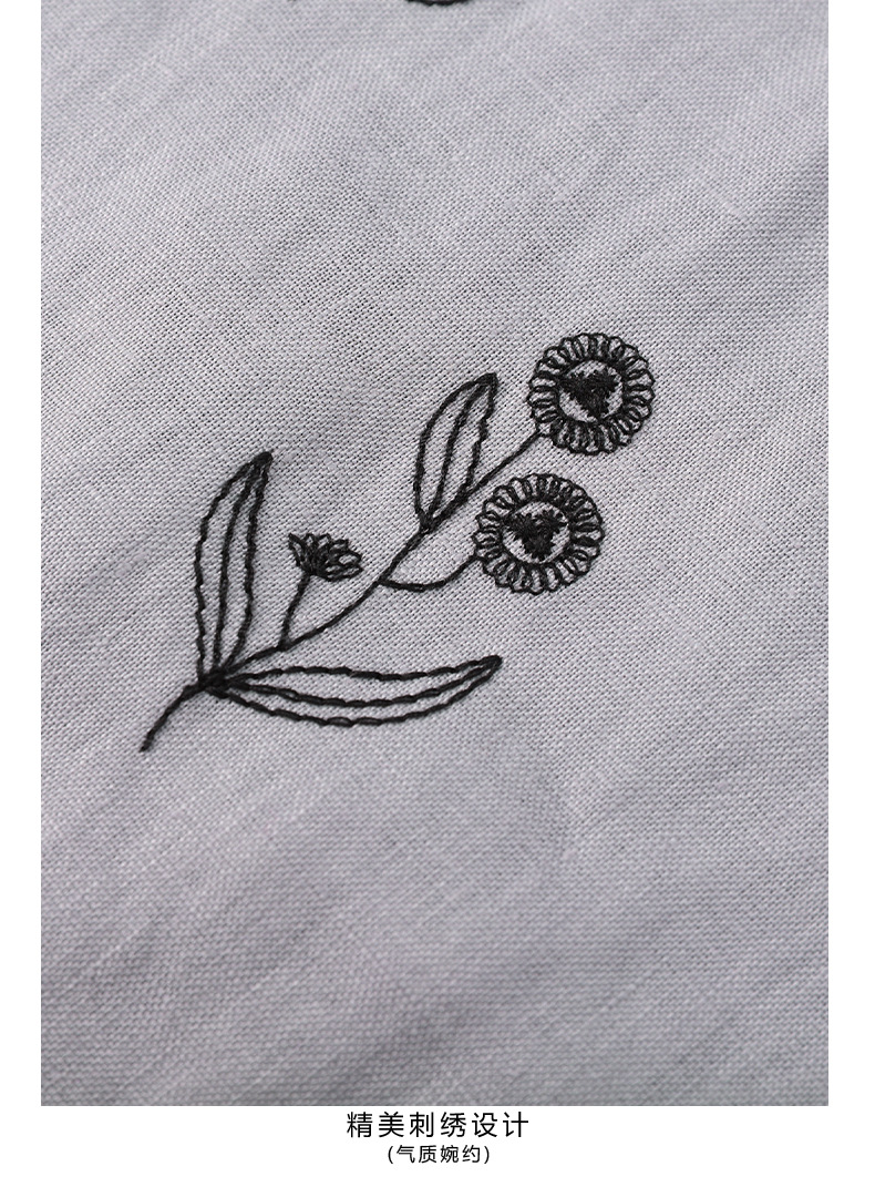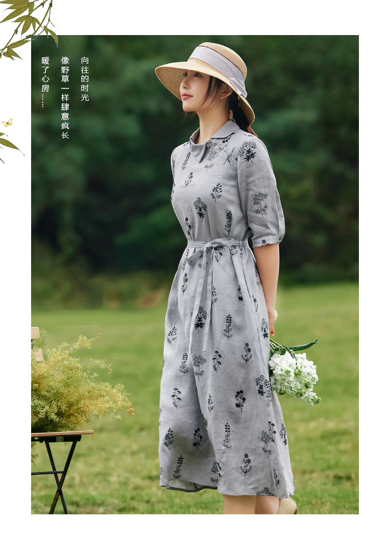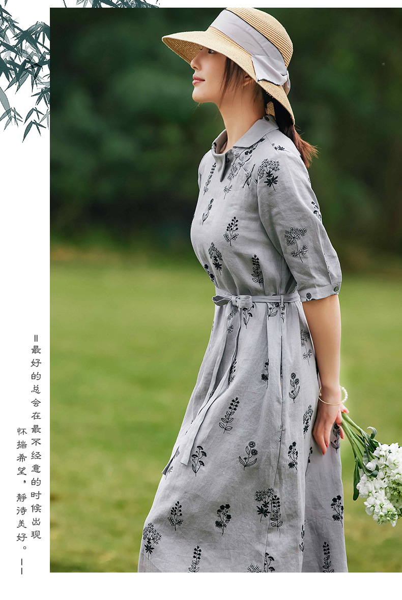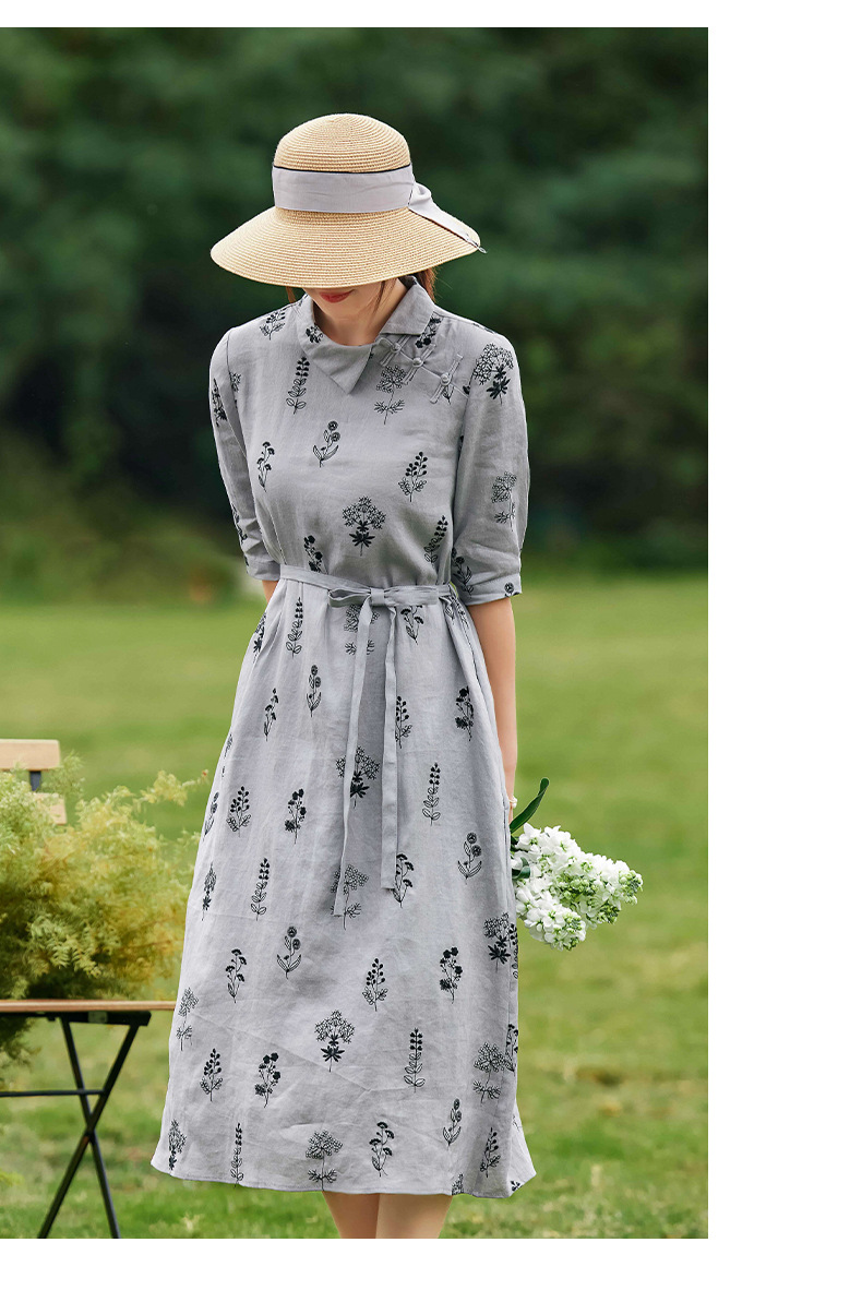 文艺绣花亚麻连衣裙,纯色翻领中国风盘扣长裙YM-S363