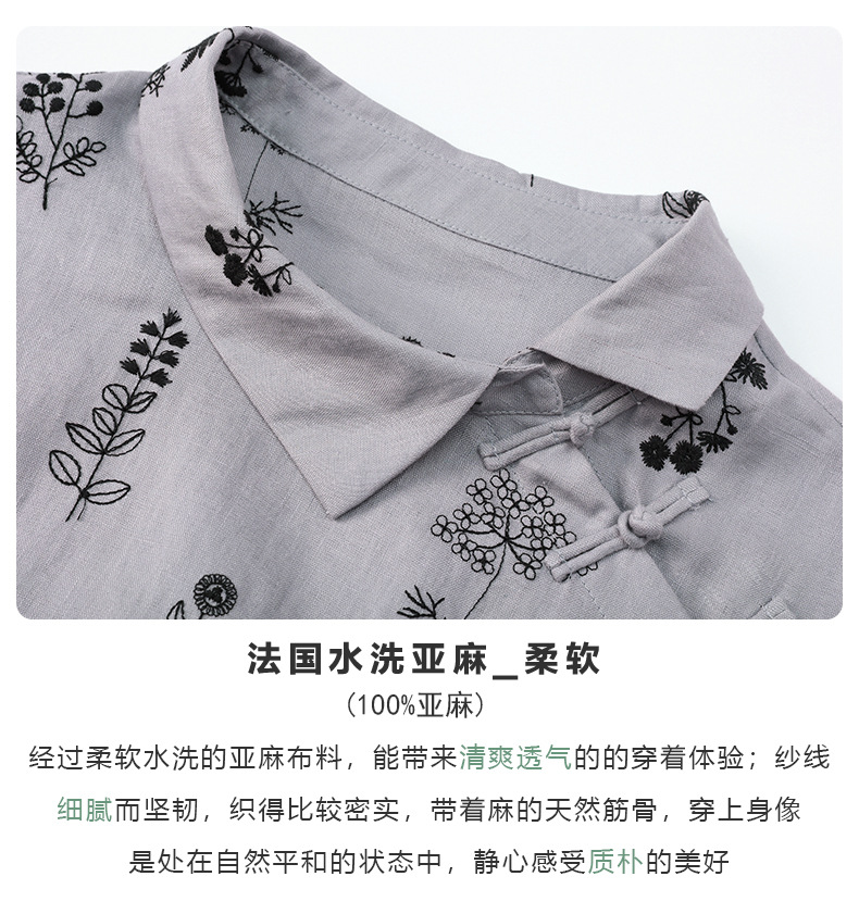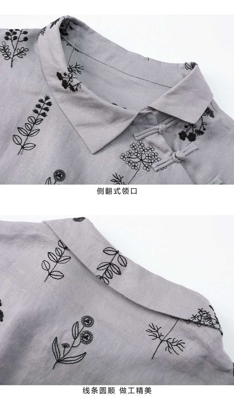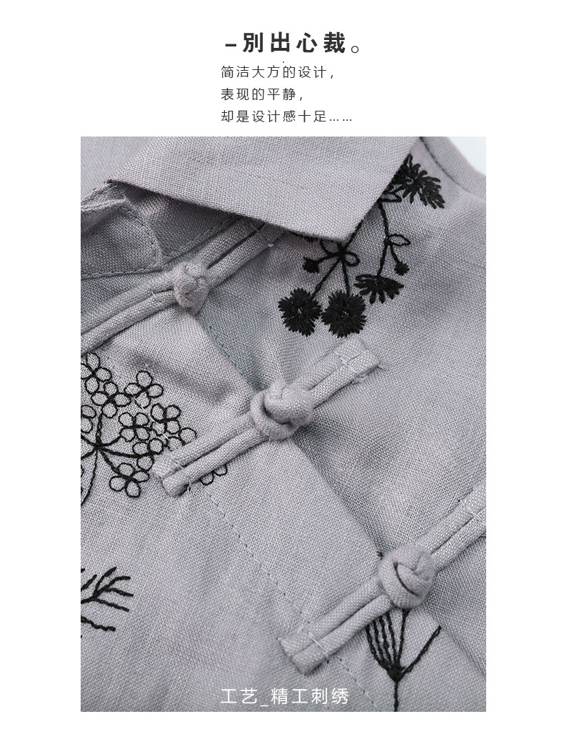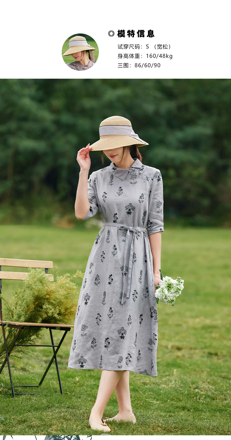 文艺绣花亚麻连衣裙,纯色翻领中国风盘扣长裙YM-S363
