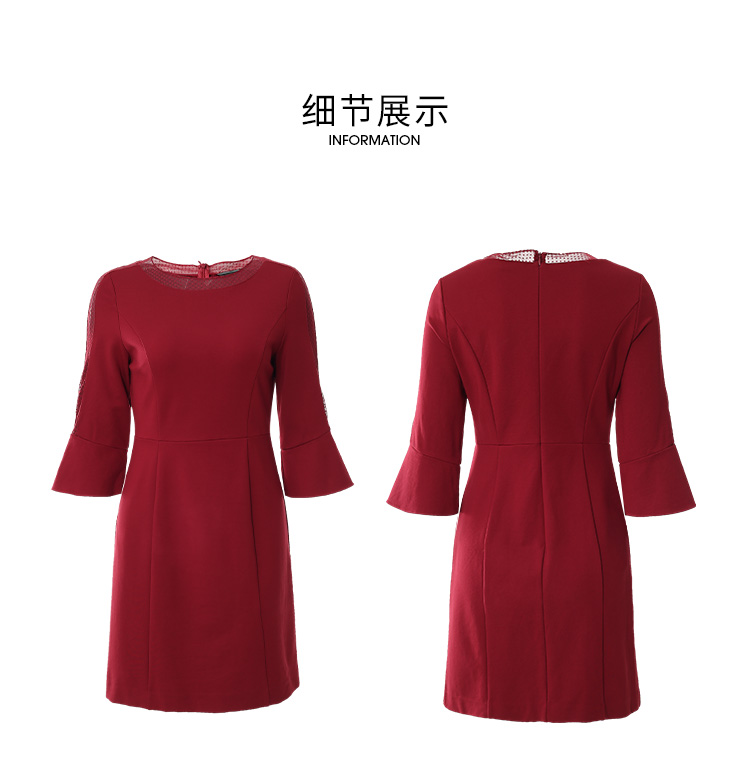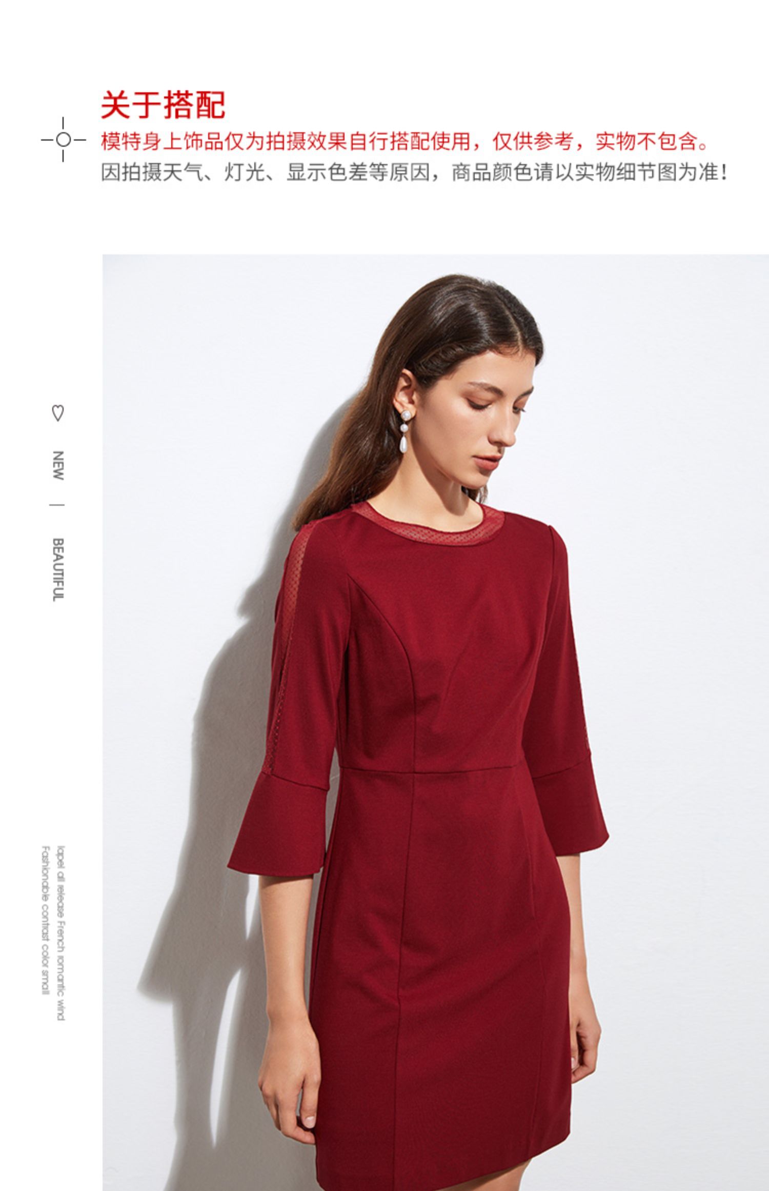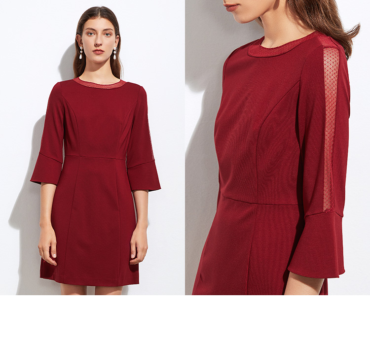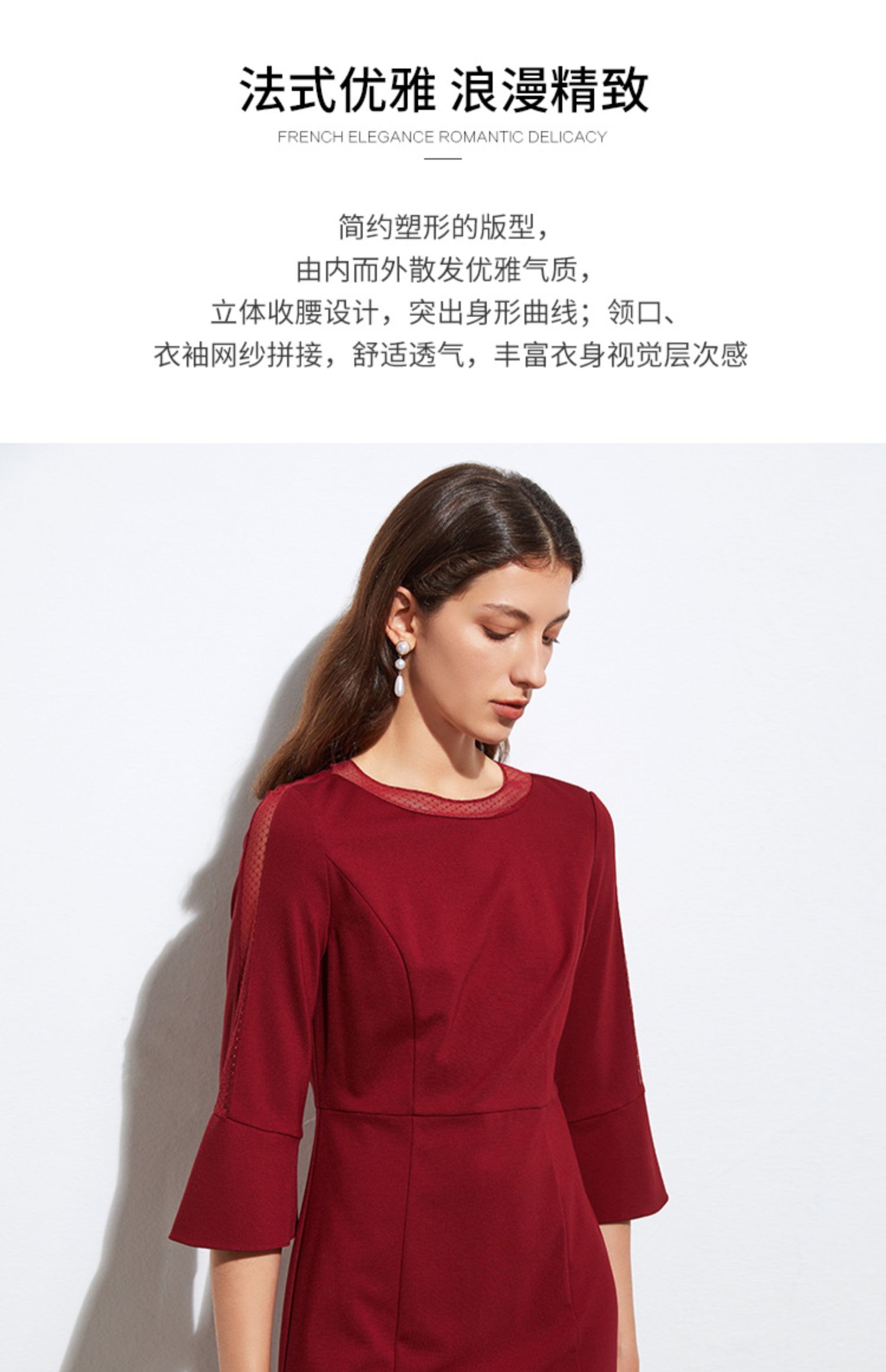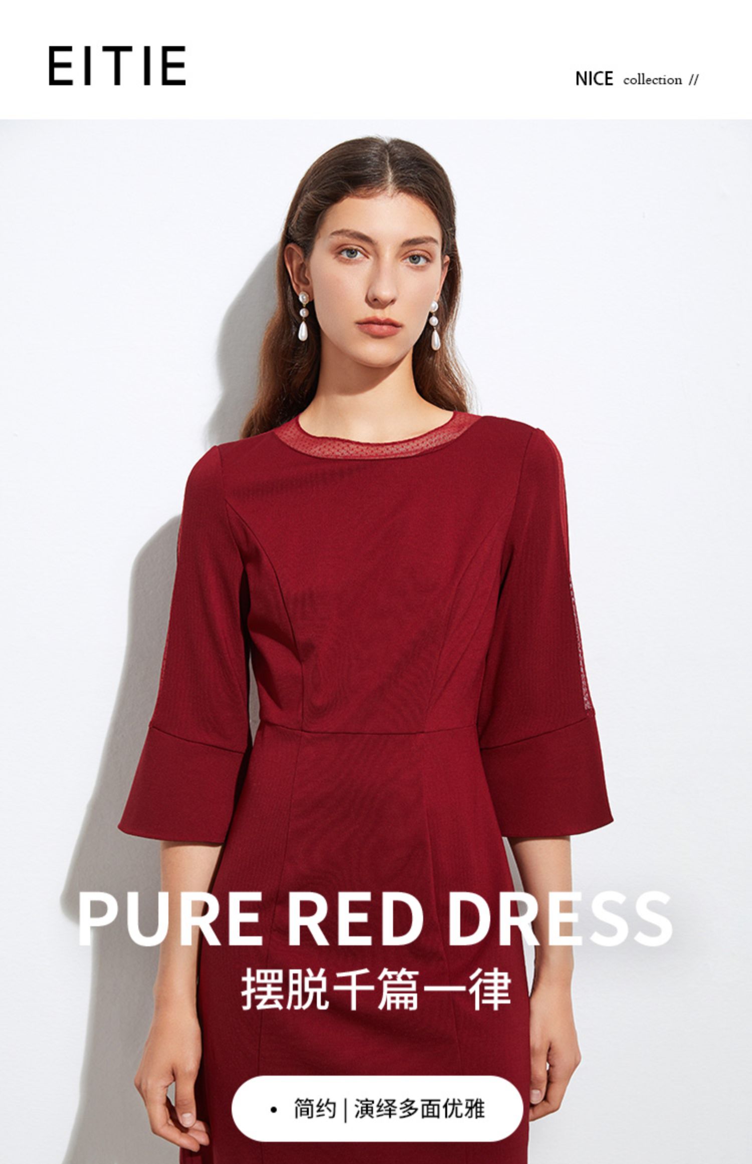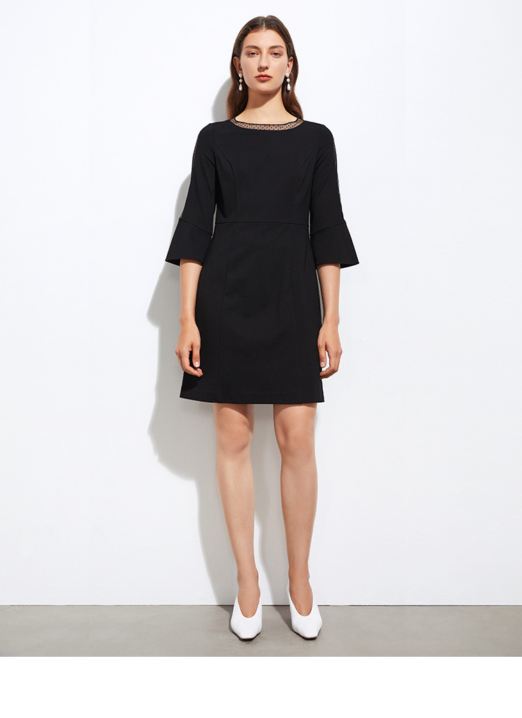 EITIE爱特爱秋季新款时尚圆领收腰A版显瘦喇叭七分袖连衣裙A2107713