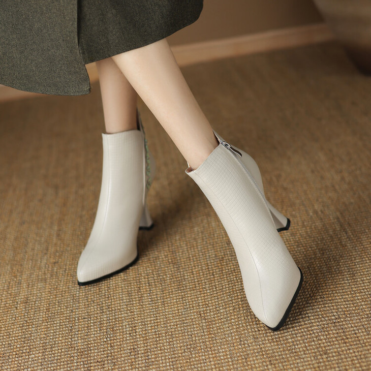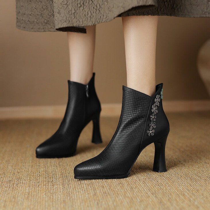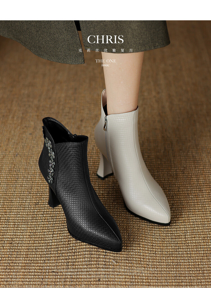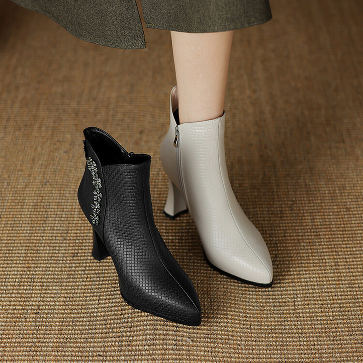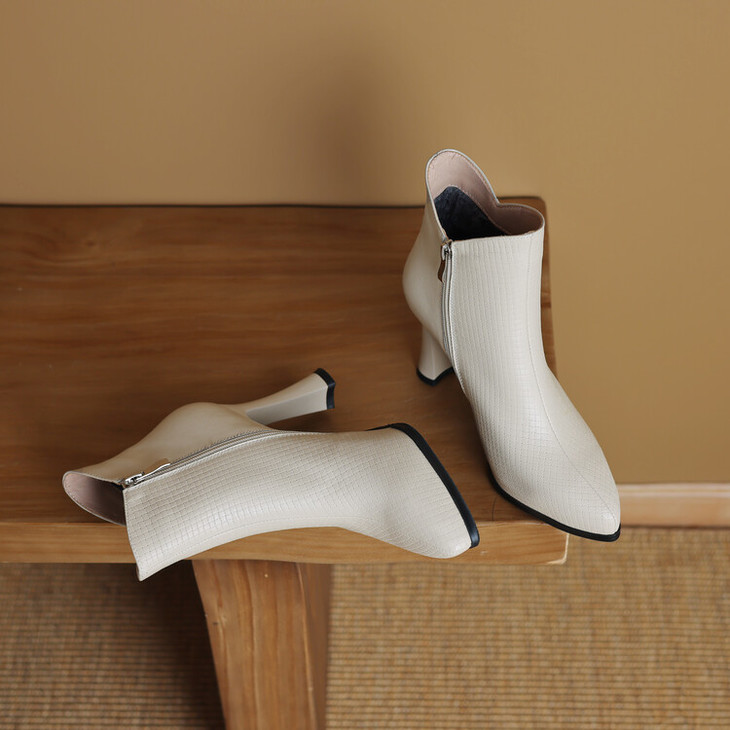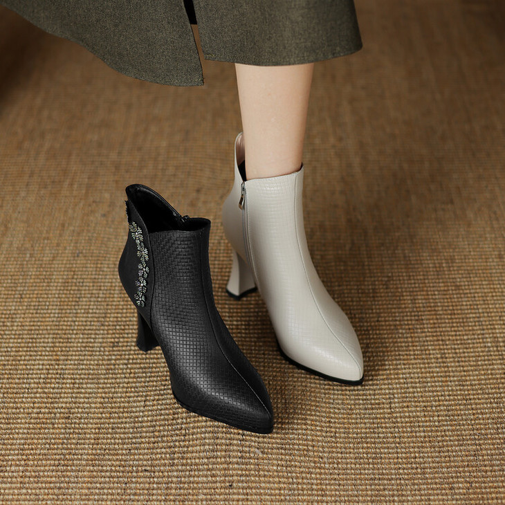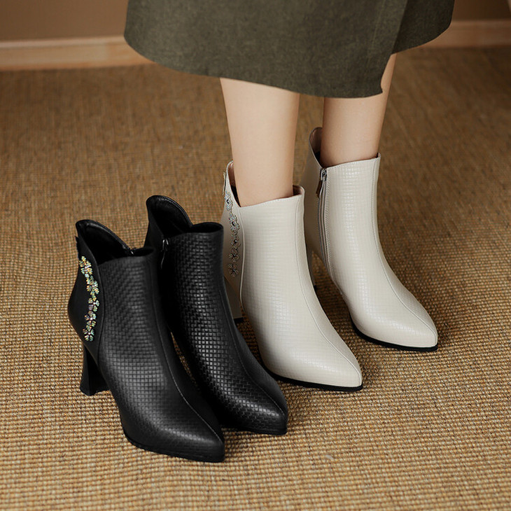货号:1512鞋面材质:牛皮压花内里:单里 绒里鞋底材质:牛筋底跟高:9.5厘米掌 宽:8cm尺码: 34-39颜色:黑色 米白色