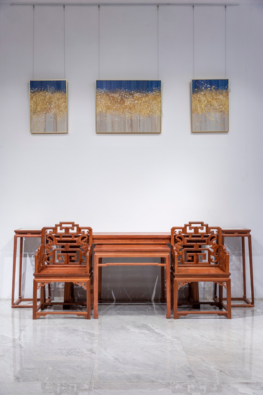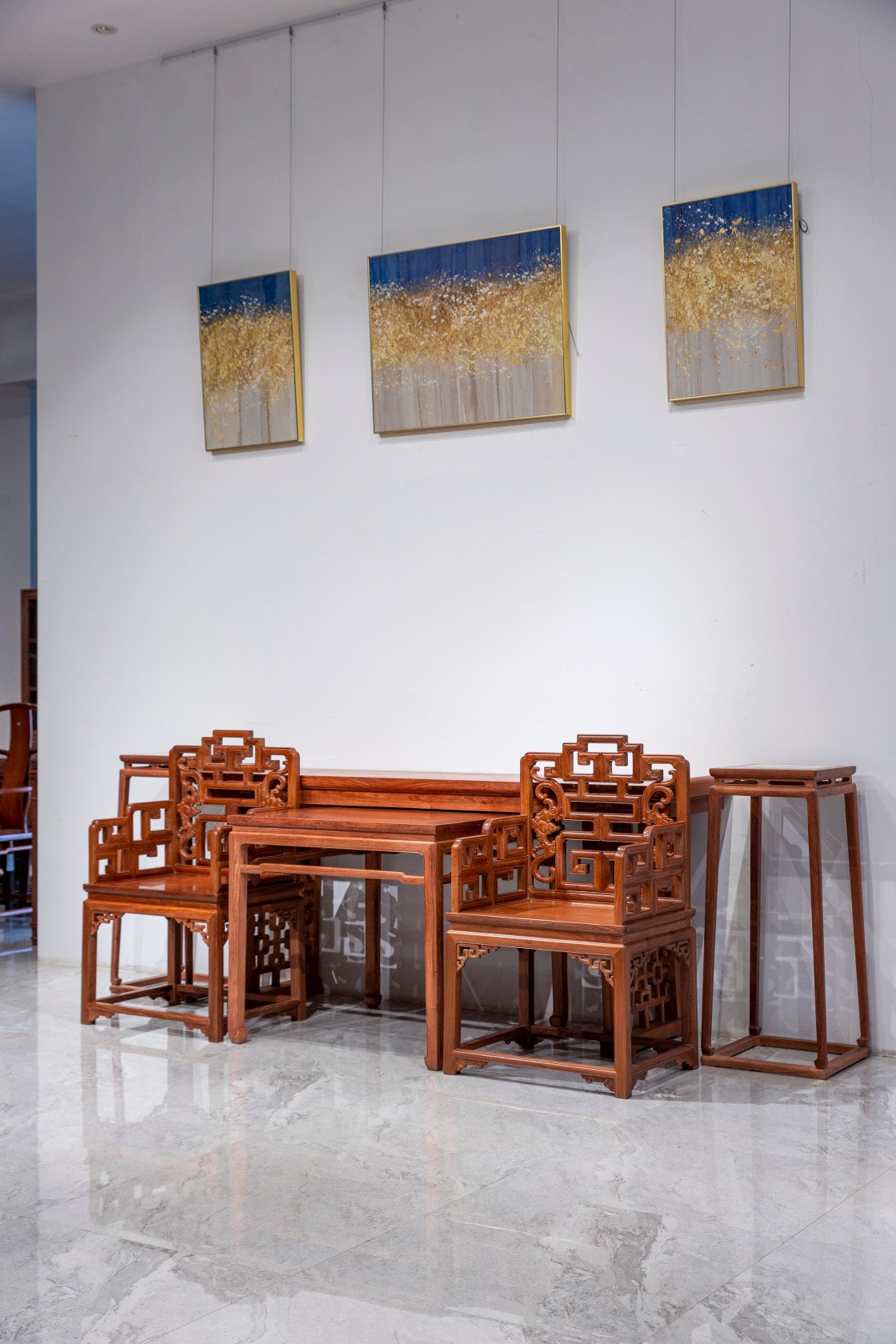 中堂是会见宾朋长幼教谕、喜庆等活动的重要场所,需镇得住场面。中堂家具讲究严格有序,采用成组成套的对称方式摆放,家具、楹联等都以中轴线形成两边对称布置,庄重、高贵,非常有气派。