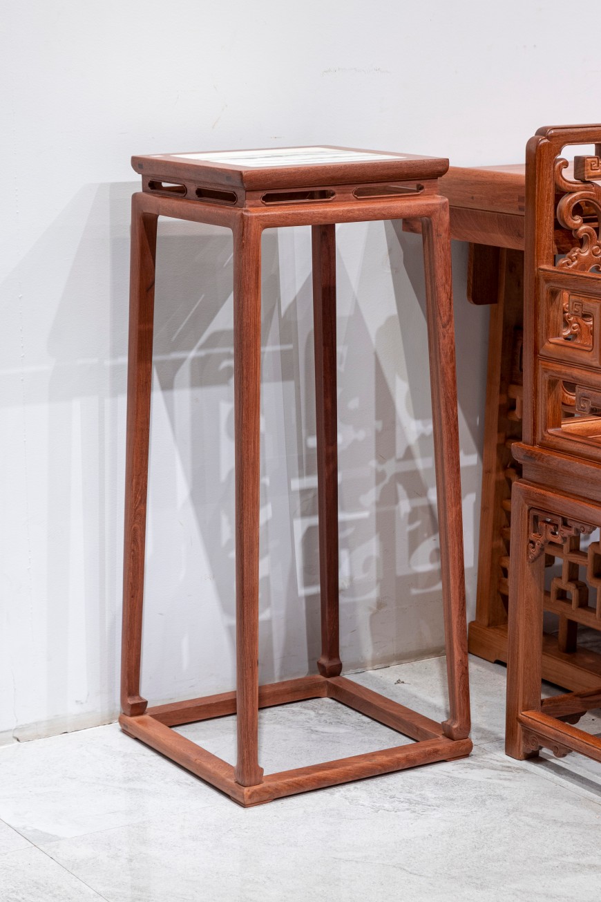 石面98明式托泥束腰 花架:此款花架为传统明式高香几样式,攒框镶天然云石面心,面心四边起拦水线,是经典的造法,冰盘下铲边线,束腰开海棠式透孔一字并列,空灵轻巧。四足方材修长,侧脚显著,光素顺势,内翻小马蹄挺拔有力。托泥与面框呼应,一木挖出碗口线造法的扁平式支承,细节十分精致耐品,是极具明式气韵的一款器物。