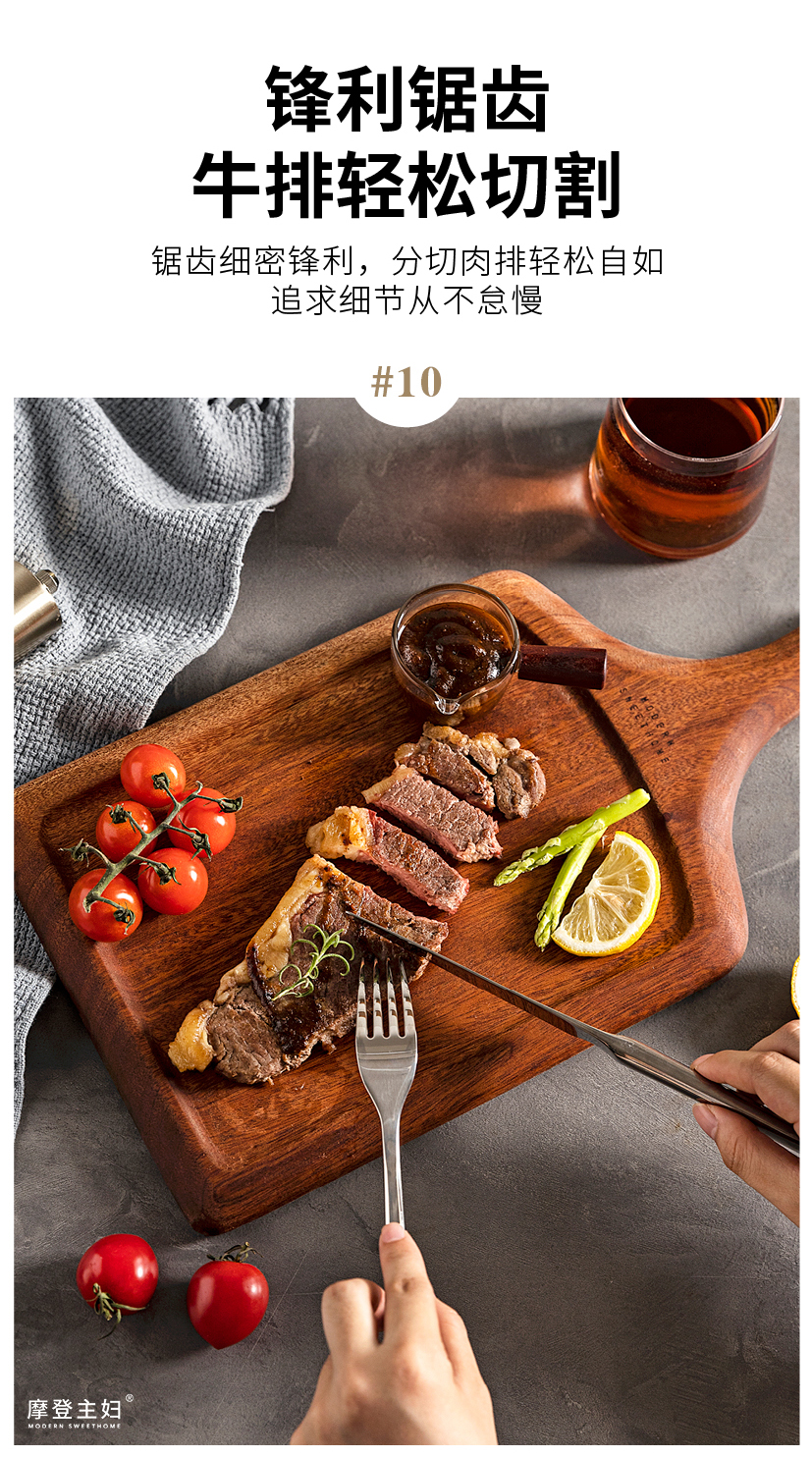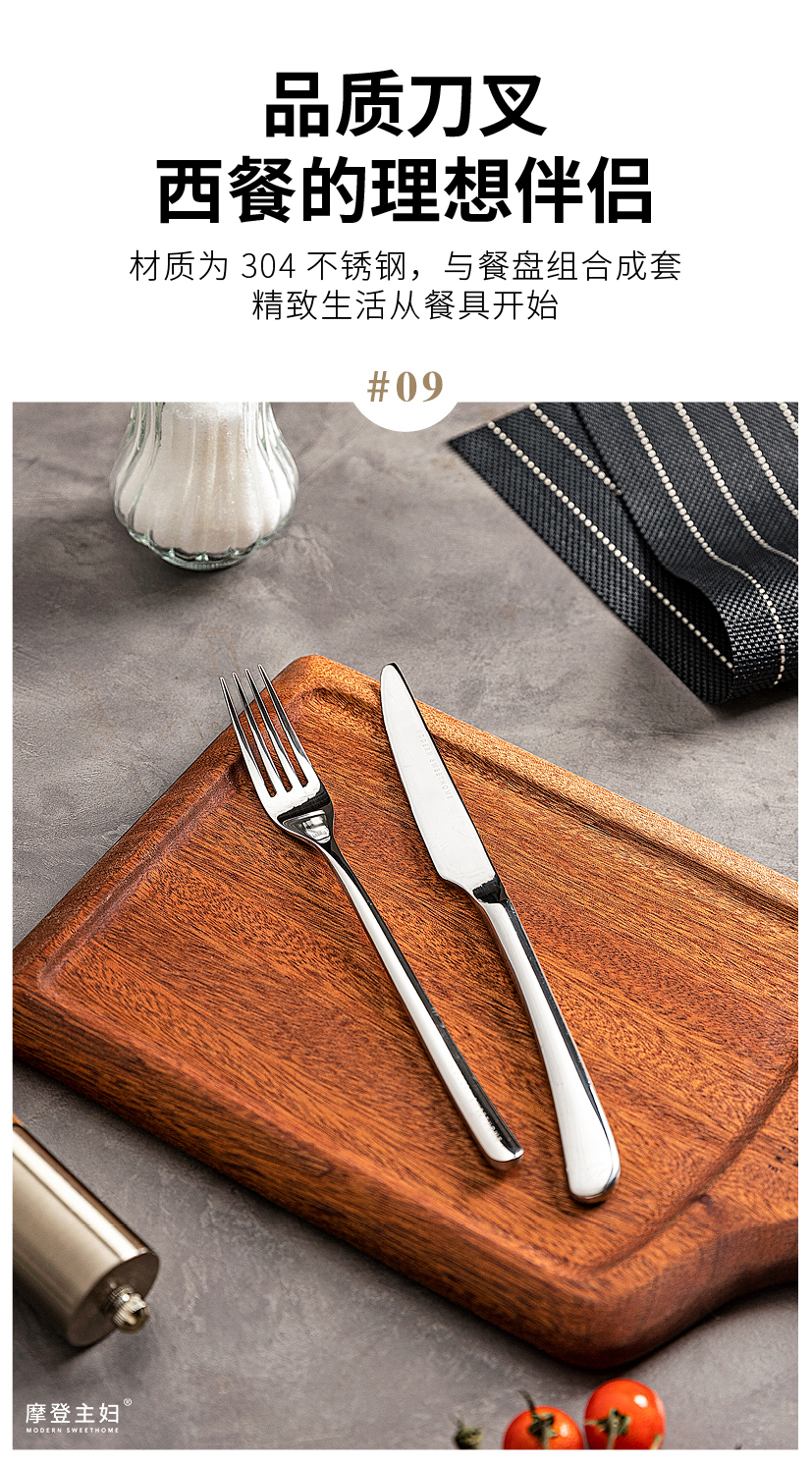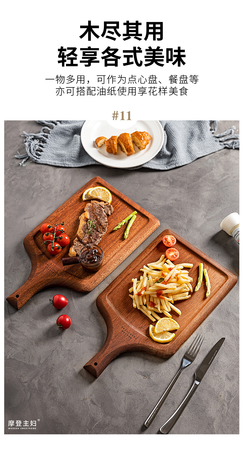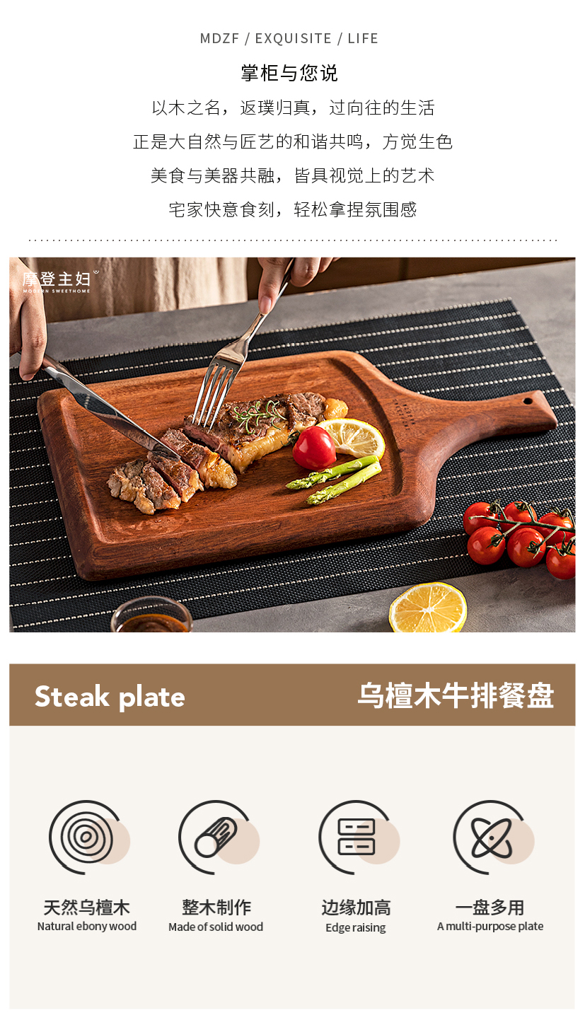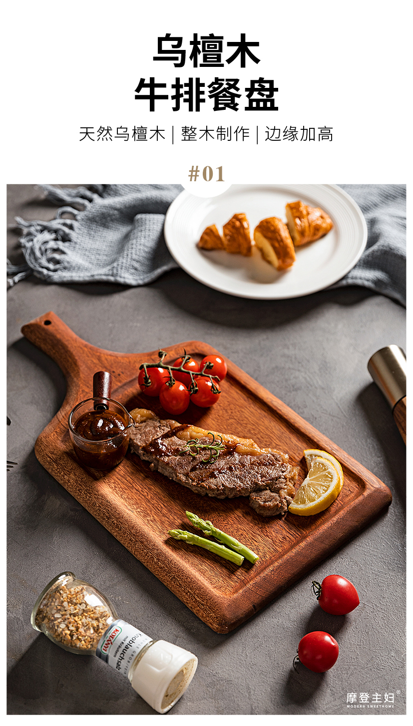 摩登主妇牛排餐盘刀叉三件套牛排盘子西餐盘家用餐具乌檀木质托盘