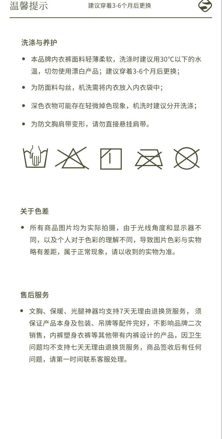 退换货规则:1.7天无理由退换货规则:品牌产品为贴身私密性衣物,务必保证所退产品吊牌水洗标齐全,无人为因素导致的破损、污渍、异味等影响二次销售的状况,否则,品牌有权不予退货退款,退货请将赠品一同寄回。内裤不支持7天无理由退换。换货差价将遵循多退少补的原则。