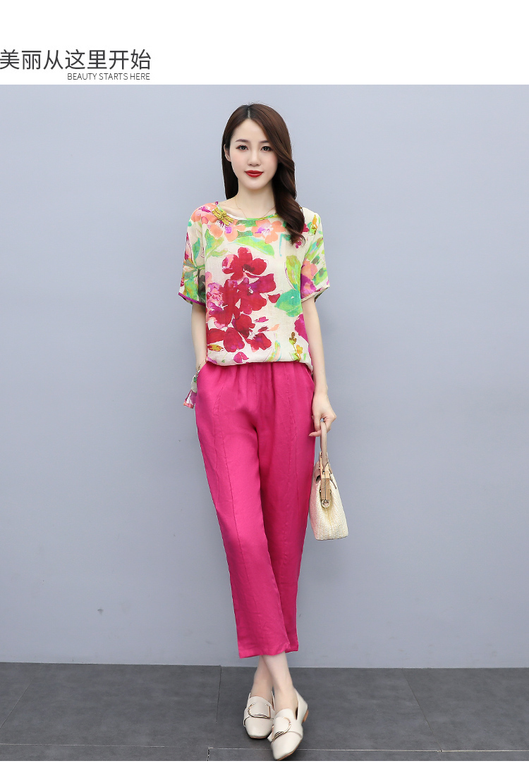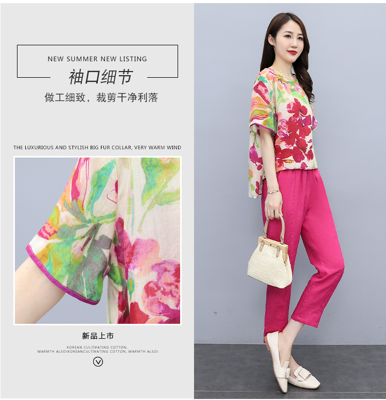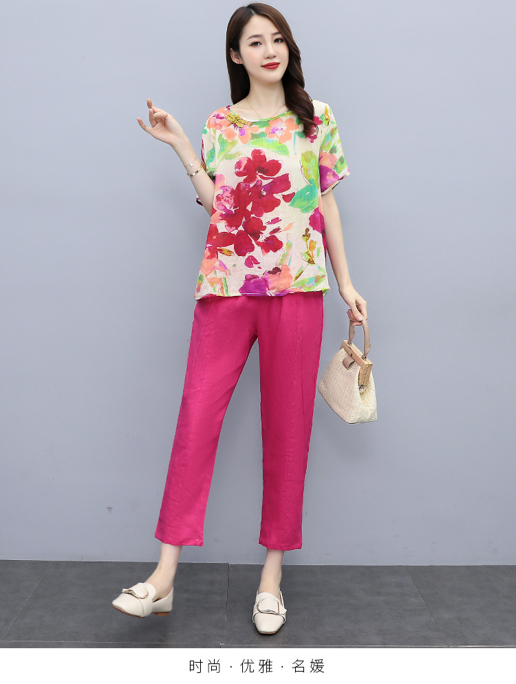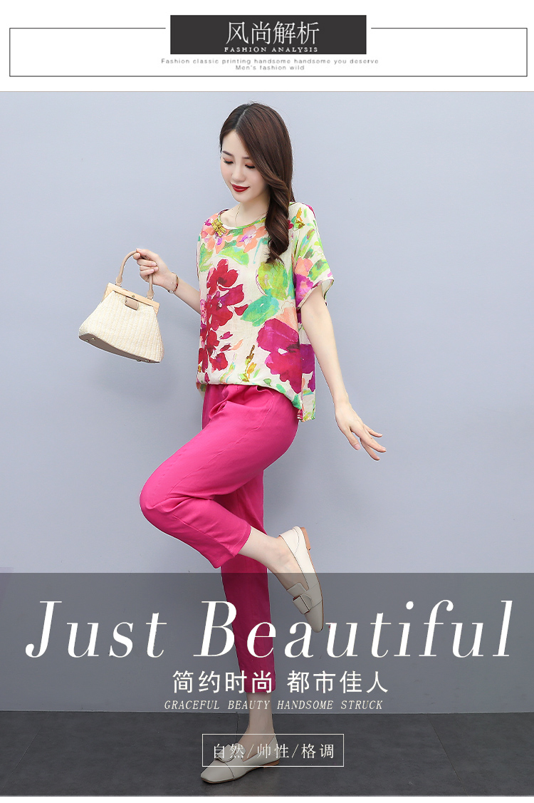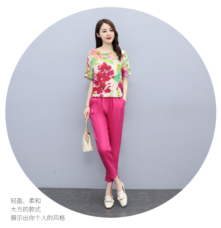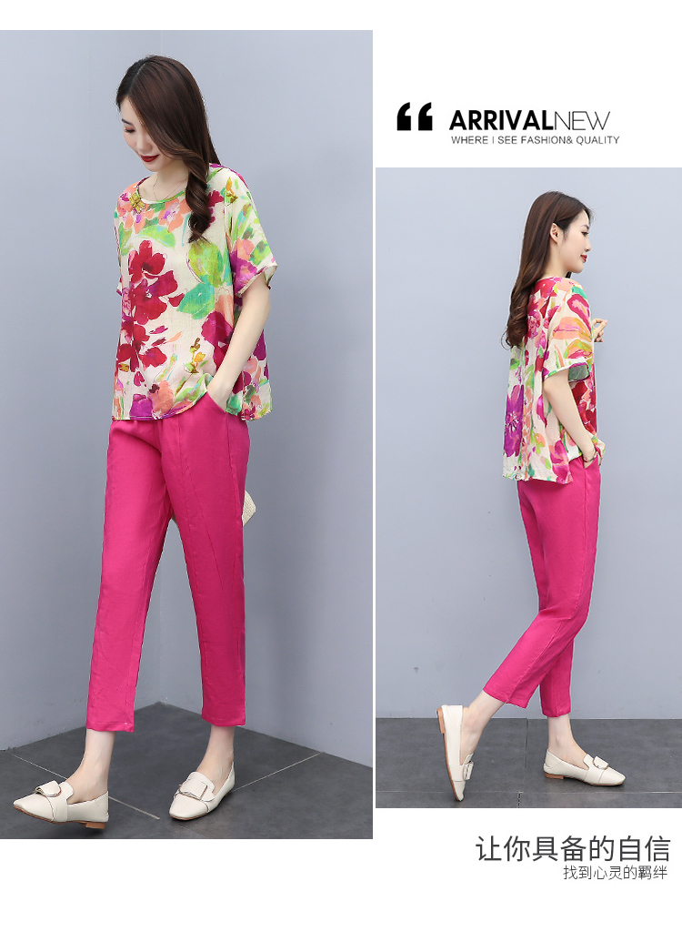 棉麻套装显瘦夏装印花洋气休闲短袖小脚裤两件套 XX2726