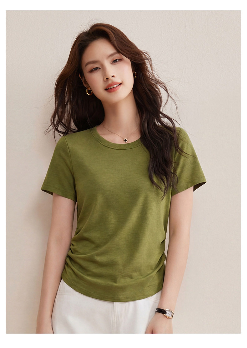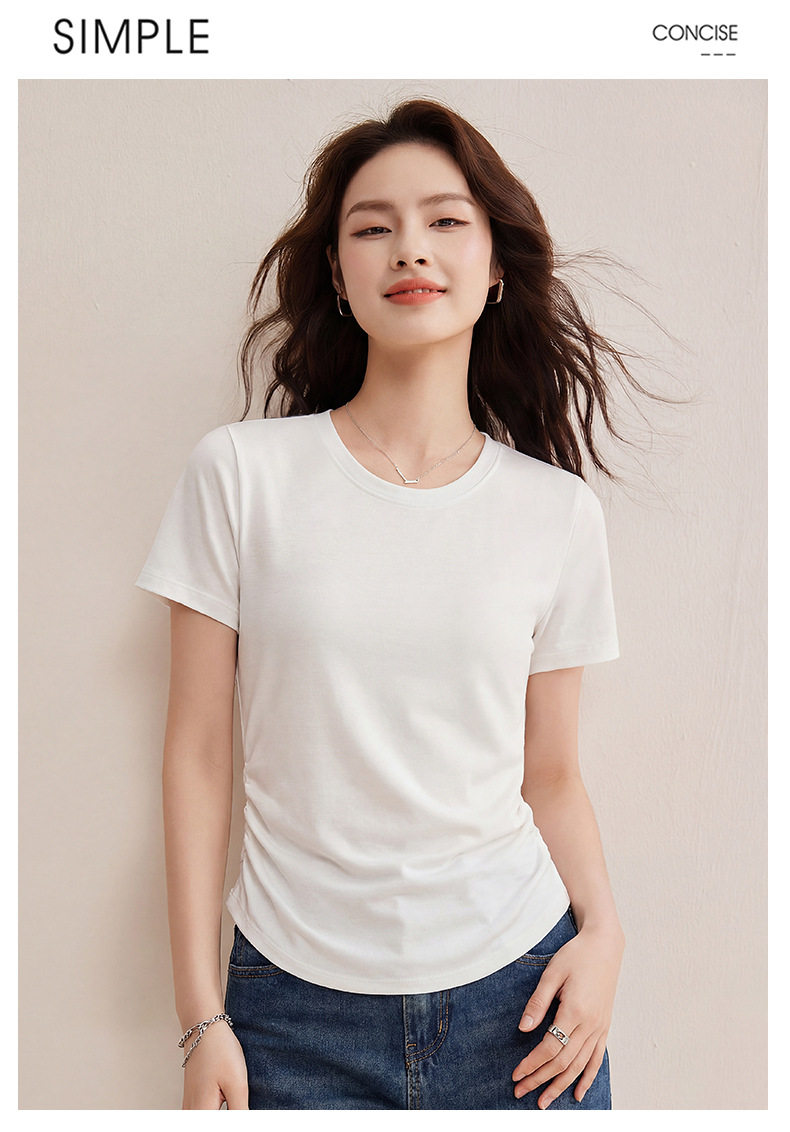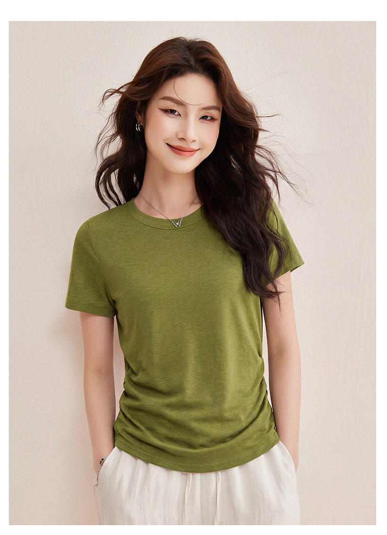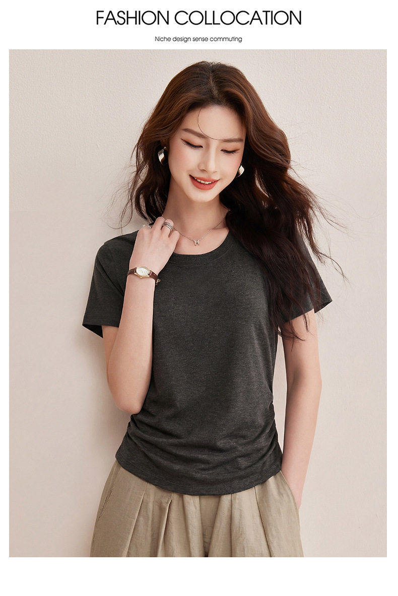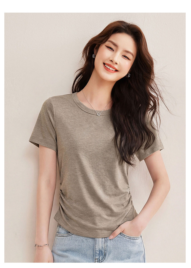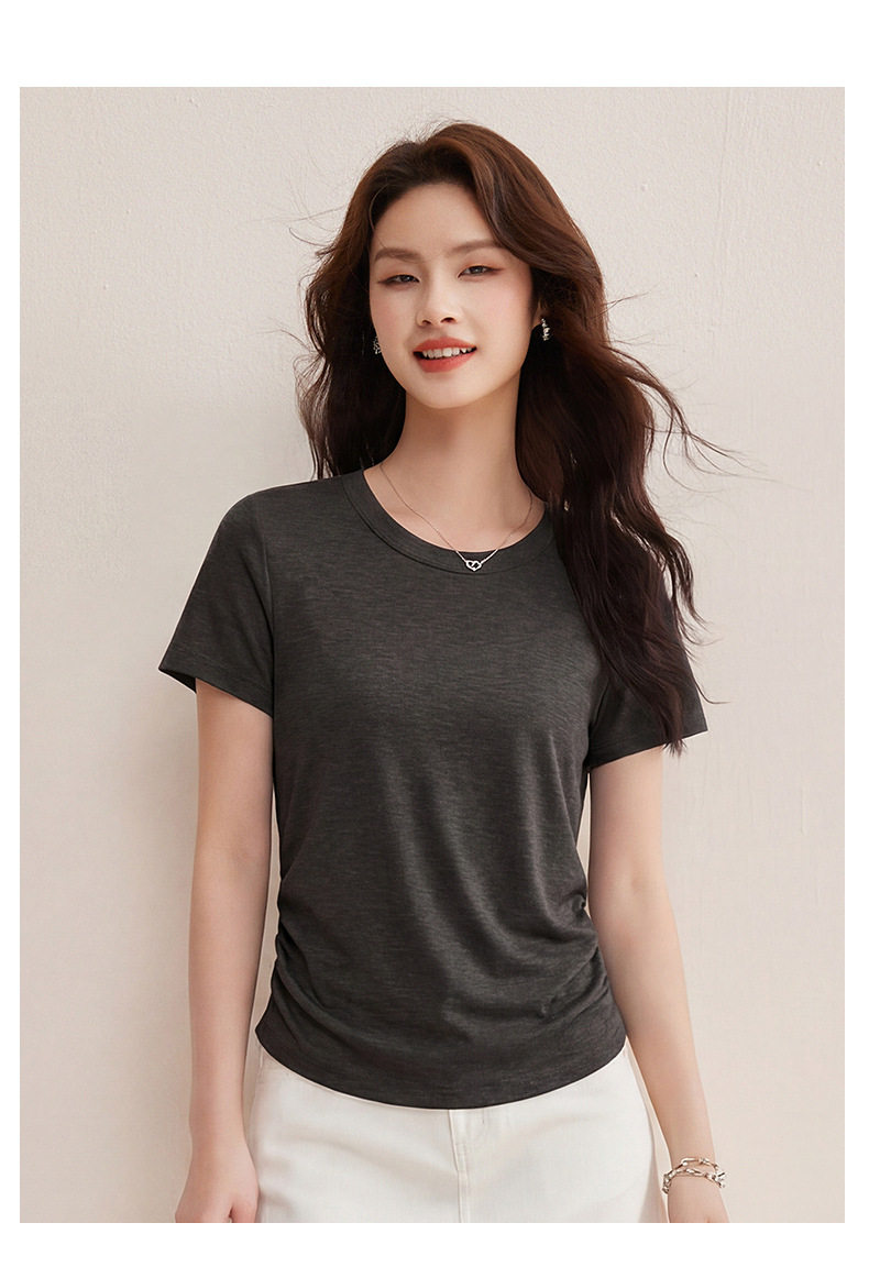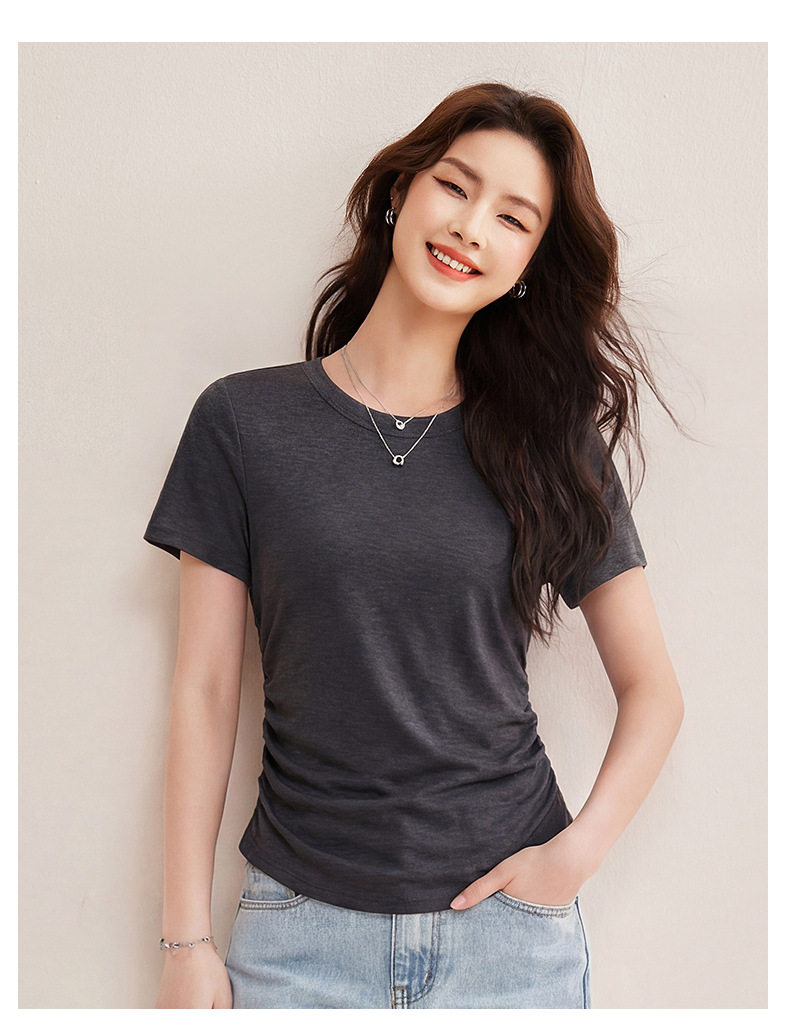 「自j」全新升级【铂金会员119/天猫159/差价40】(01426)洛诗琳小蛮腰兰精天丝T恤2026新款圆领褶皱显瘦收腰短袖上衣