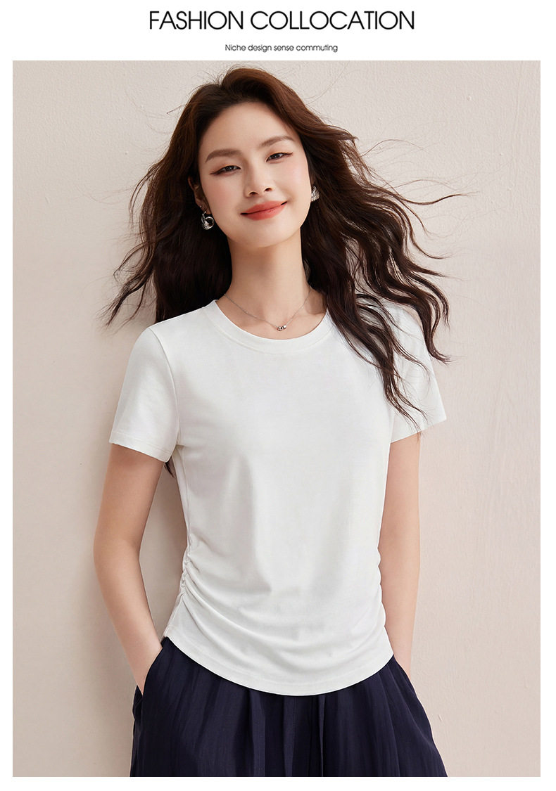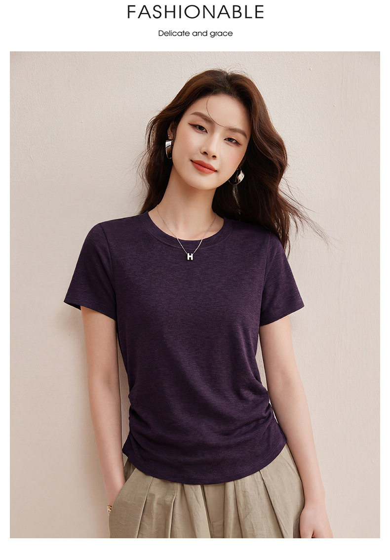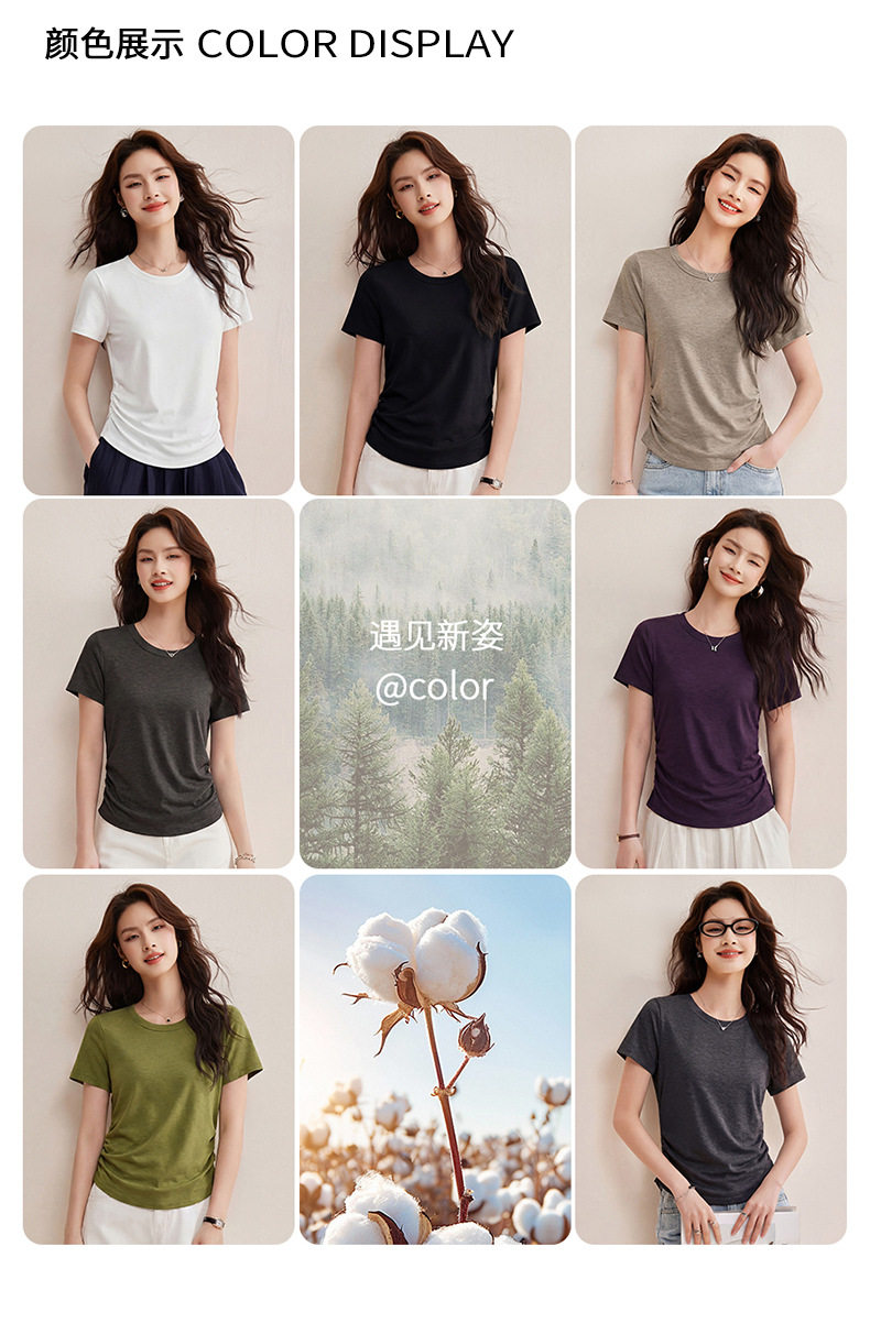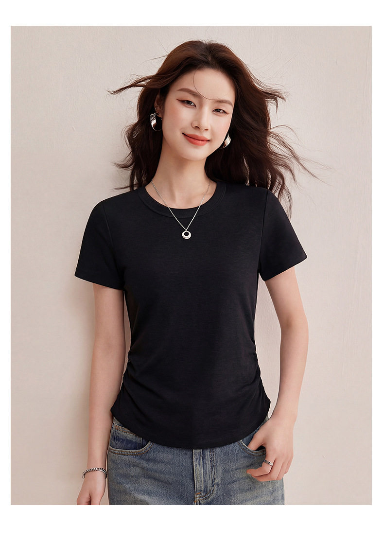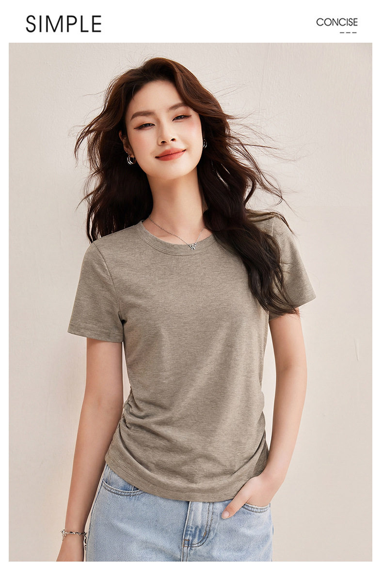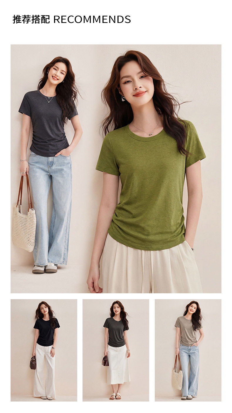 「自j」全新升级【铂金会员119/天猫159/差价40】(01426)洛诗琳小蛮腰兰精天丝T恤2026新款圆领褶皱显瘦收腰短袖上衣