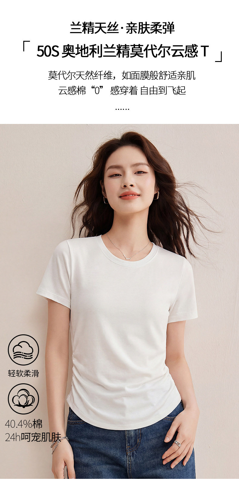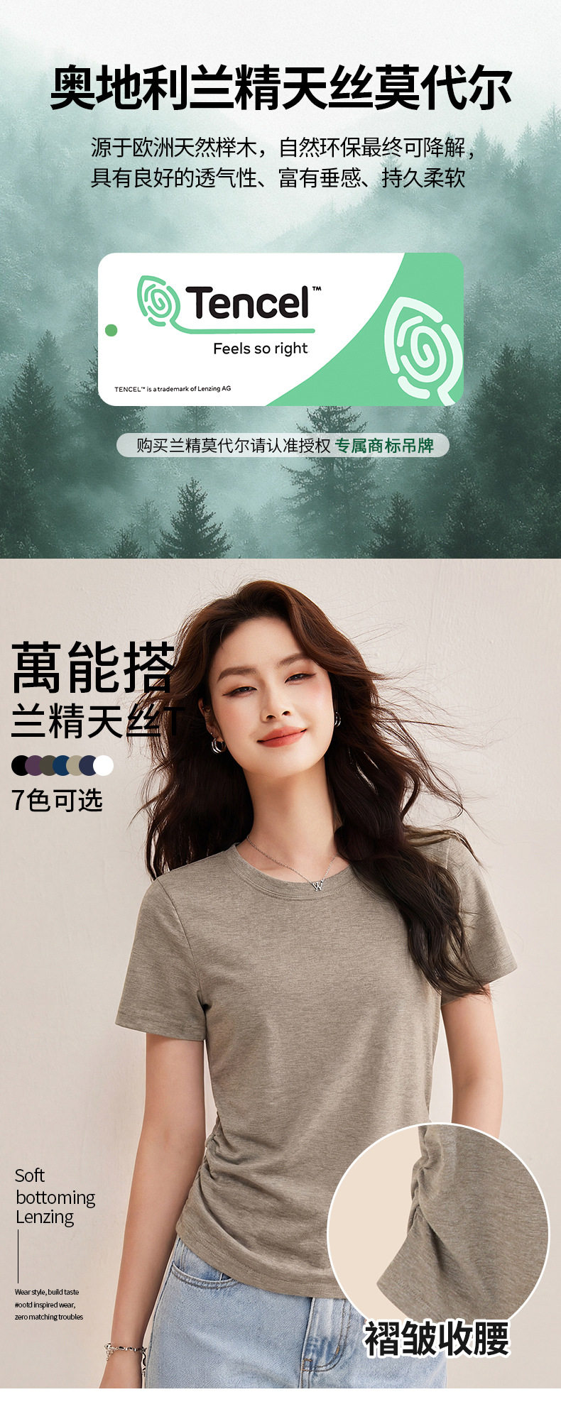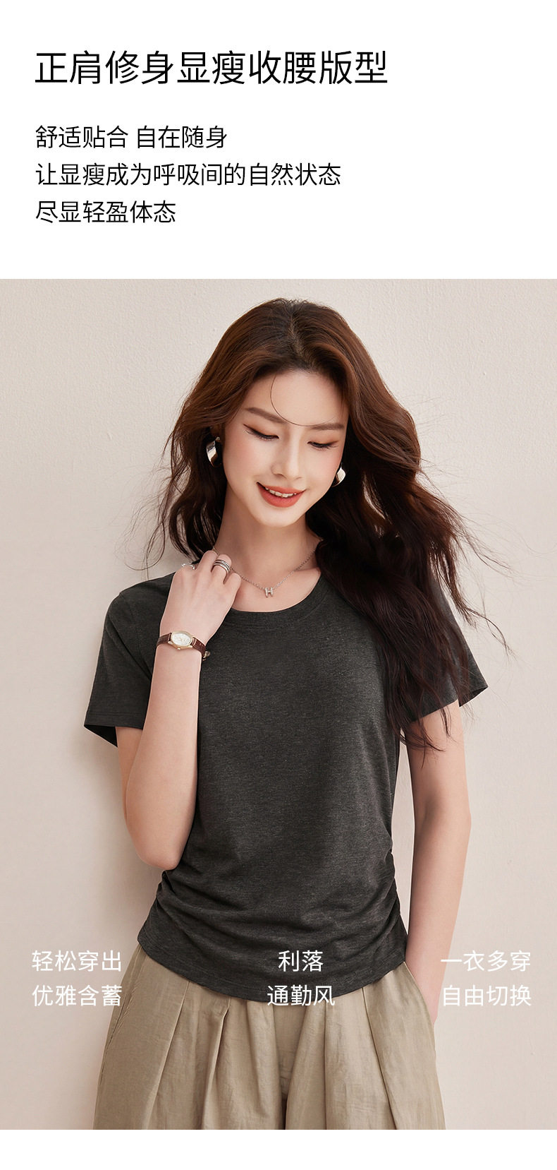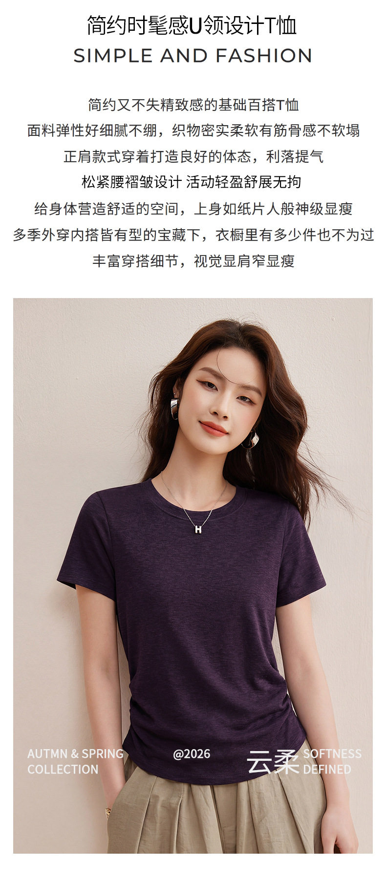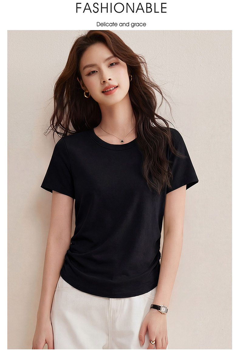 「自j」全新升级【铂金会员119/天猫159/差价40】(01426)洛诗琳小蛮腰兰精天丝T恤2026新款圆领褶皱显瘦收腰短袖上衣