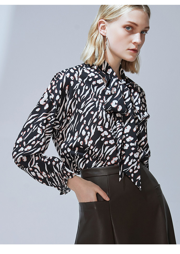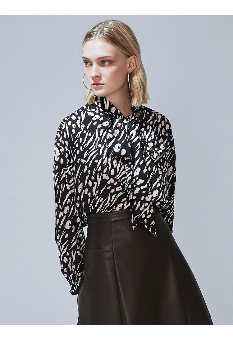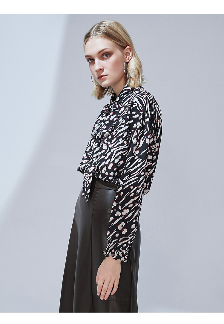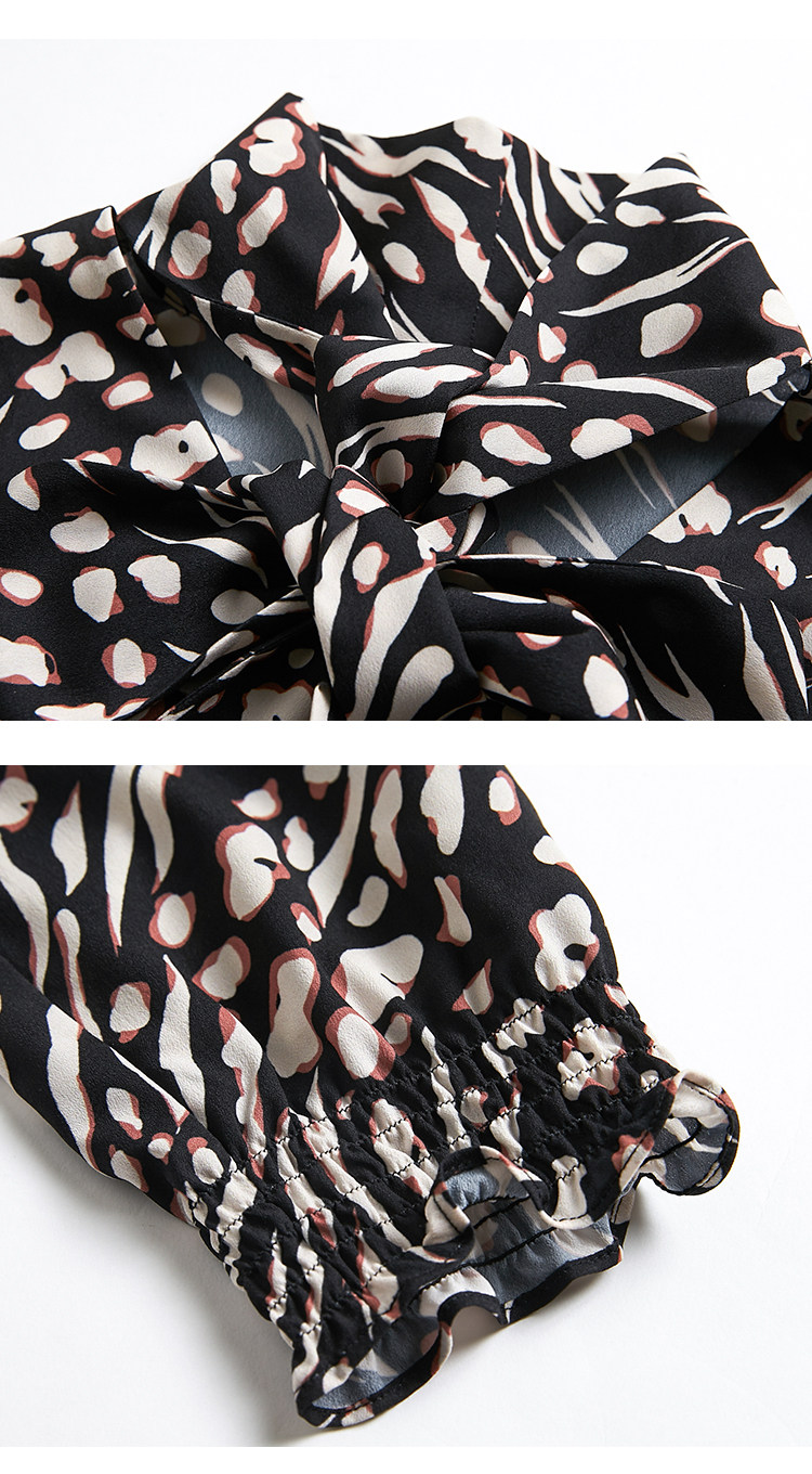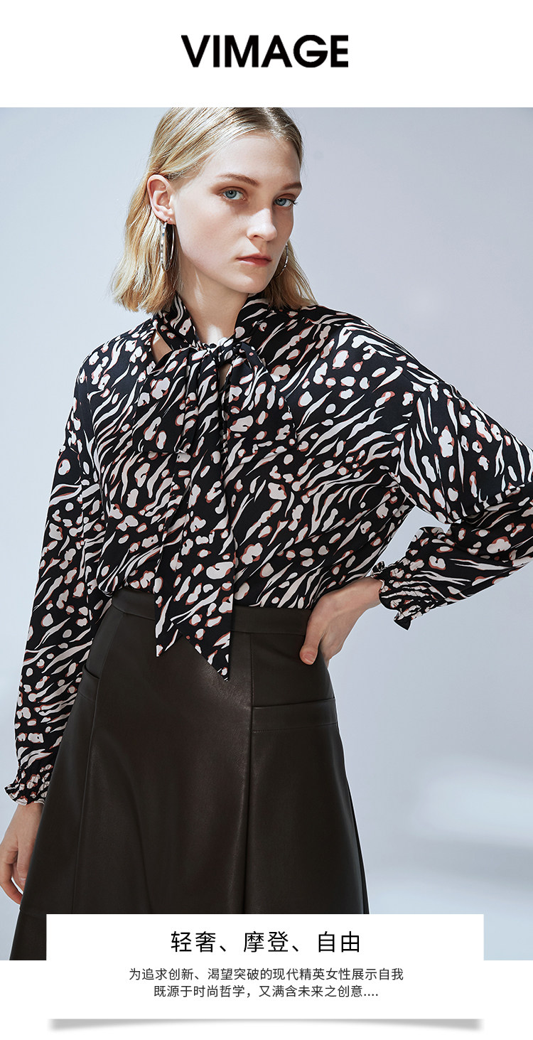 VIMAGE纬漫纪秋款时尚复古高领系带泡泡袖印花衬衫女上衣V1413009
