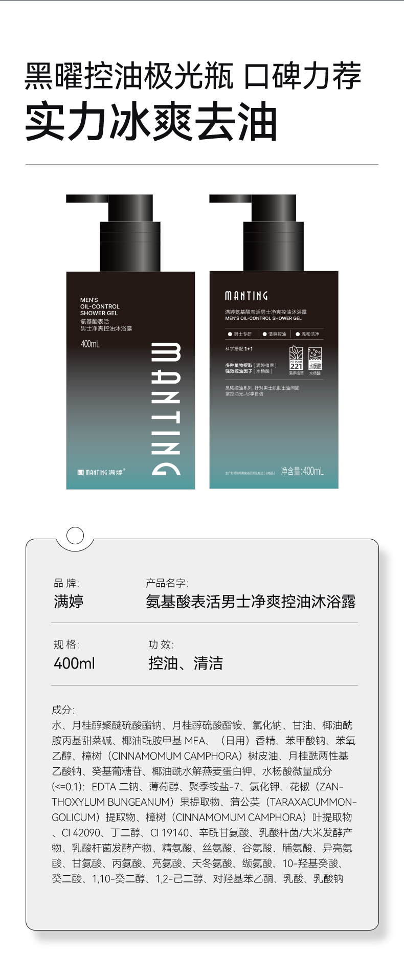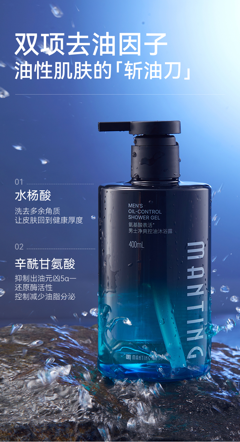 👇【专为男士研发】氨基酸男士净爽控油沐浴露400ml——加入会员下单享8折,满69元送满婷清满保湿洁面乳,满119元送祛痘控油沐浴乳