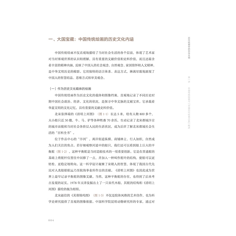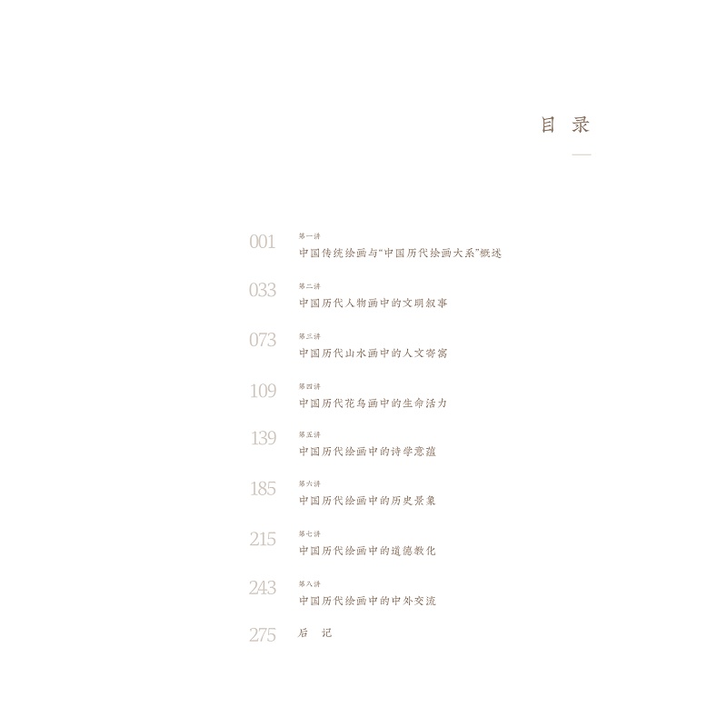 本书稿围绕“中国绘画艺术与中华文明历史”这一主题展开论述;大体分为8章,每章绍述一个专题的内容。第1章《绘见文明:中国传统绘画与中华文明概述》,第2章《乐山知水:中国古代山水画与中华文明》,第3章《图形存真:中国古代人物画与中华文明》主,第4章《格物致知:中国古代花鸟画与中华文明》,第5章《诗情画意:中国古代绘画中的诗学意蕴》,第6章《以图证史:中国古代绘画中的历史景象》,第7章《丹青载道:中国古代绘画中的政治教化》,第8章《文明互鉴:中国古代绘画中的中外交流》。