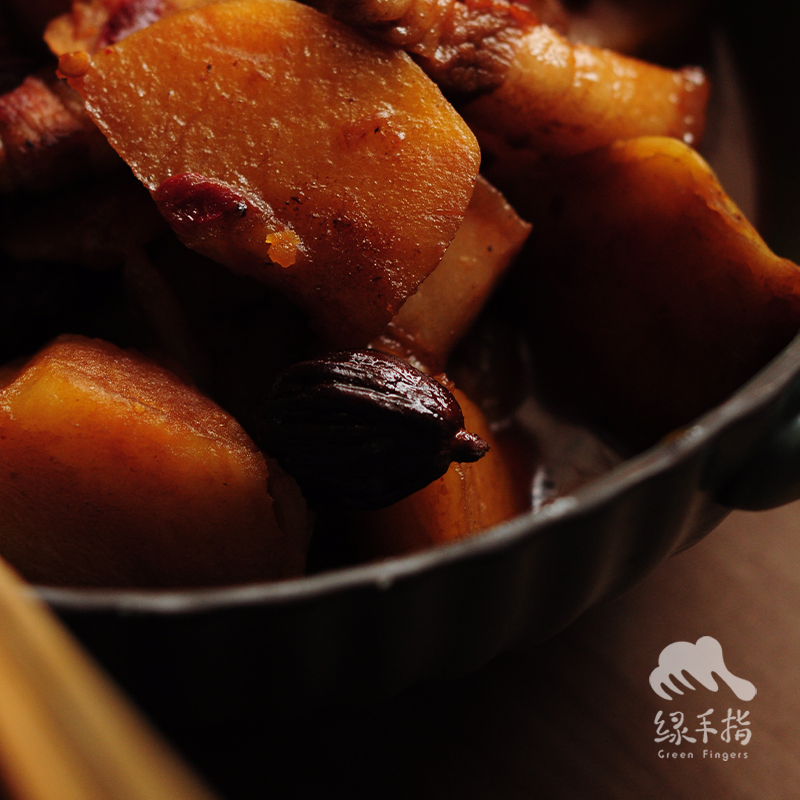 草果本身是一种姜科豆蔻属的食物,跟我们每天吃的姜是亲戚,它们都有柠檬醛这类挥发性物质,都有辛香味。它最大的作用就是给食物增香去腥,它含有几种香味物质,主要为桉树素,α-蒎烯和柠檬醛, 尤以桉树素更为特别。