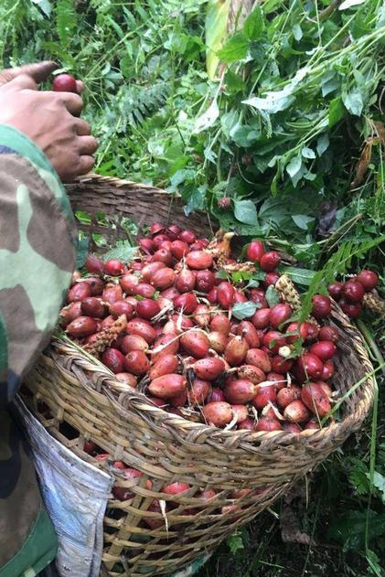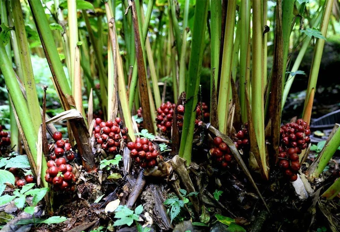 新鲜草果长相非常喜庆,在绿林里十分夺目,一串串,红彤彤。每年夏末,当地村民会到林子里采集野生食材和药材,补贴家用。