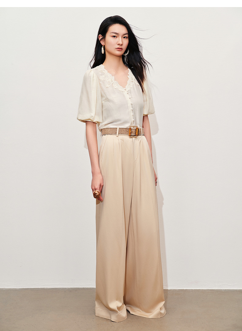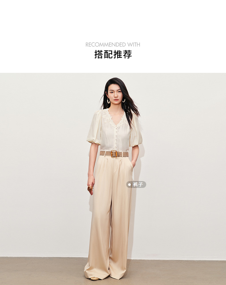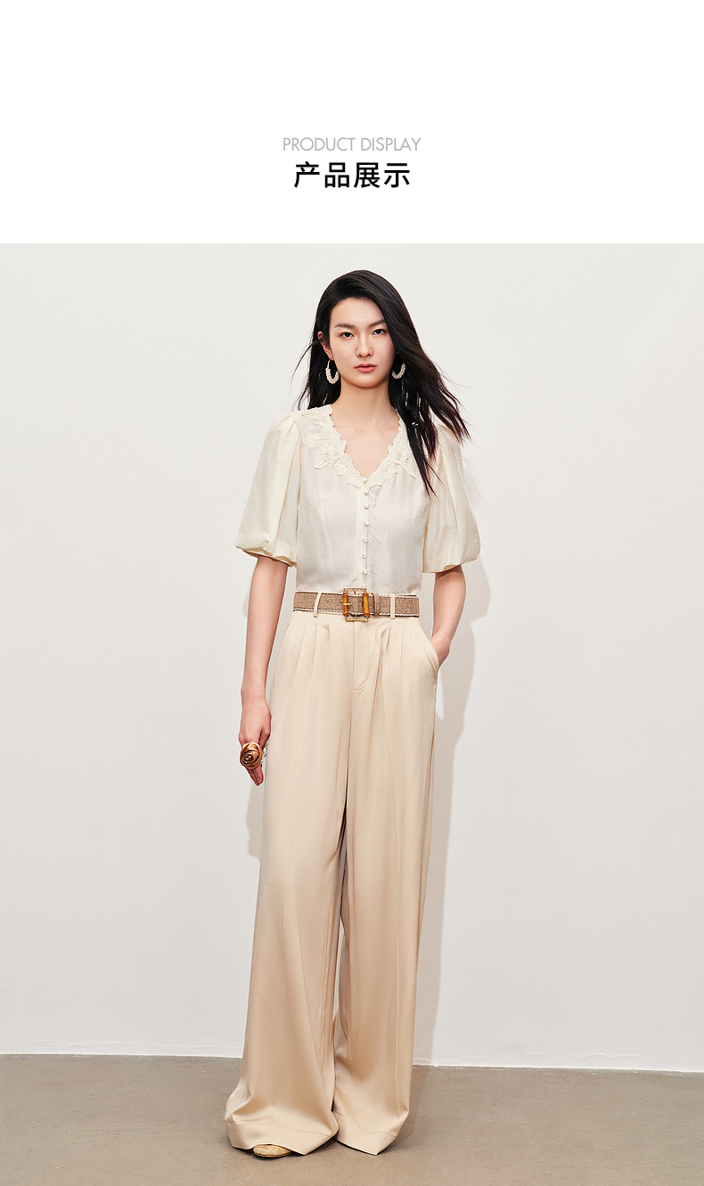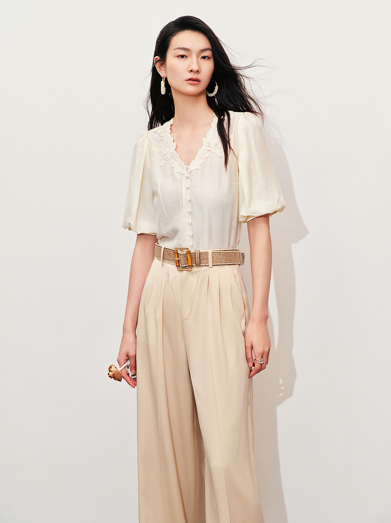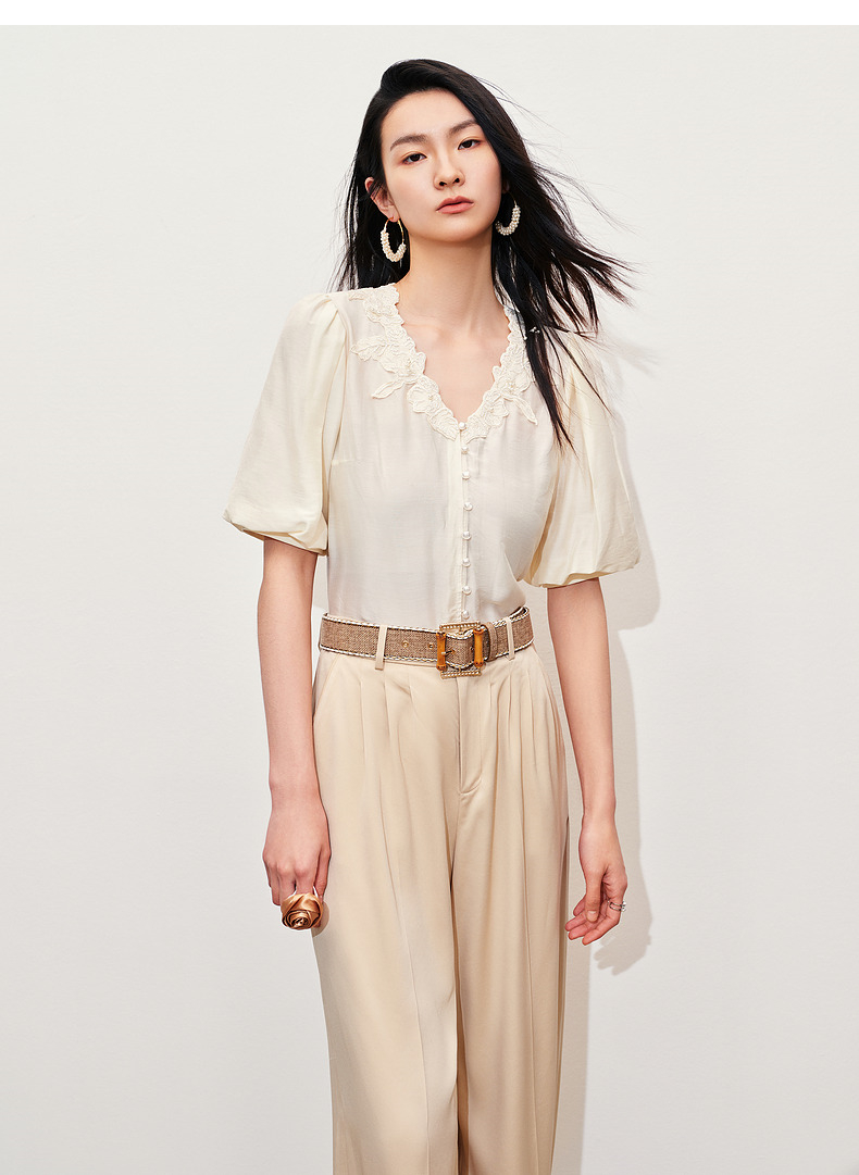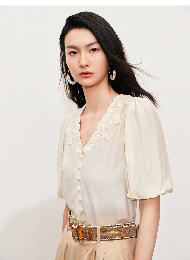 【商场同款】MAXRIENY文艺宫廷风绣花衬衫24夏款修身显瘦v领上衣(货号:MC85TP281)