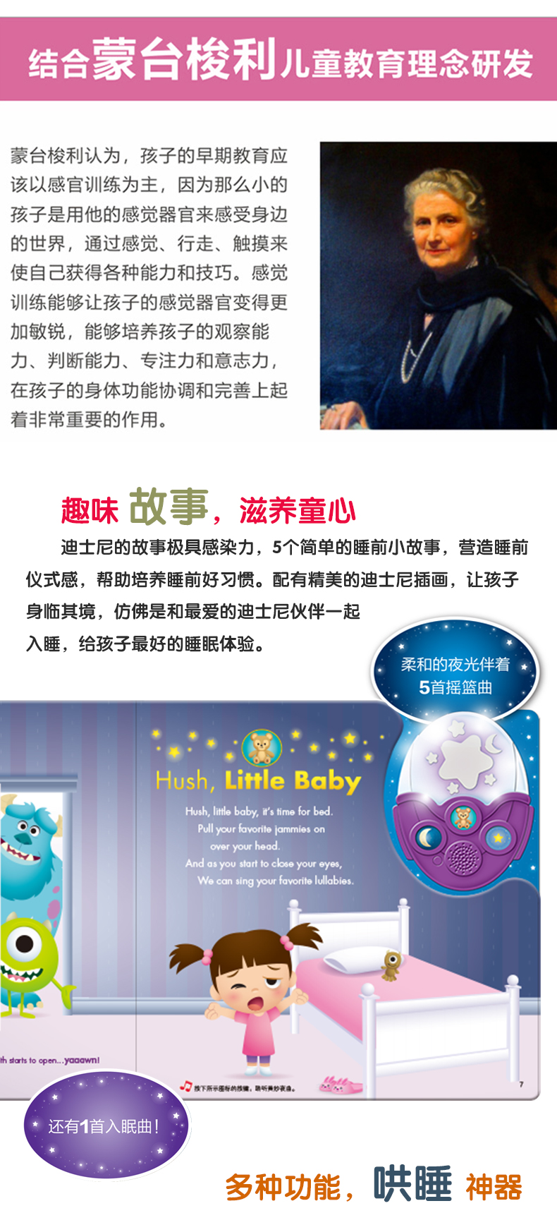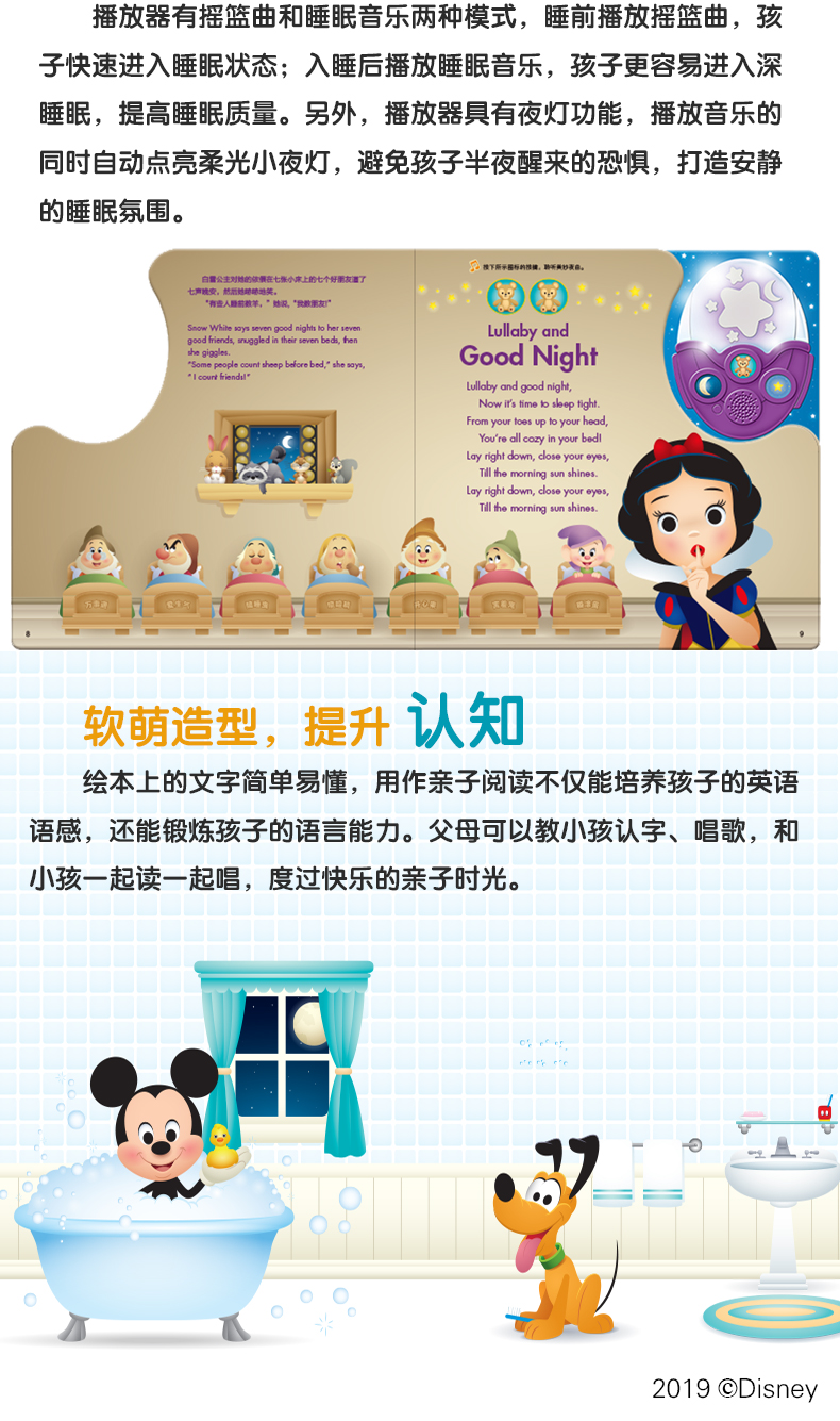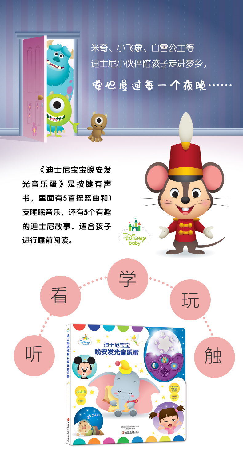 《迪士尼宝宝晚安发光音乐蛋》是按键有声书,里面有5首摇篮曲和1支睡眠音乐,还有5个有趣的迪士尼故事,适合孩子进行睡前阅读。米奇、小飞象、白雪公主等迪士尼小伙伴陪孩子走进梦乡,安心度过每一个夜晚。