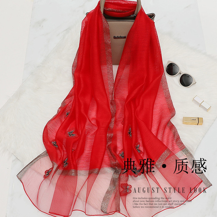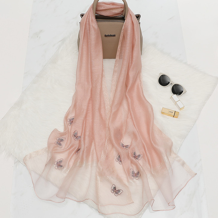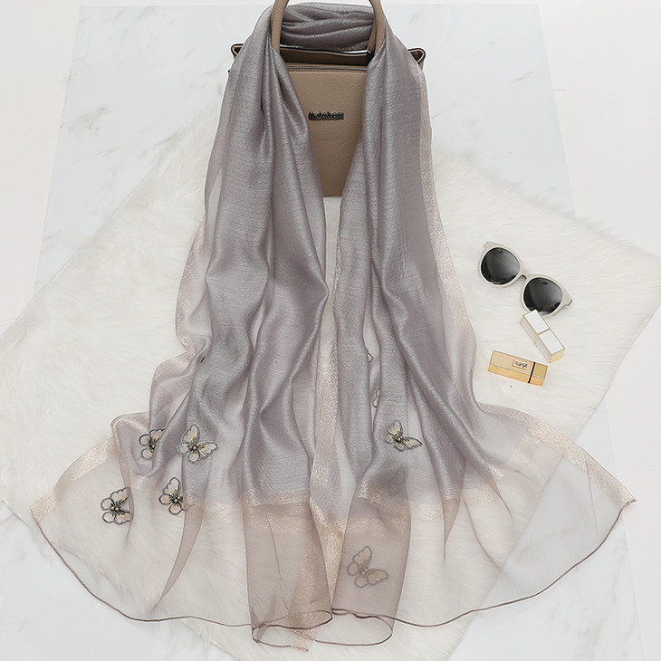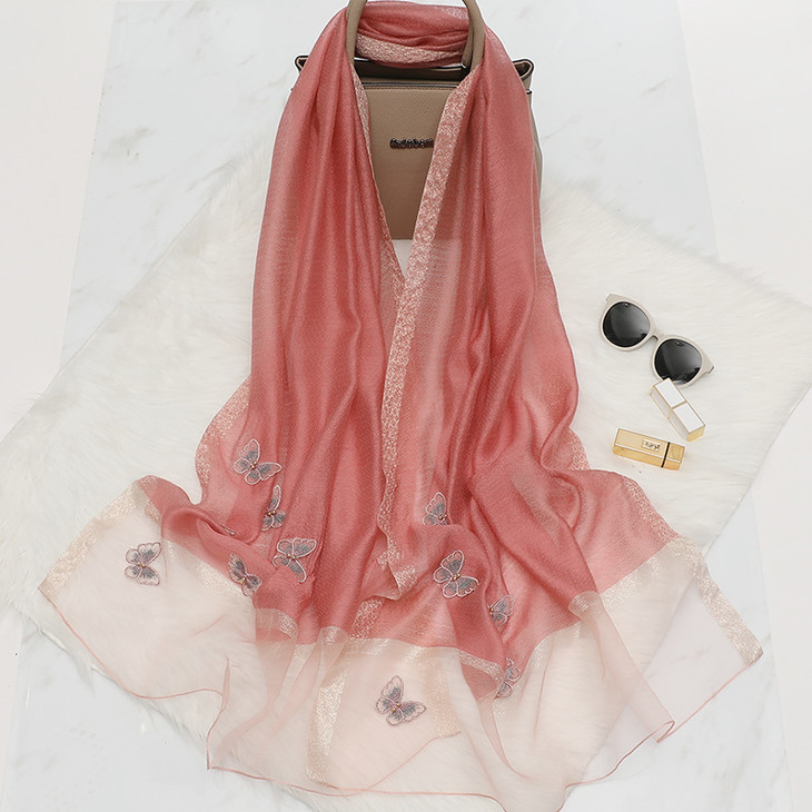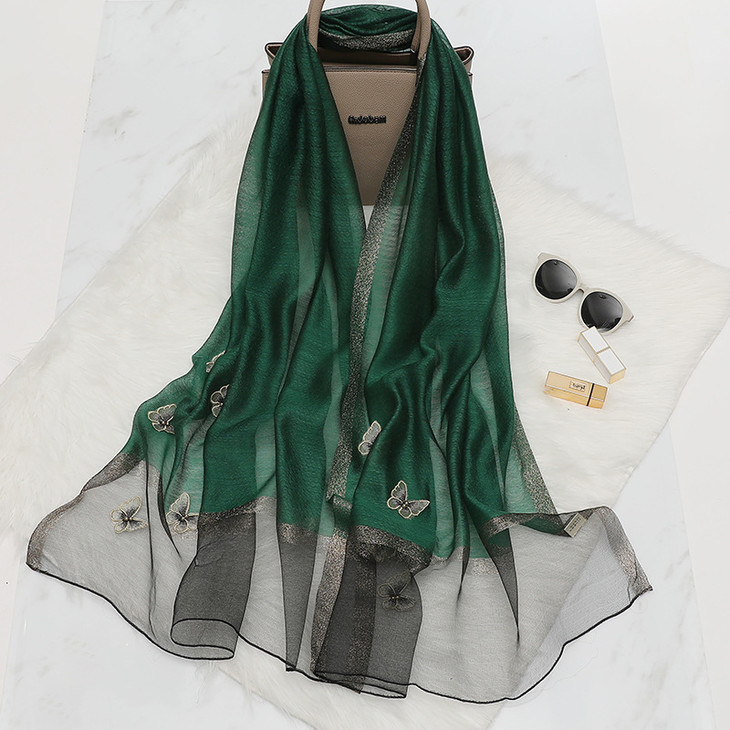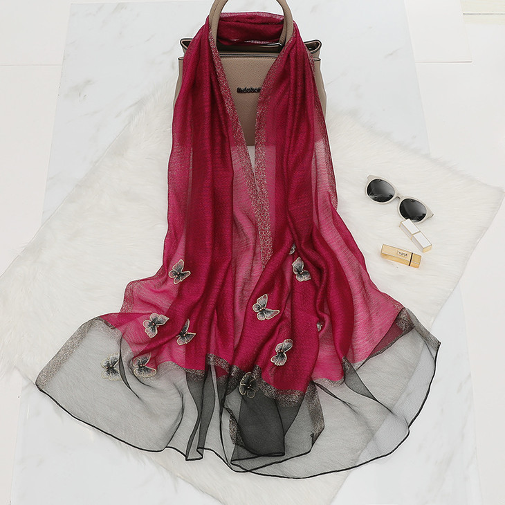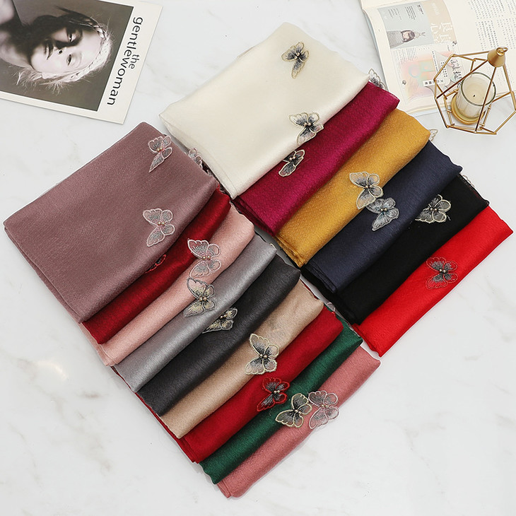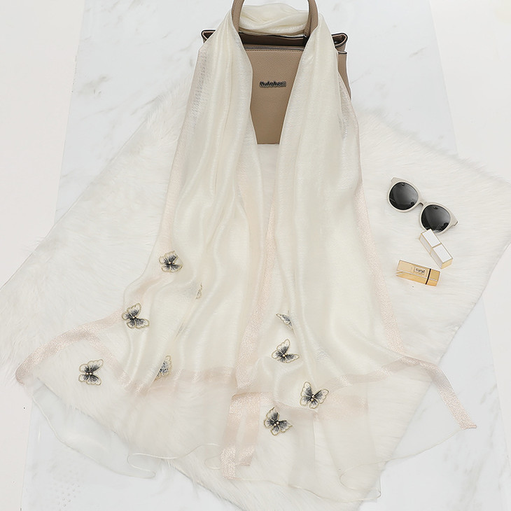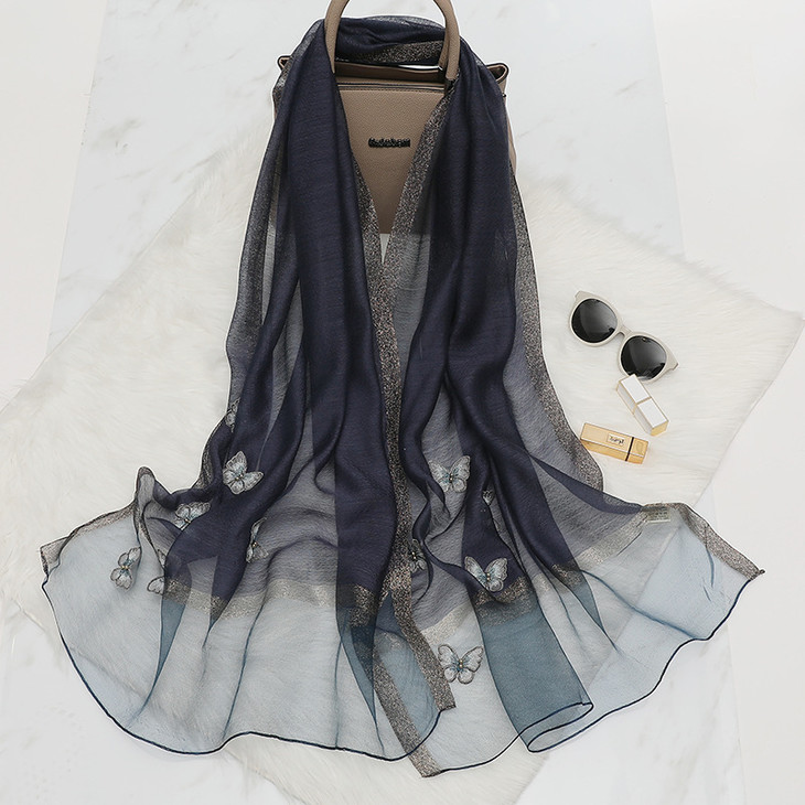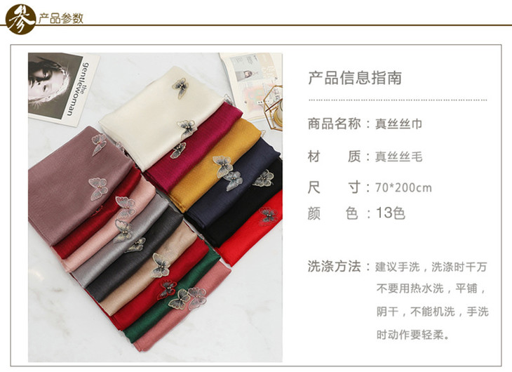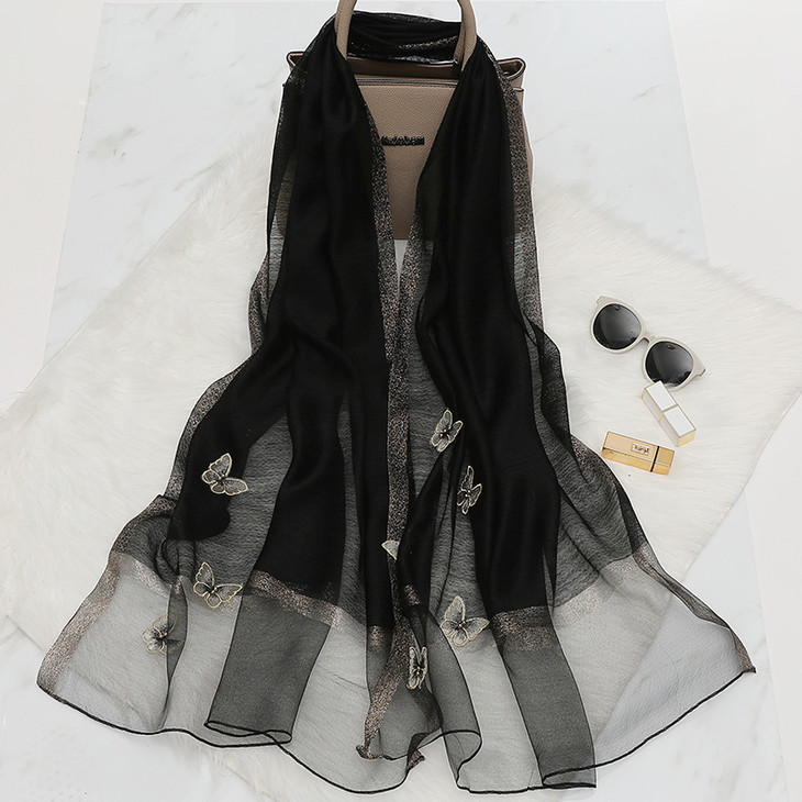 新款真丝羊毛混纺绣花围巾 刺绣蝴蝶丝毛丝巾披肩QM000303