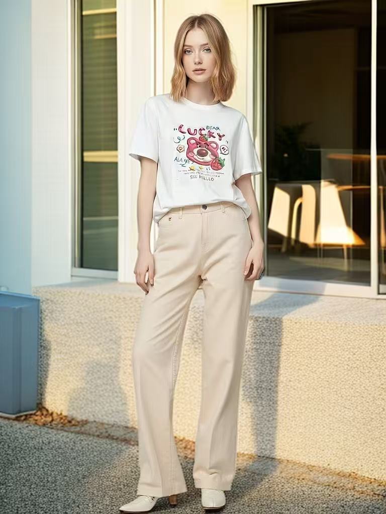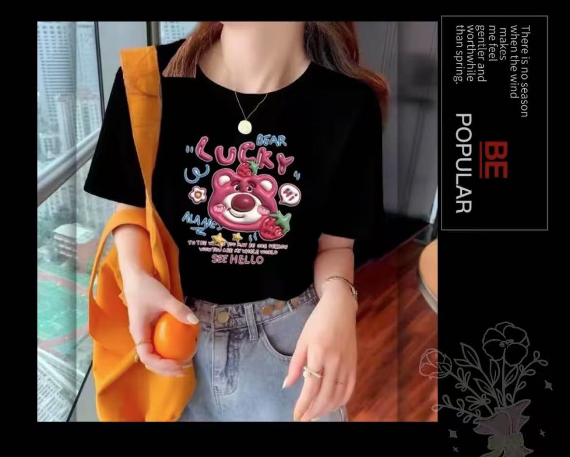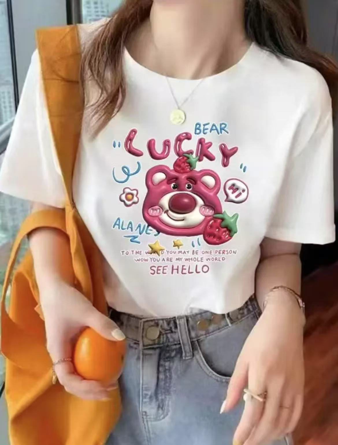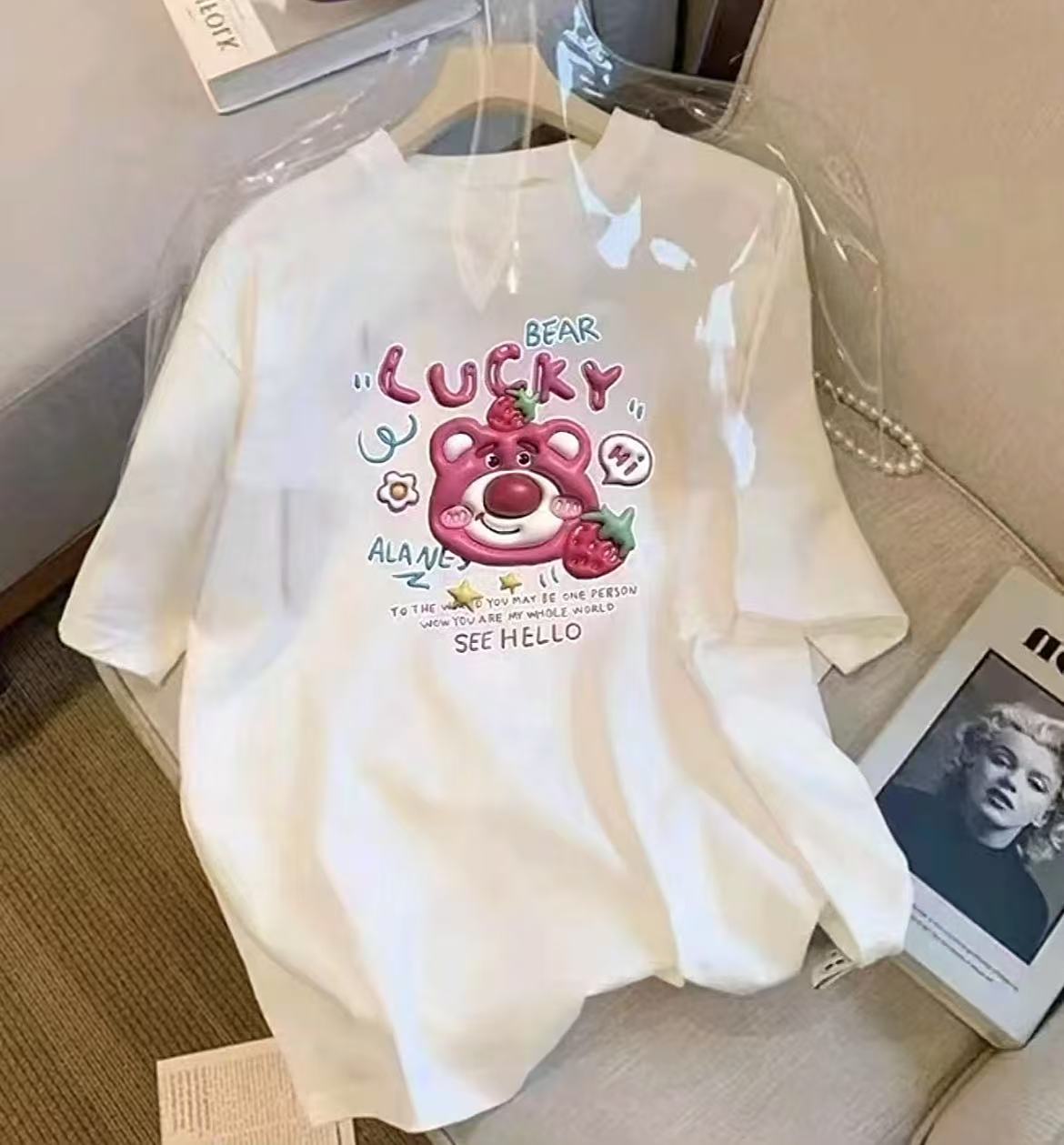 工厂直促价【100%棉】情侣(立体草莓熊-大图)柯式印花短袖T恤-喜出