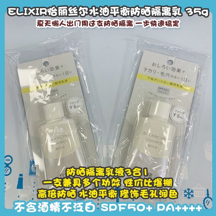 ELIXIR怡丽丝尔水油平衡防晒隔离乳 35g👍夏天懒人出门用这支防晒隔离☀,一步快速搞定!防晒隔离乳液3️⃣合1️⃣,一支兼具多个功效,性价比爆棚🔥。高倍防晒➕水油平衡➕修饰毛孔润色,它还可以打造通透的遮瑕效果💦,持续一天的零毛孔、零油光肌✔,皮肤底子好得妹子出门前直接涂它,省时省事🕓。不含酒精不泛白,SPF50+ PA++++的高防晒值👏,一般室外活动都完全够用喔