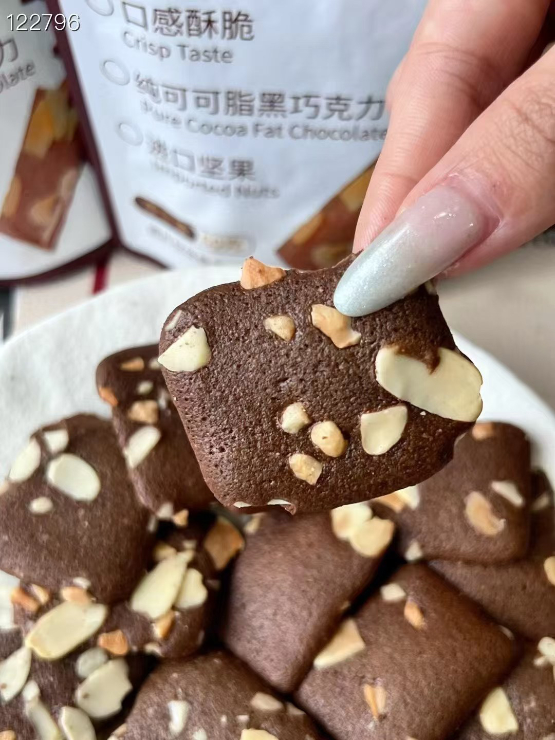 巧克力融入坚果,多重美味,浓郁香脆一口咬下去口感层次很丰富,好吃不腻。甜度把控得刚刚好,一口醇香在口齿回甘薄薄一片,有饼干的脆,还有巧克力的微苦,嚼起来满嘴都是可可的香气😋重点不会很甜,是感觉满足但不会发腻的程度,真的越吃越上瘾‼