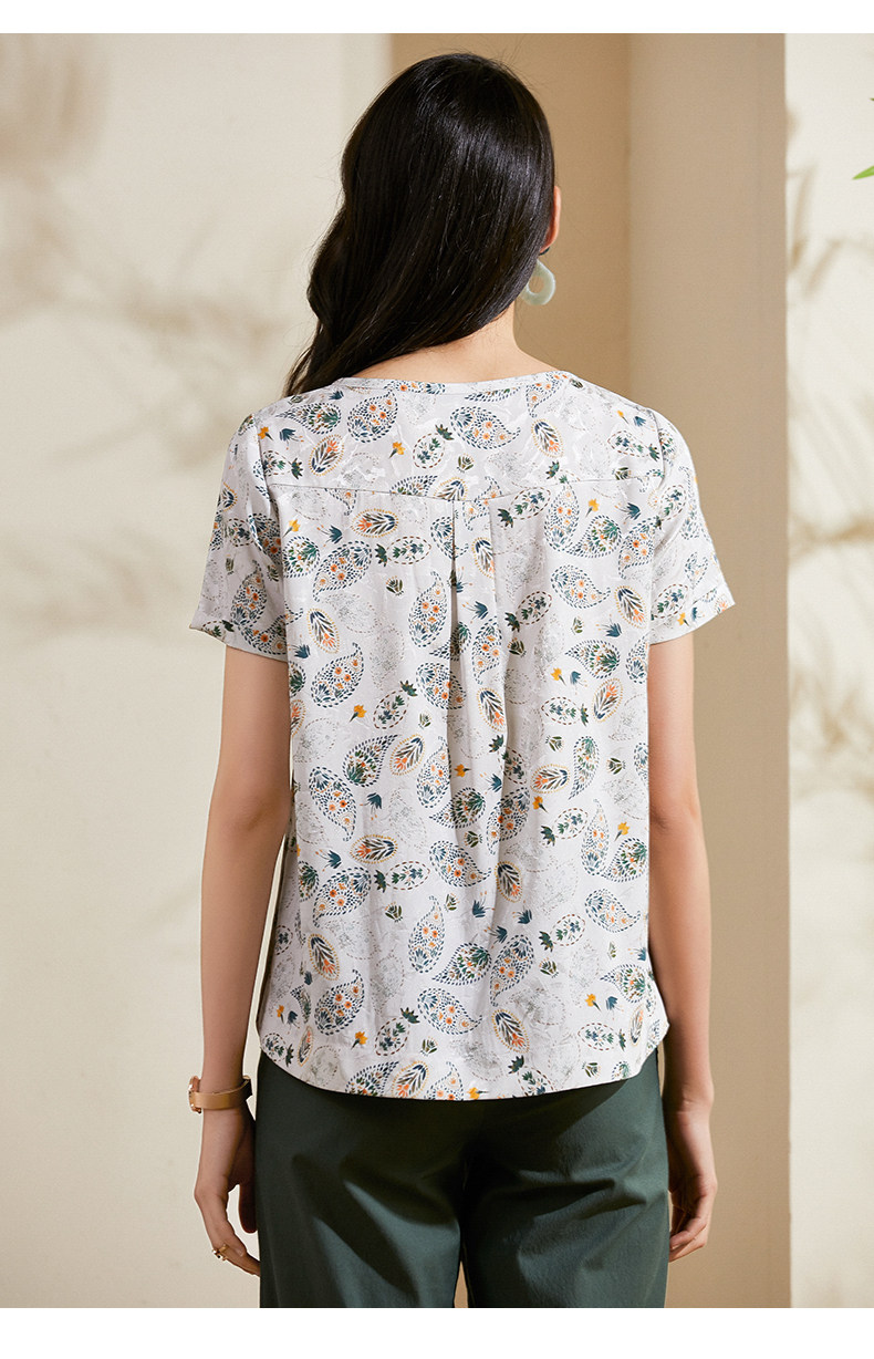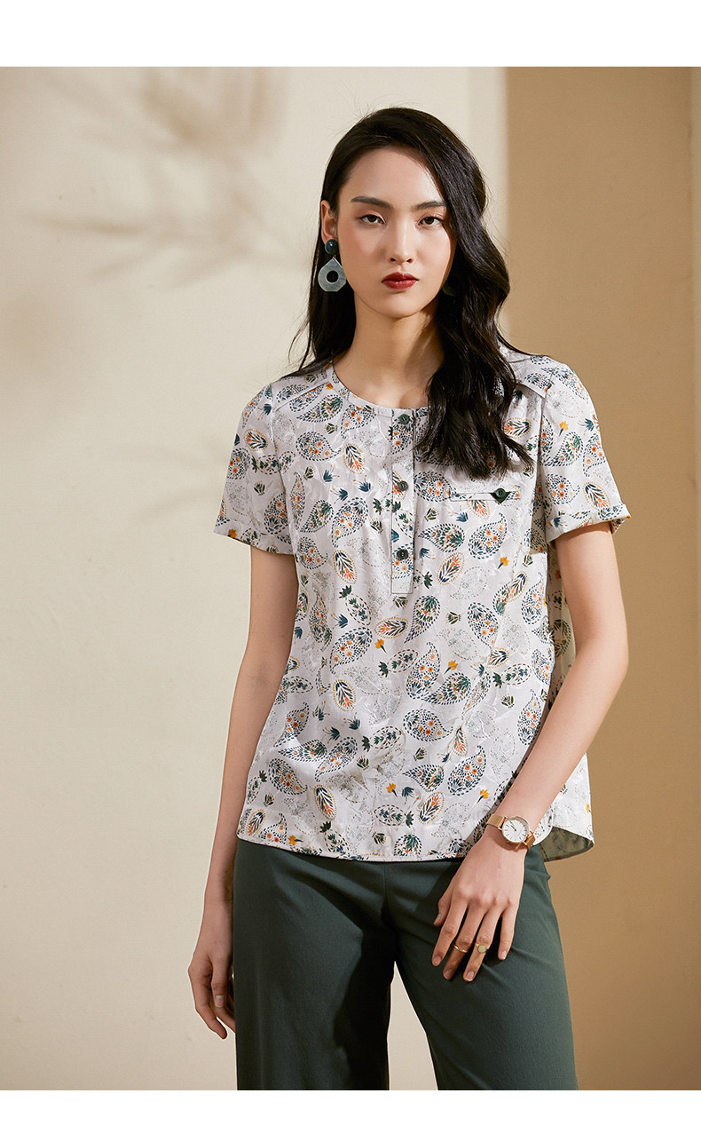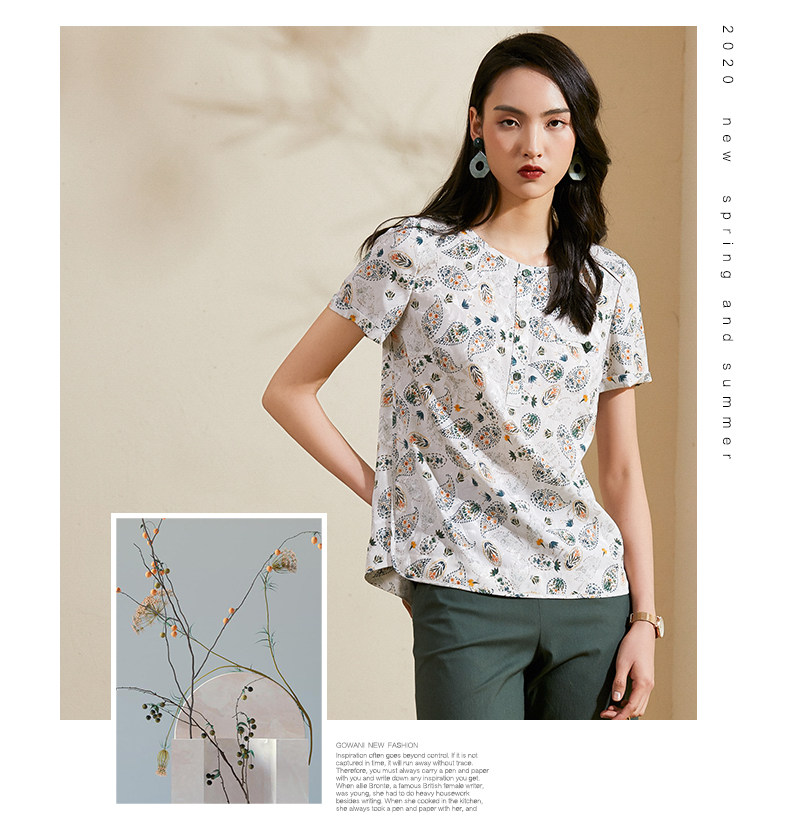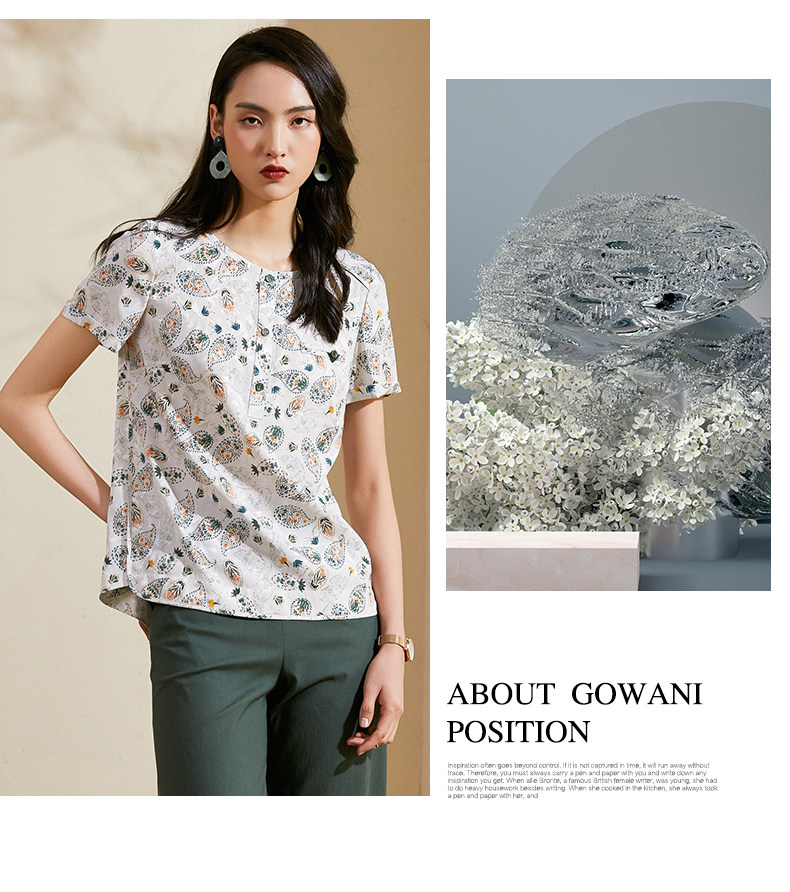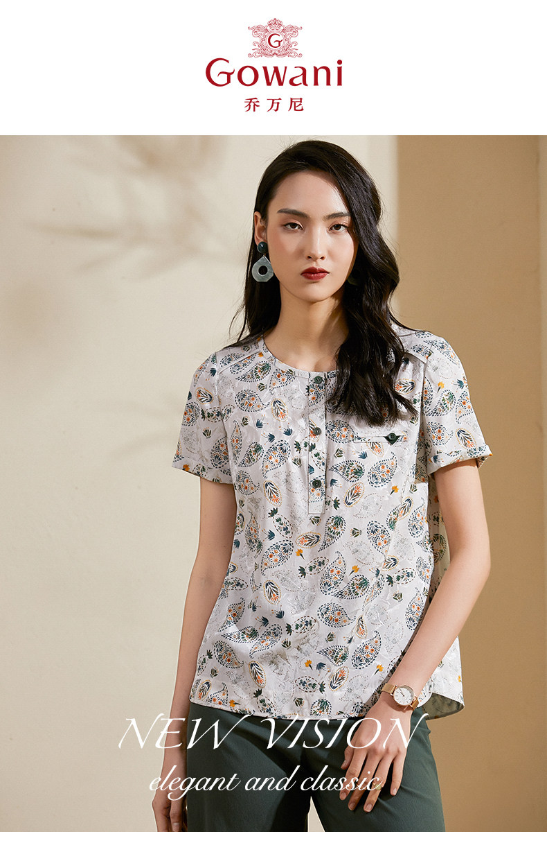 乔万尼桑蚕丝上衣女夏新款印花圆领短袖真丝衬衫宽松显瘦洋气衬衣ES2C133