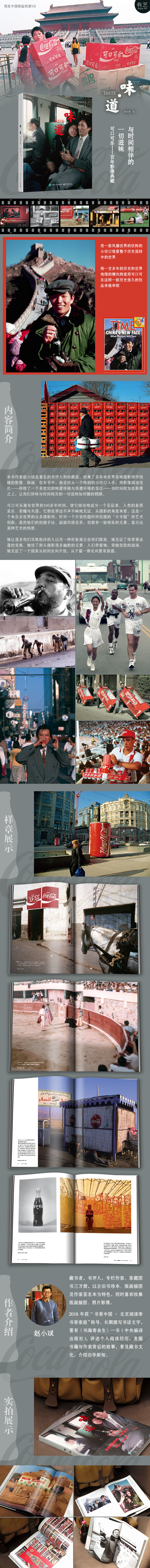 本书有着独特的视角和编辑逻辑:通过一款风靡世界的饮料的小切口观看整个历史流转中的世界。将一百多年的历史和世界地理的横向跨度用可口可乐这样一款历史悠久的饮品来做串联。本书作者赵小斌是著名的书评人和收藏家,收集了多年来世界各地摄影师所拍摄的影像、版画。在本书中,他尝试从一个特别的小切口入手用,用影像阅读变化——持续了一个多世纪的味蕾体验与周遭环境的变迁——当时间附加在影像之上,让我们体味与时间相关的一切滋味如何辗转腾挪。可口可乐遍布世界的100多年时间,使它被动地成为一个见证者,人类的喜怒哀乐、荣耀与失落,它都在旁边不声不响地见证。从摄影的角度来看,这是一个来自全世界的众多摄影师,针对一个开放性题材所拍摄的“大专题”和艺术创新,虽然他们的拍摄手法、画面风格各异,但都有一脉相承的元素,显示出某种艺术的特质。