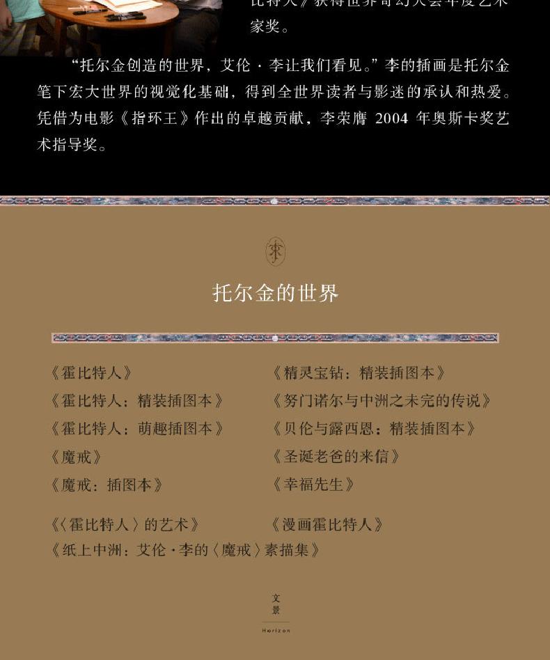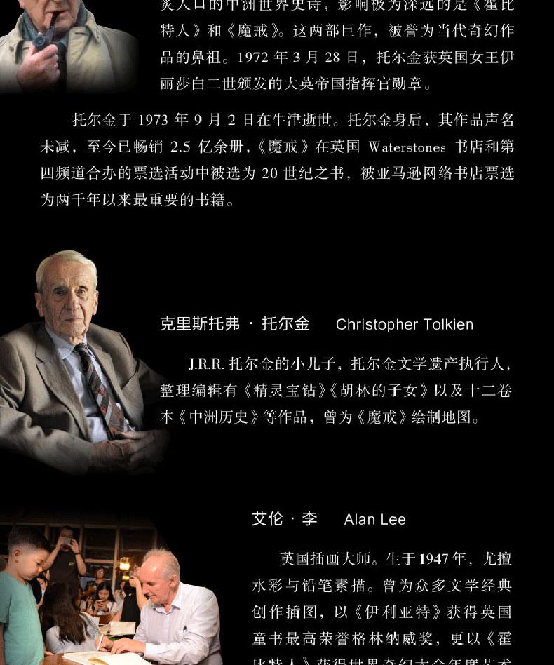 托尔金创造的世界,艾伦·李让我们看见。”李的插画是托尔金笔下宏大世界的视觉化基础,得到全世界读者与影迷的承认和热爱。凭借为电影《指环王》作出的卓越贡献,李荣膺2004年奥斯卡*佳艺术指导奖。