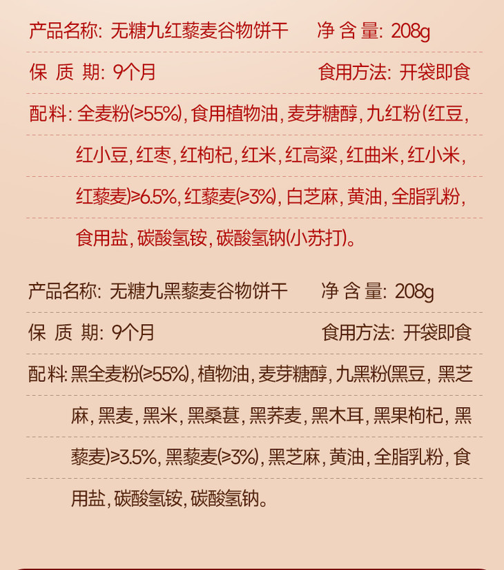 【养脾胃 超值加赠 】红谷林无糖山药猴头菇饼干/9黑藜麦/9红藜麦谷物饼干 208g/袋