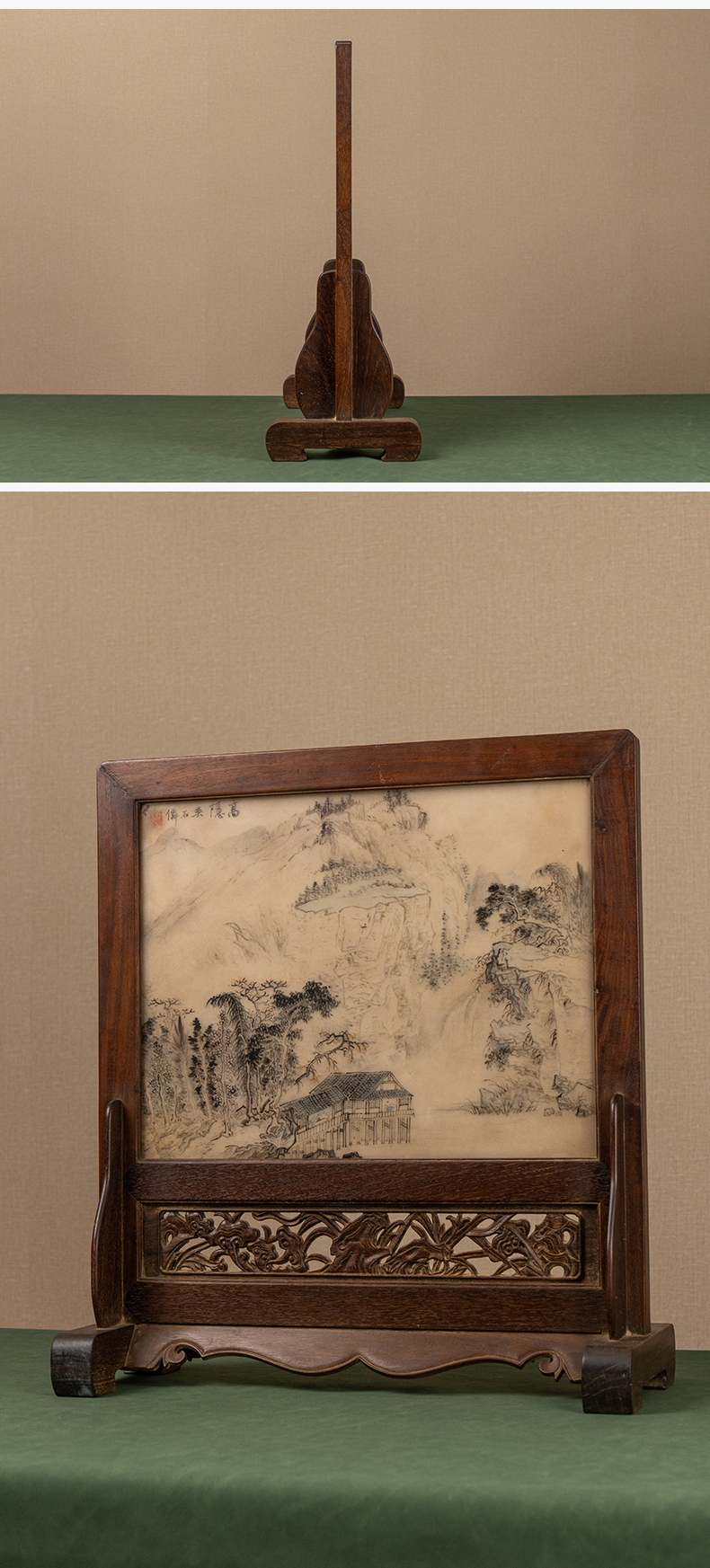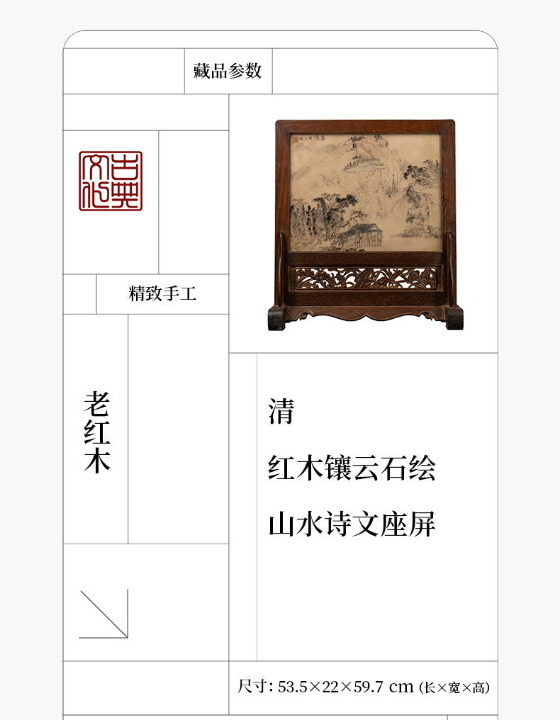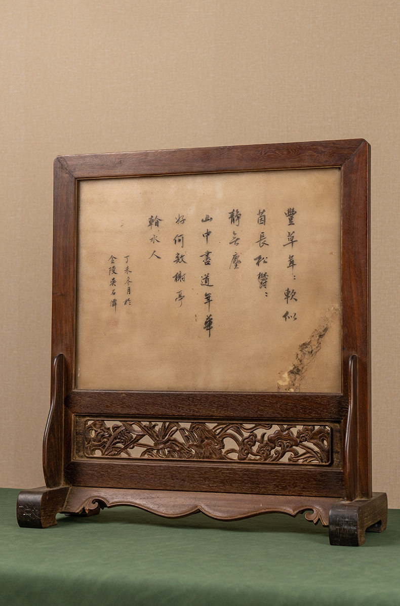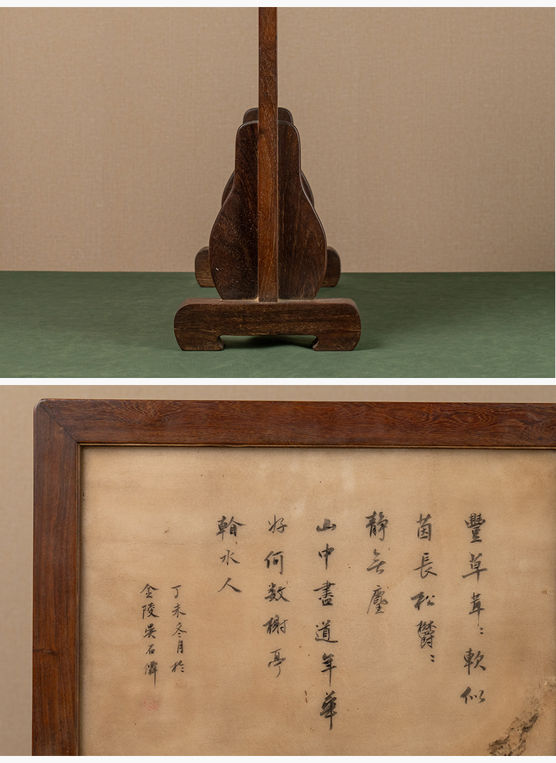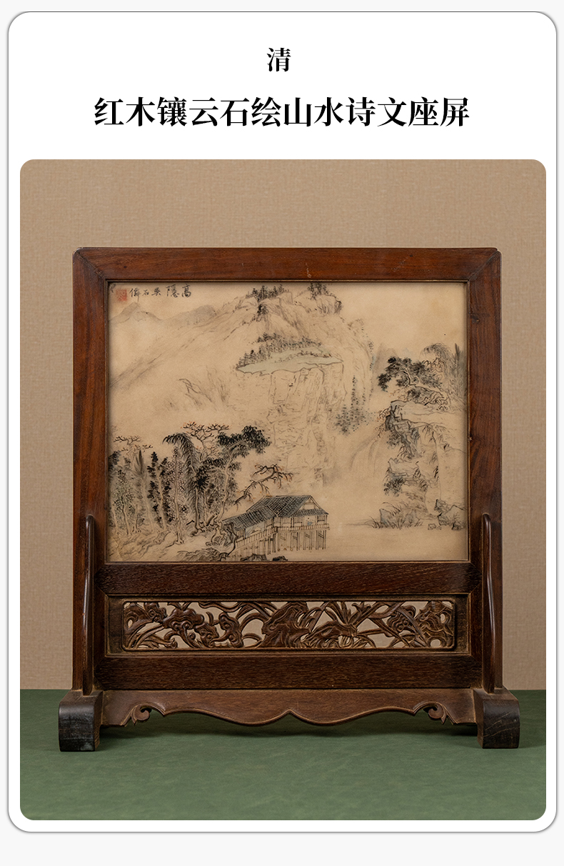 清 红木镶云石绘山水诗文座屏