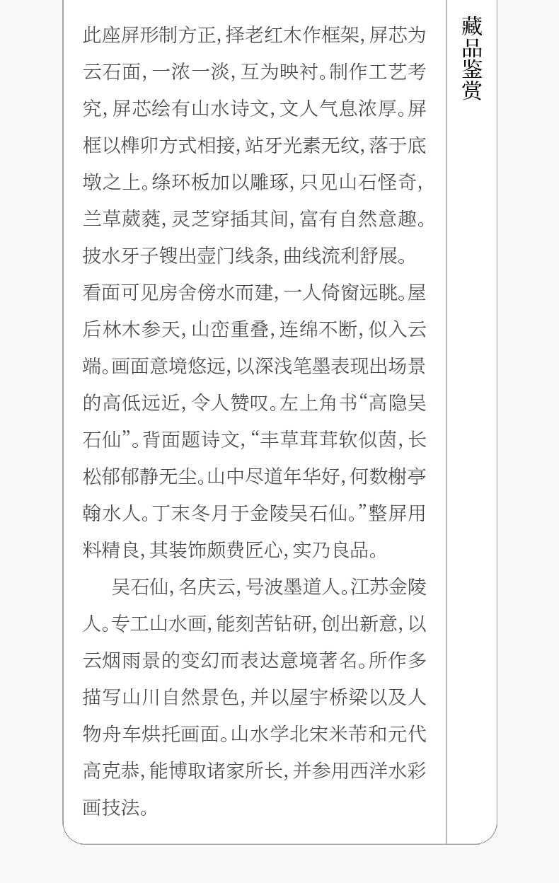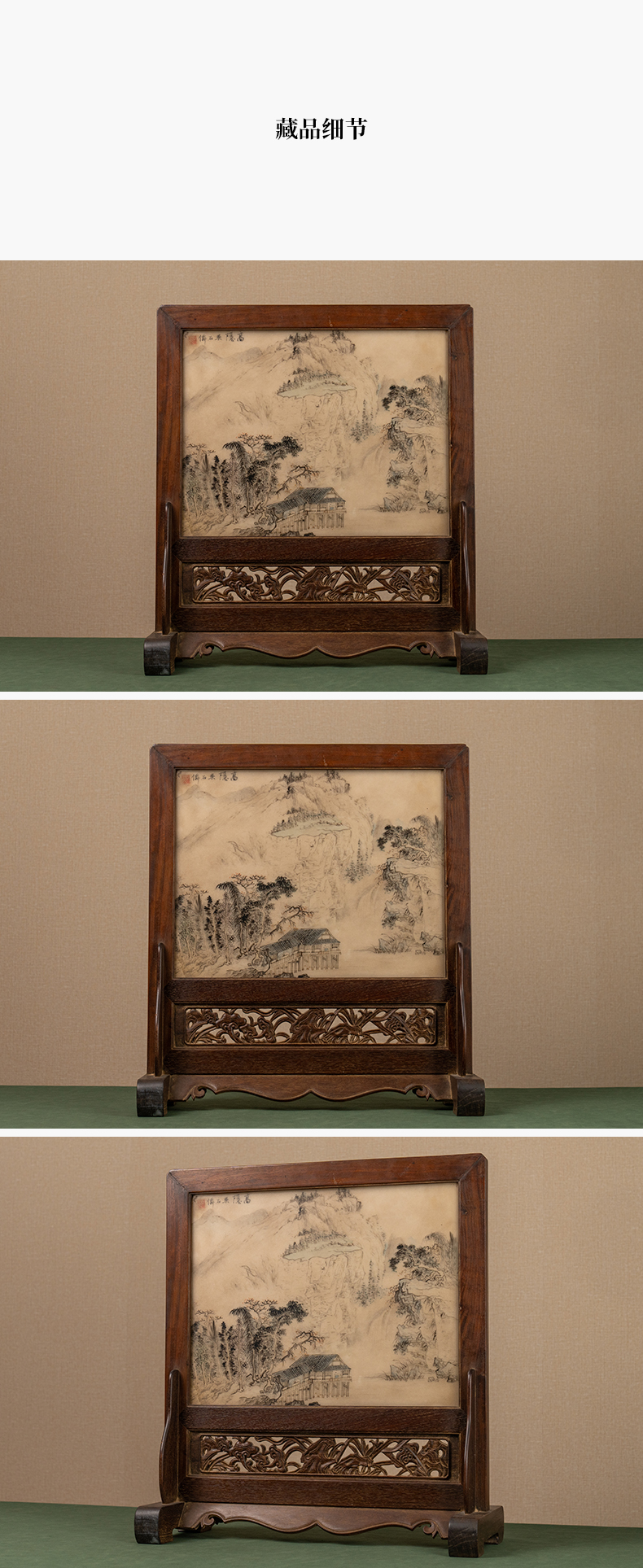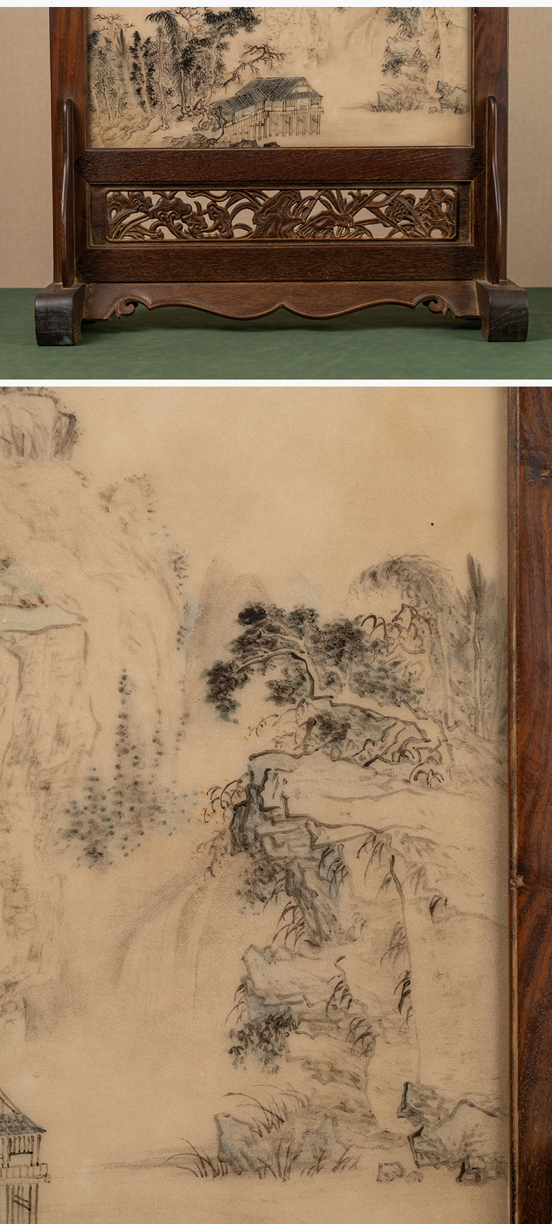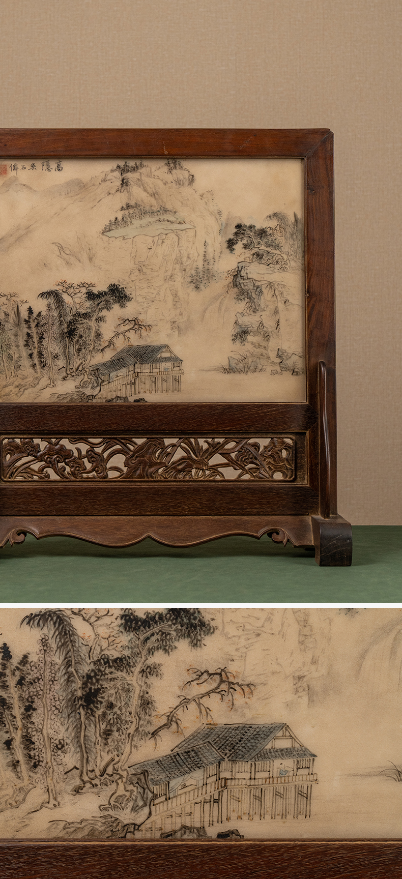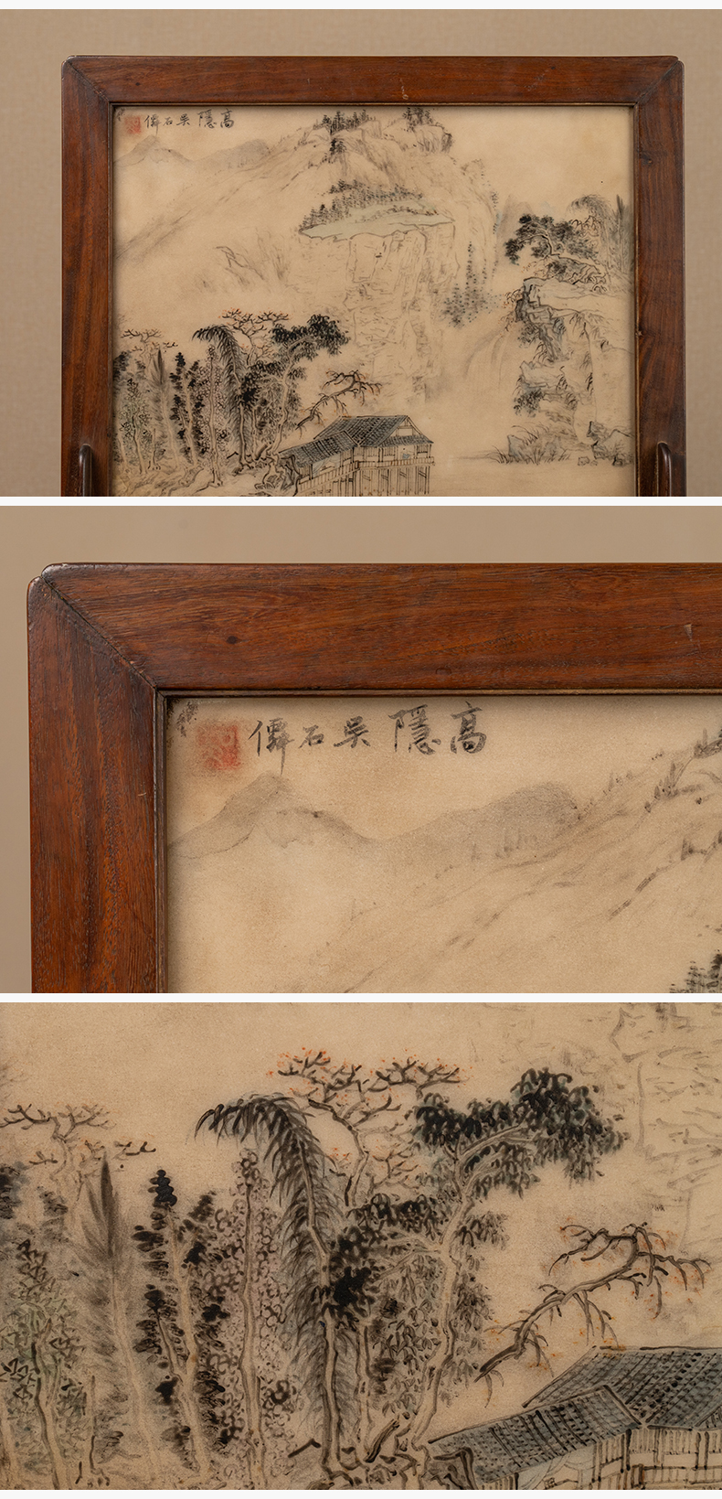 清 红木镶云石绘山水诗文座屏