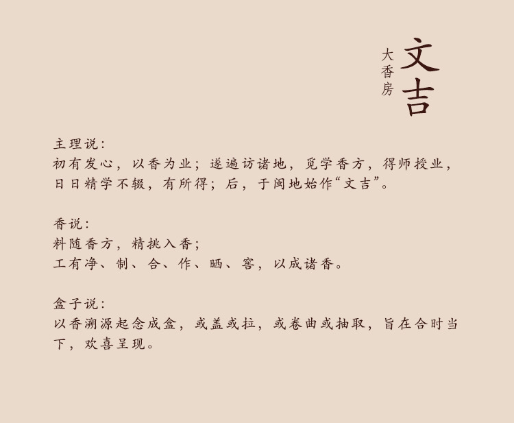 初有发心,以香为业;遂遍访诸地,觅学香方,得师授业,日日精学不辍,有所得;后,于闽地始作“文吉”。