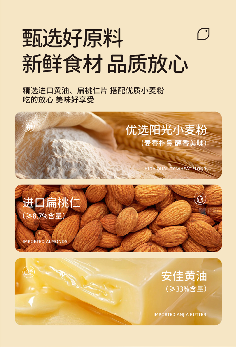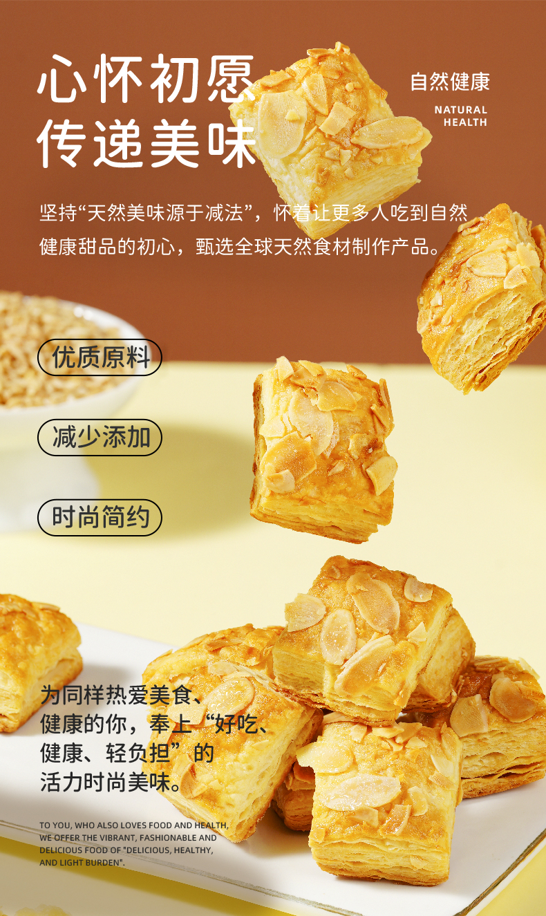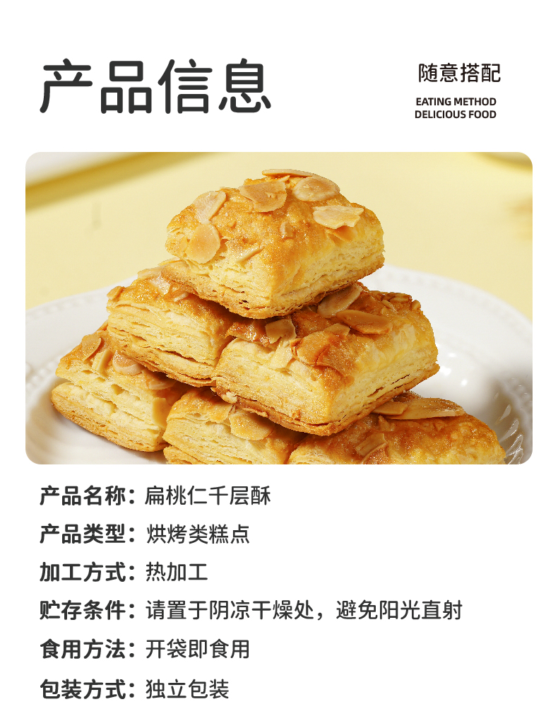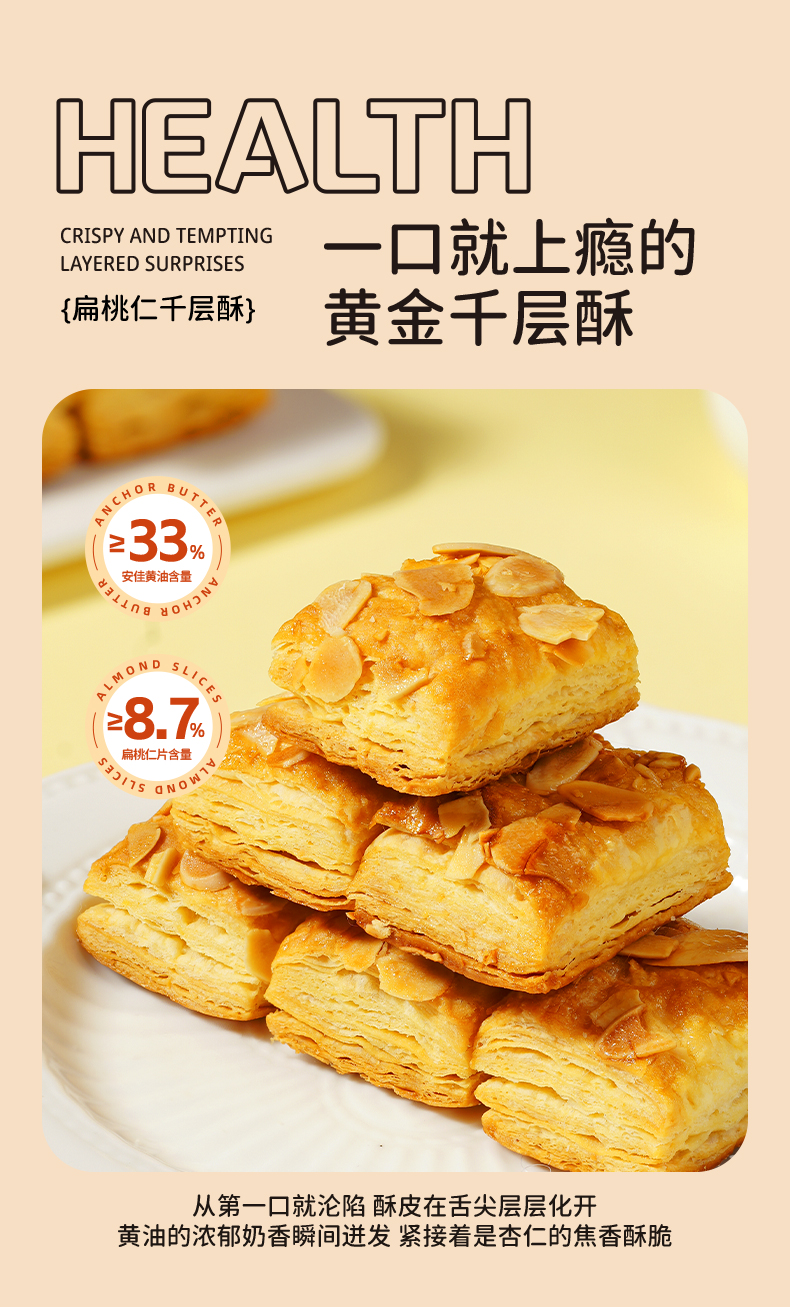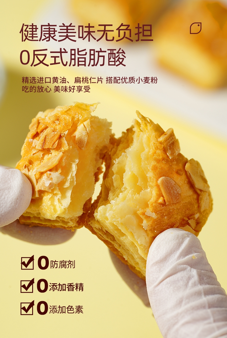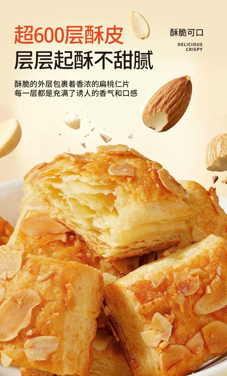 扁桃仁千层酥 慢火烘烤 非油炸 采用进口安佳黄油 超600层酥皮 层层起酥 不甜腻