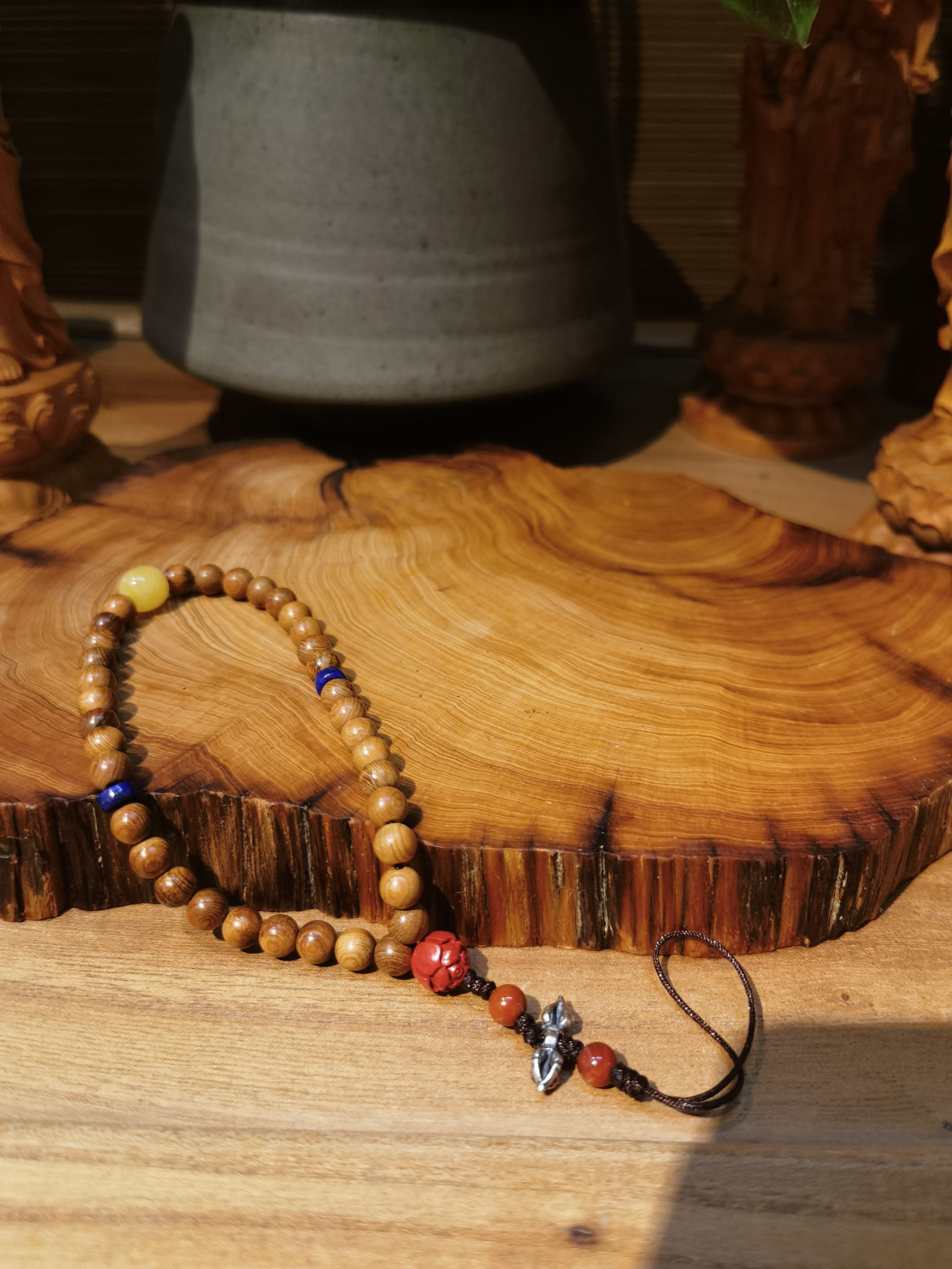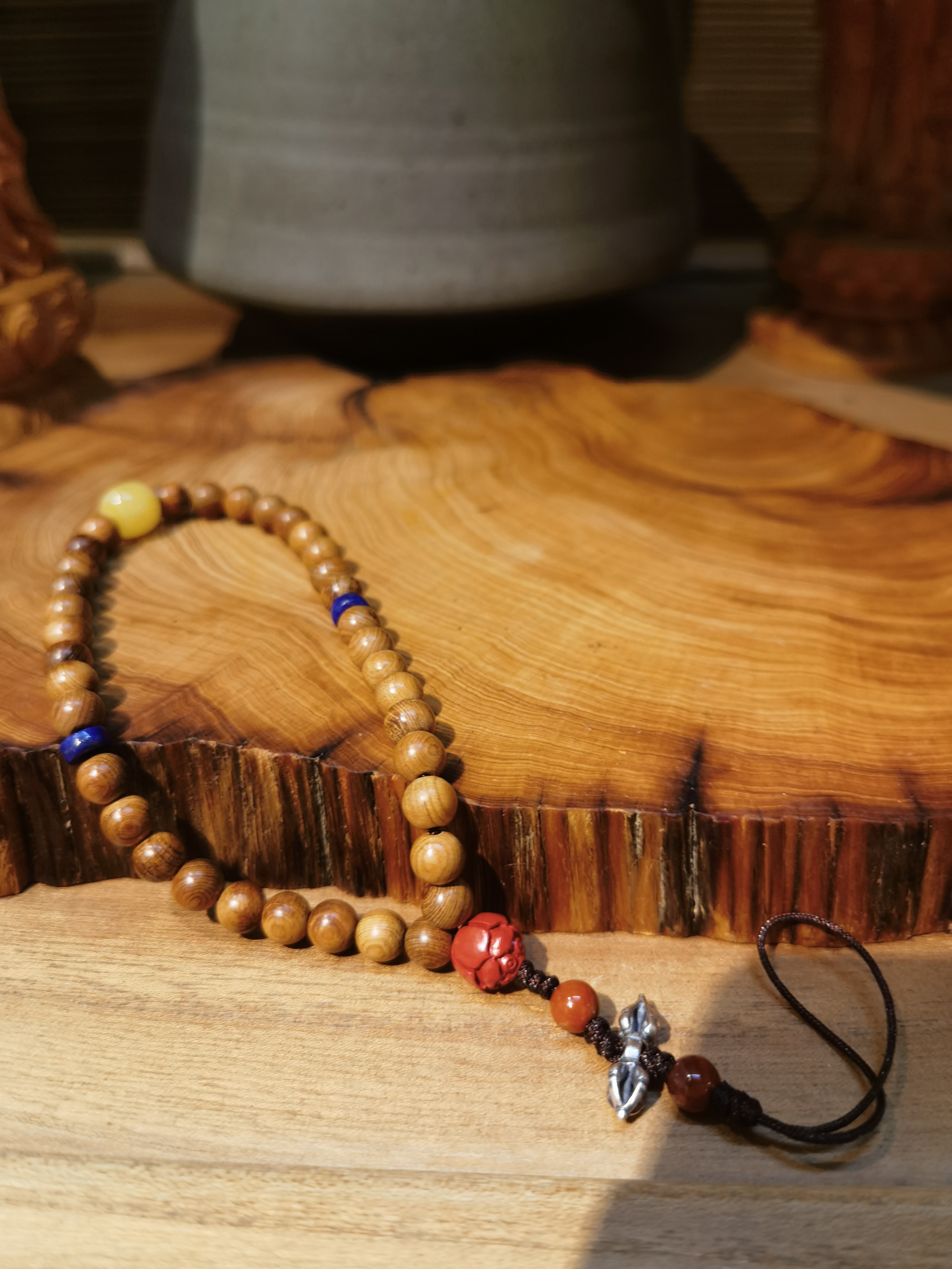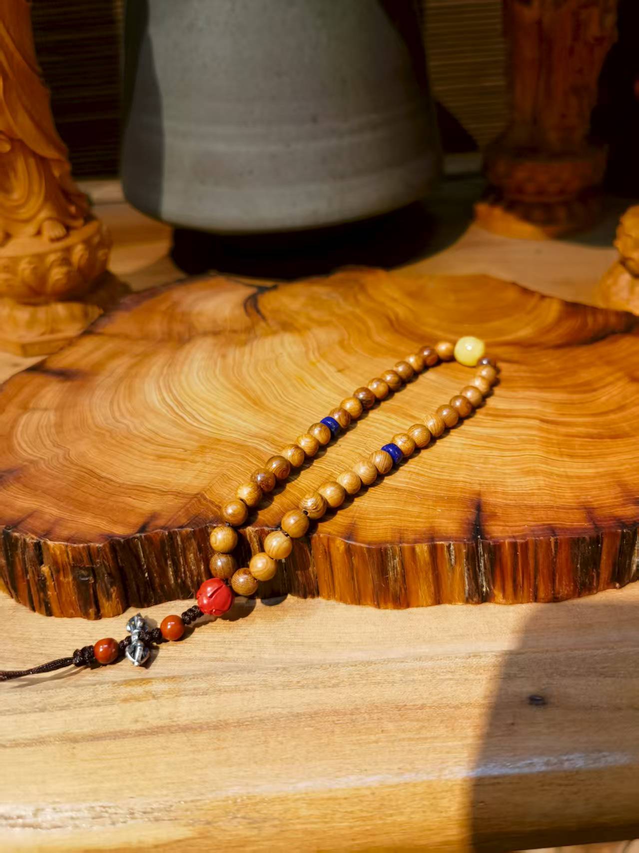 珠子数量:36颗崖柏珠+1颗蜜蜡+2颗青金石隔片+1朱砂莲花珠+2颗南红+1个藏银金刚杵