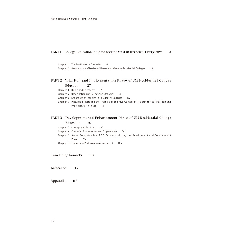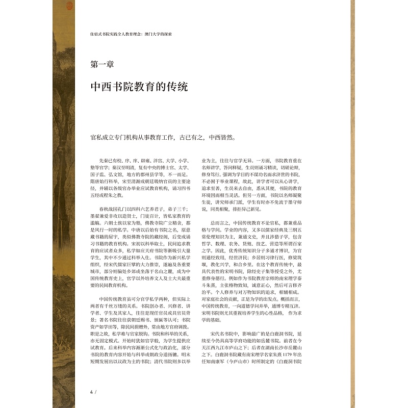 本书旨在说明澳门大学住宿式书院系统的源起、演进、愿景。 澳门大学住宿式书院参考了哈佛耶鲁等美国大学的住宿型书院 及牛津剑桥的书院 ,同时亦继承了中国宋明书院的精神。 澳门大学一直秉承"仁义礼知信"的校训,本科教育推行融合专业、通识、研习及社群教育的"四位一体"教育模式,并透过此独特的教育模式以及作为社群教育重点的住宿式书院系统,达致为学生提供全人教育的目的。 澳大的教育使命,是培养澳门、国家及世界发展所需之具家国情怀、国际视野、全球竞争力和有社会责任感的公民以及创新型的人才。