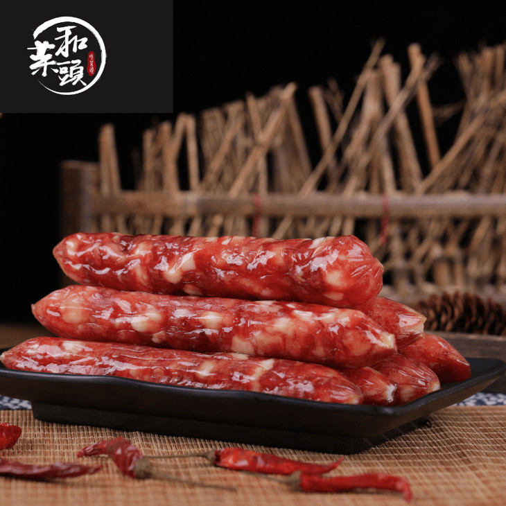 甜味香肠的制作严格遵守传统工艺,坚持让香肠自然风干晾晒1个月,同时使用当地二龙山的山泉水,不腻不咸、鲜香美味。