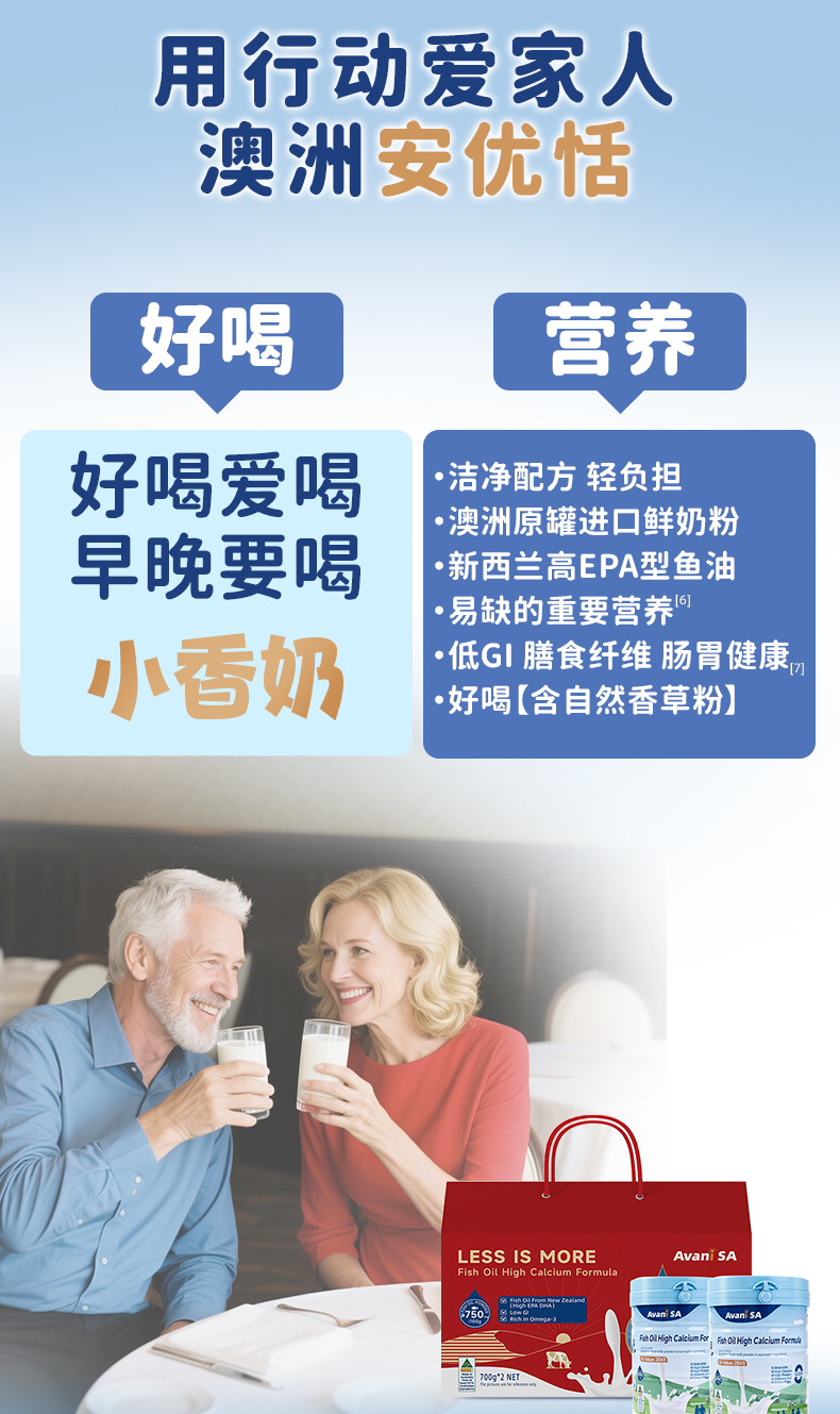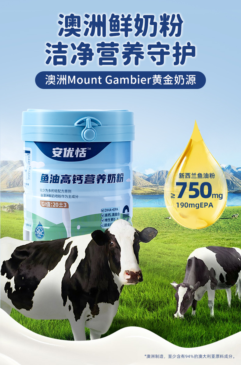 下单赠限量智能保温杯!【澳洲原罐进口】安优恬鱼油高钙营养奶粉 700g/罐 高蛋白低GI值