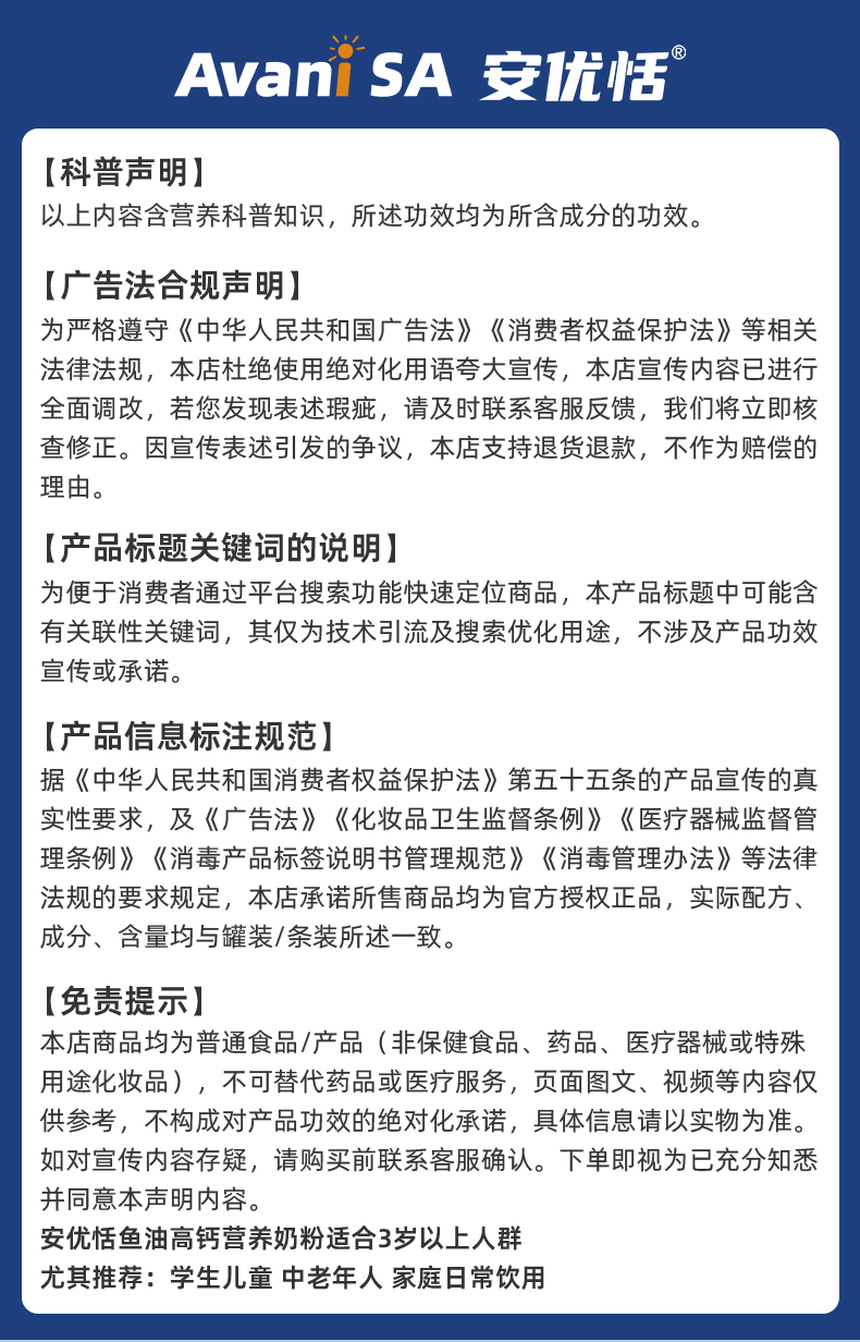 【品名】安优恬鱼油高钙营养奶粉 【规格】700g/罐 【保质期】24个月 【储存方法】请置于阴凉干燥处,避免阳光直射