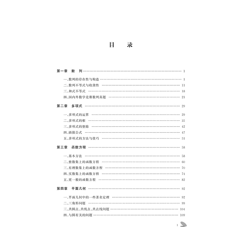 本书以高中数学竞赛大纲为依据编写,内容包括集合函数、数列、不等式、三角函数、向量等内容,着重介绍解决问题的思想方法,并配有适当的课外练习供学生练习。