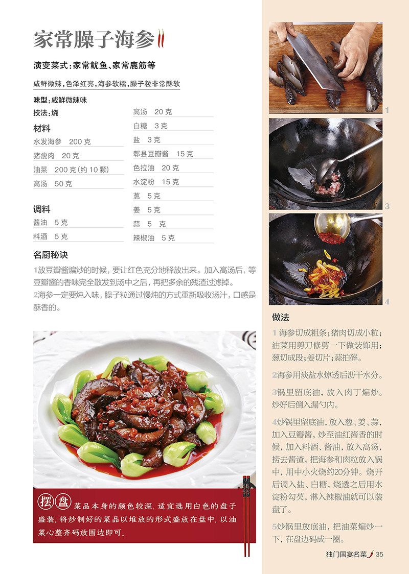 独门国宴名菜、经典凉菜、传统热菜、风味小吃,从特点到做法,从摆盘到名厨秘诀,都一一呈现,尤其是名厨秘诀,更是凝结着郝振江大厨多年来的心血和经验。