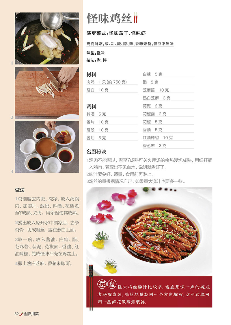书中不仅菜品做法介绍详细清晰,原材料方便购买,郝大厨还跟广大读者分享了近200条制作川菜的诀窍,除此之外,《金牌川菜》还详细地介绍了每道菜的摆盘要点,刀工要点,菜的咸、麻、辣、甜、酸等口味的直观标示,使读者一目了然。