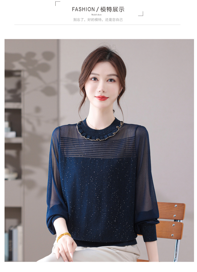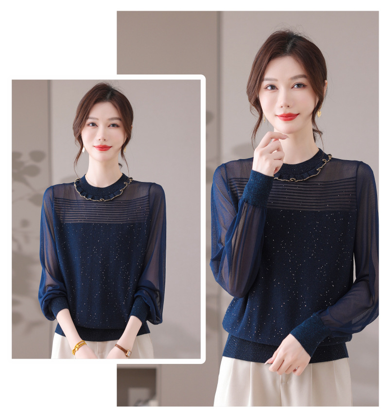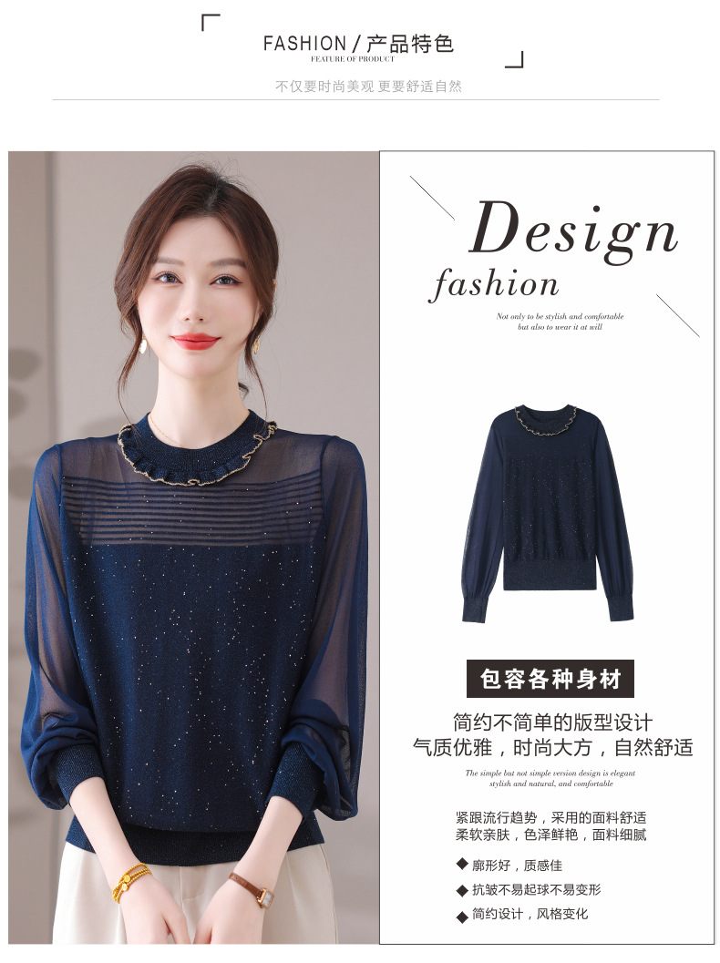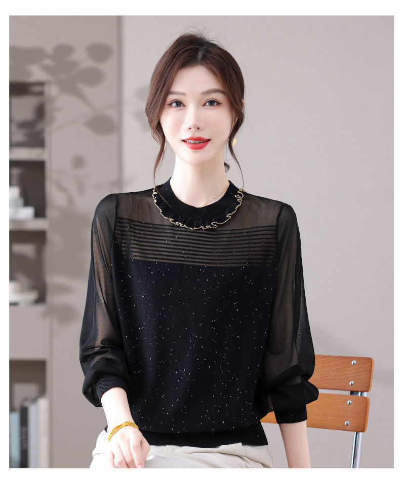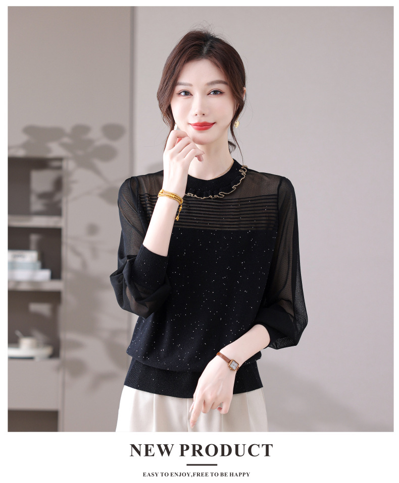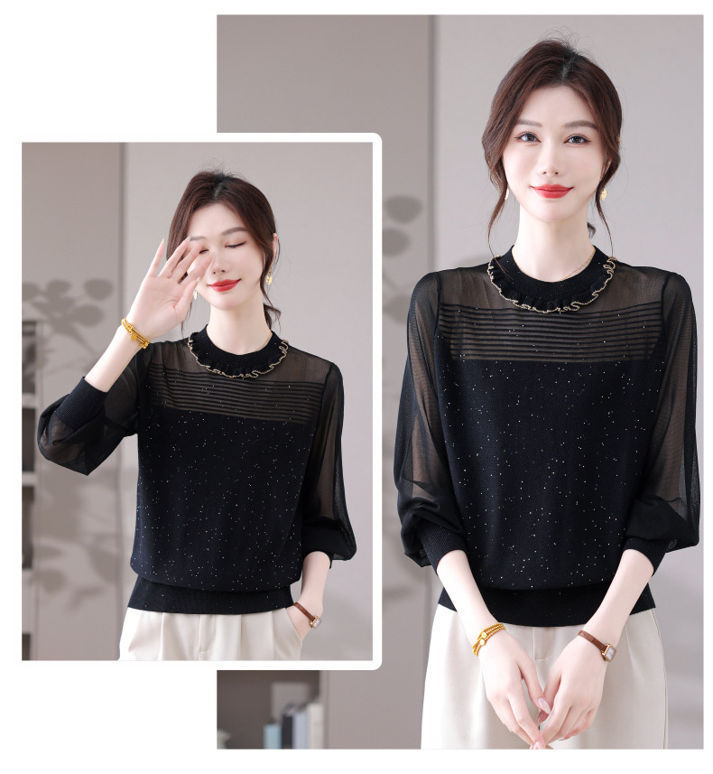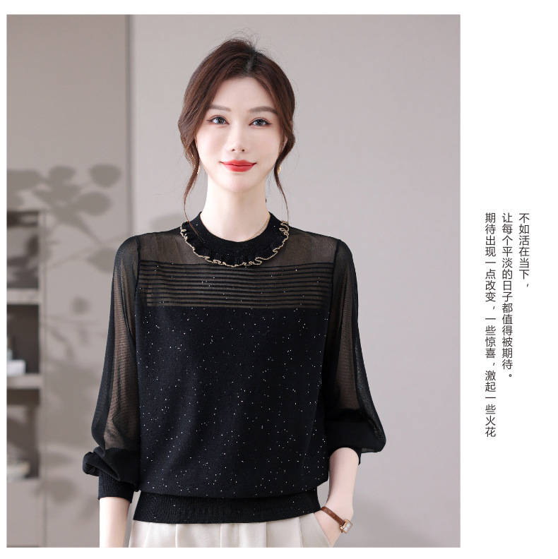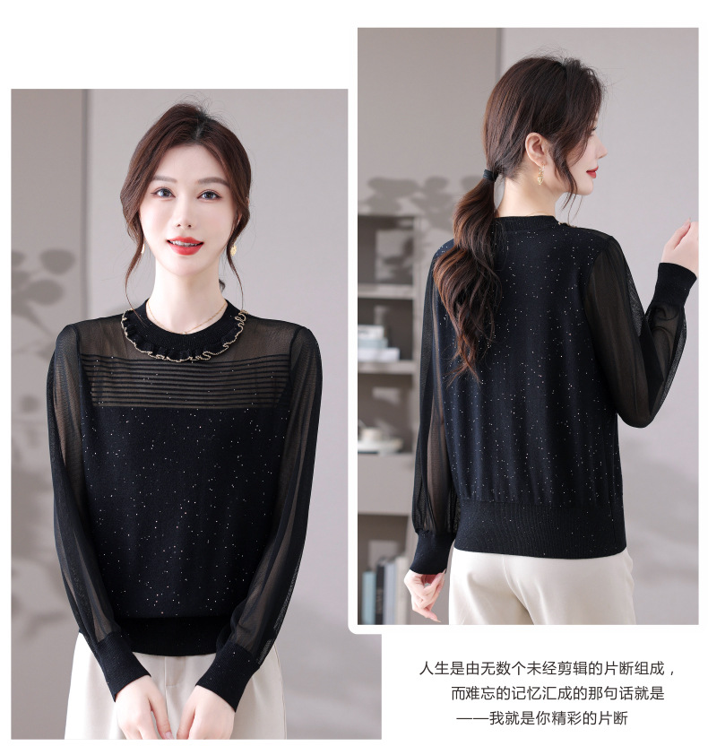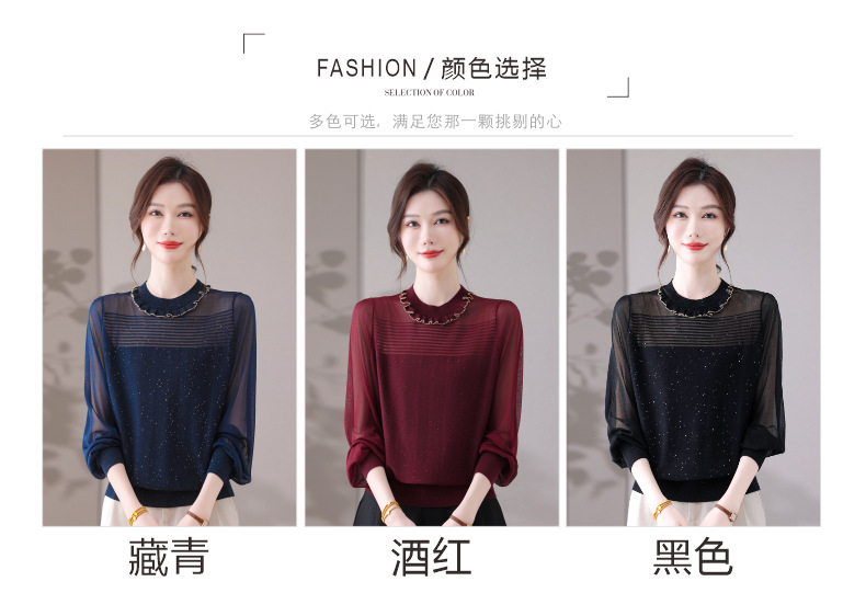 针织衫女装2025春秋新款网纱拼接长袖T恤女宽松显瘦打底衫上衣薄