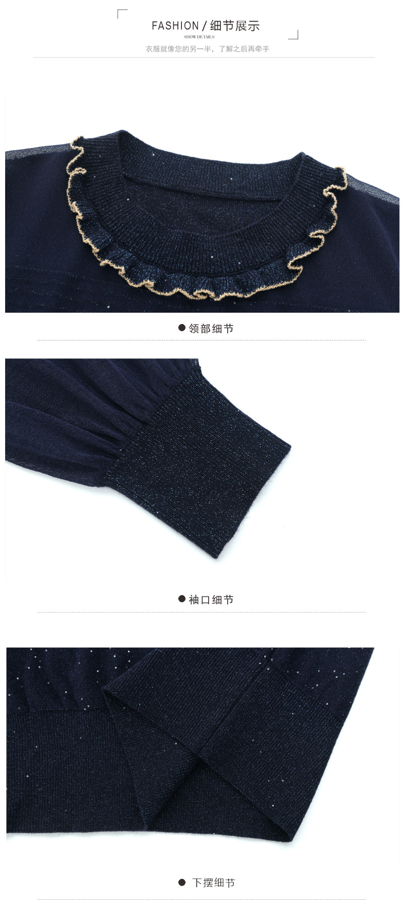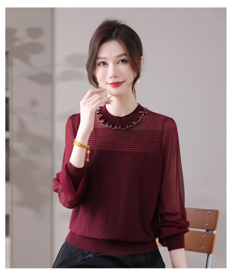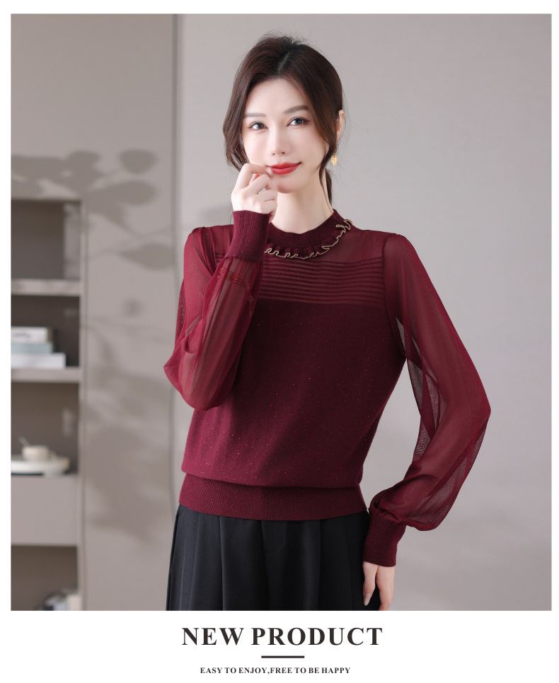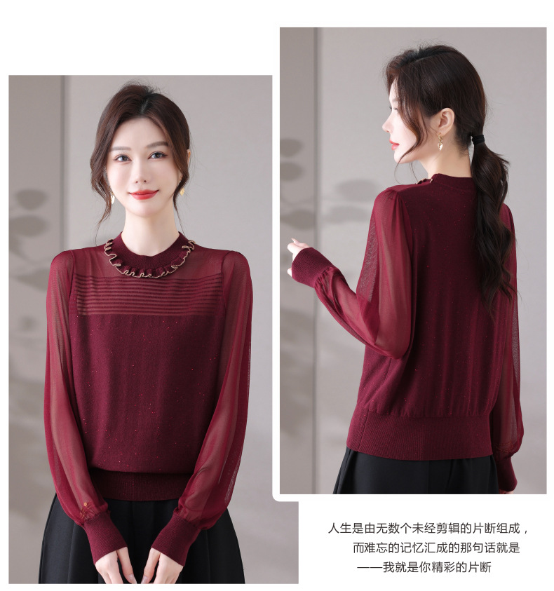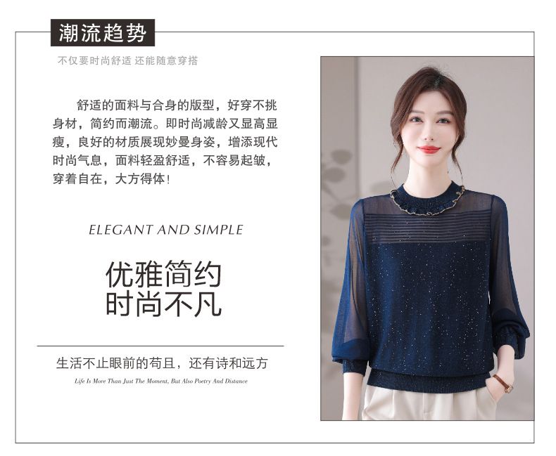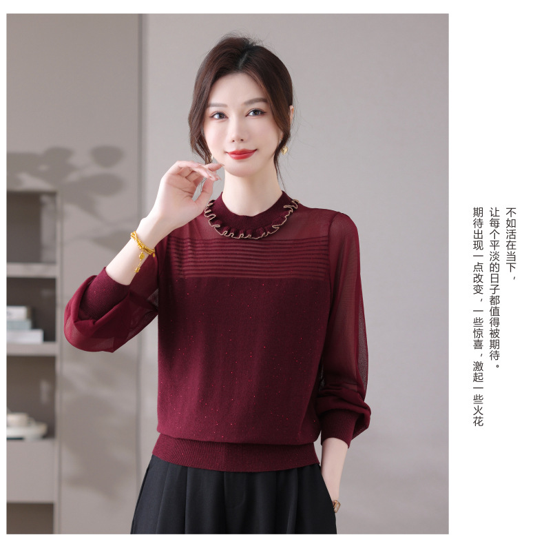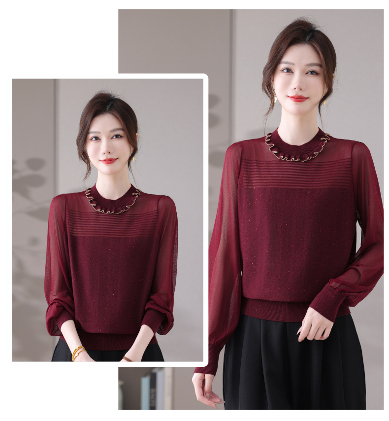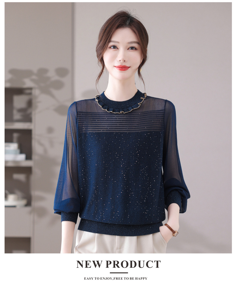 针织衫女装2025春秋新款网纱拼接长袖T恤女宽松显瘦打底衫上衣薄